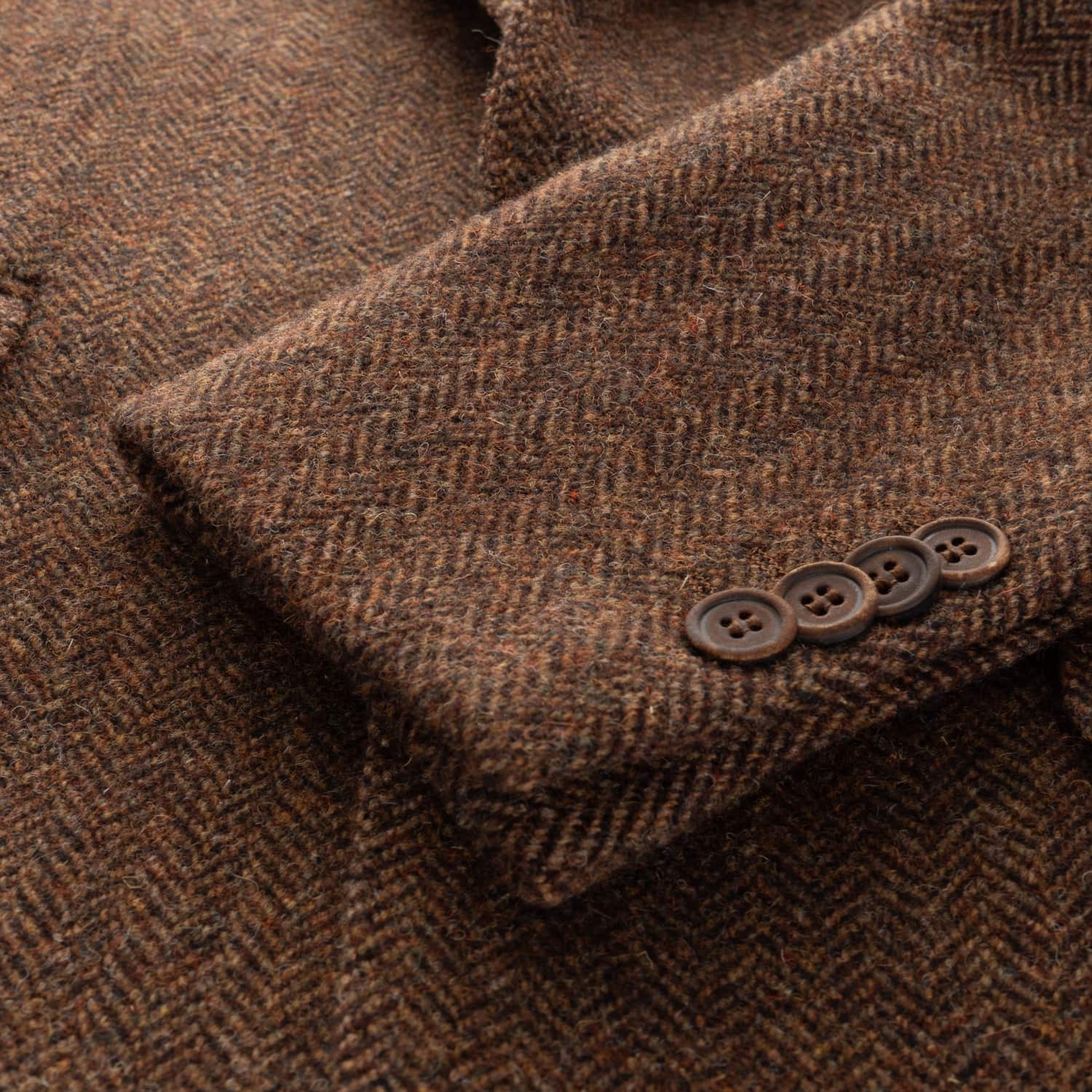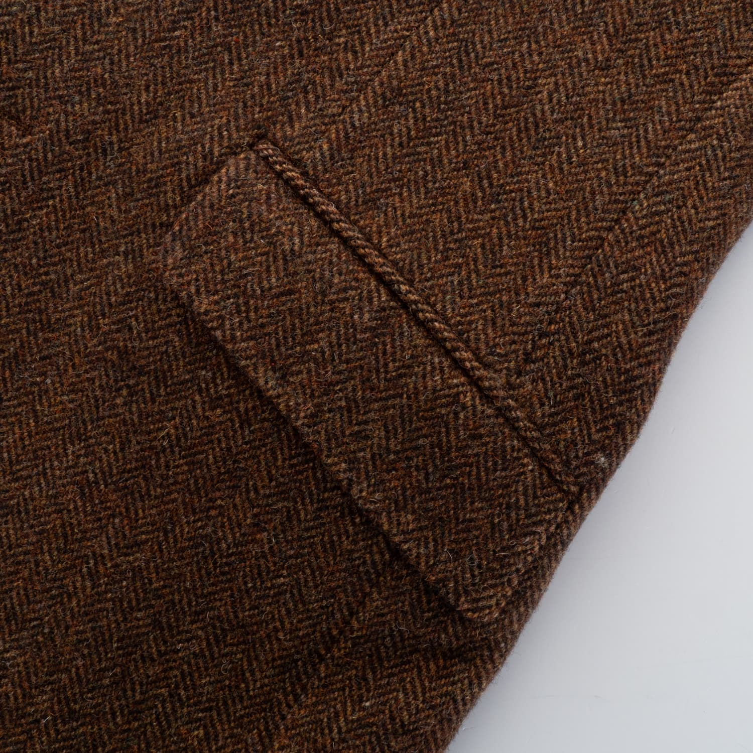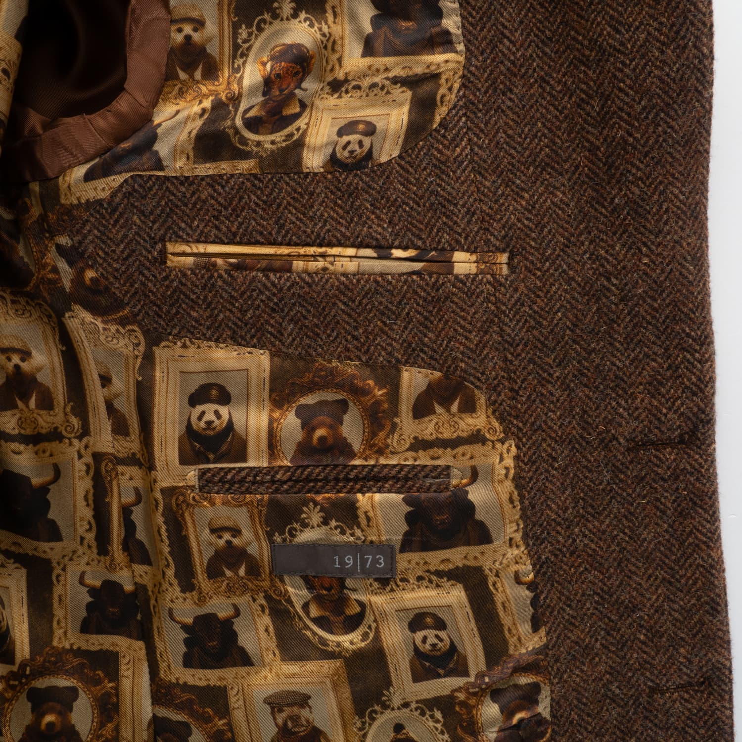 Pure virgin wool blazer from 1973, featuring three front pockets with flaps, a breast pocket, sleeve patches and three inside pockets. The light shoulder padding makes it comfortable to wear. The robust woollen fabric impresses with its firm texture and strong feel.