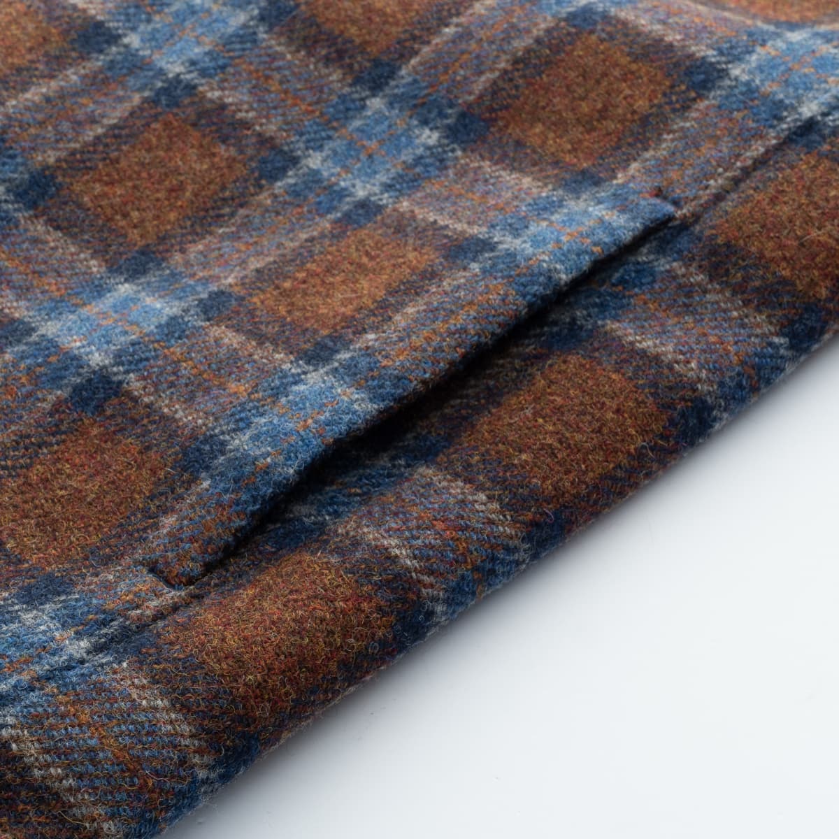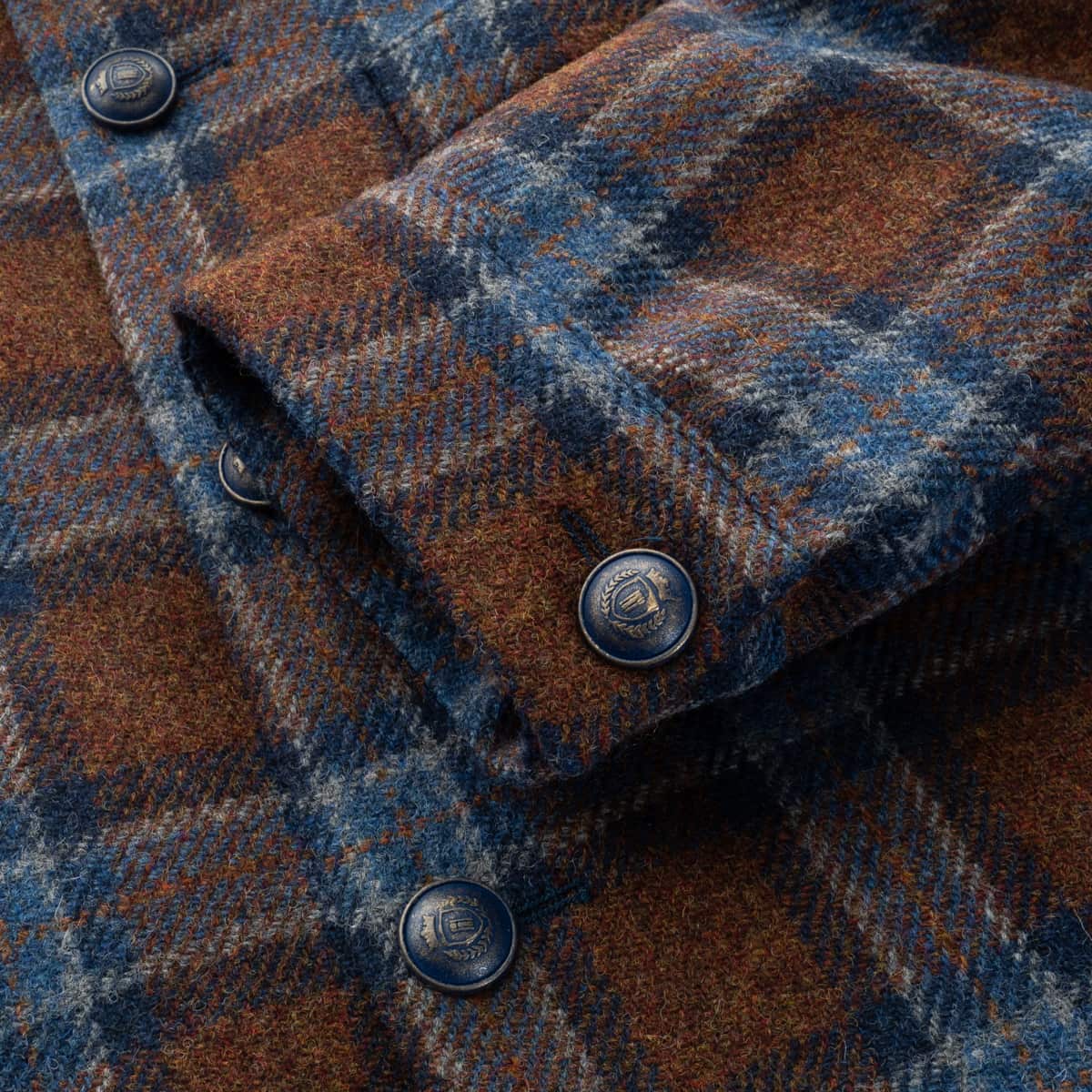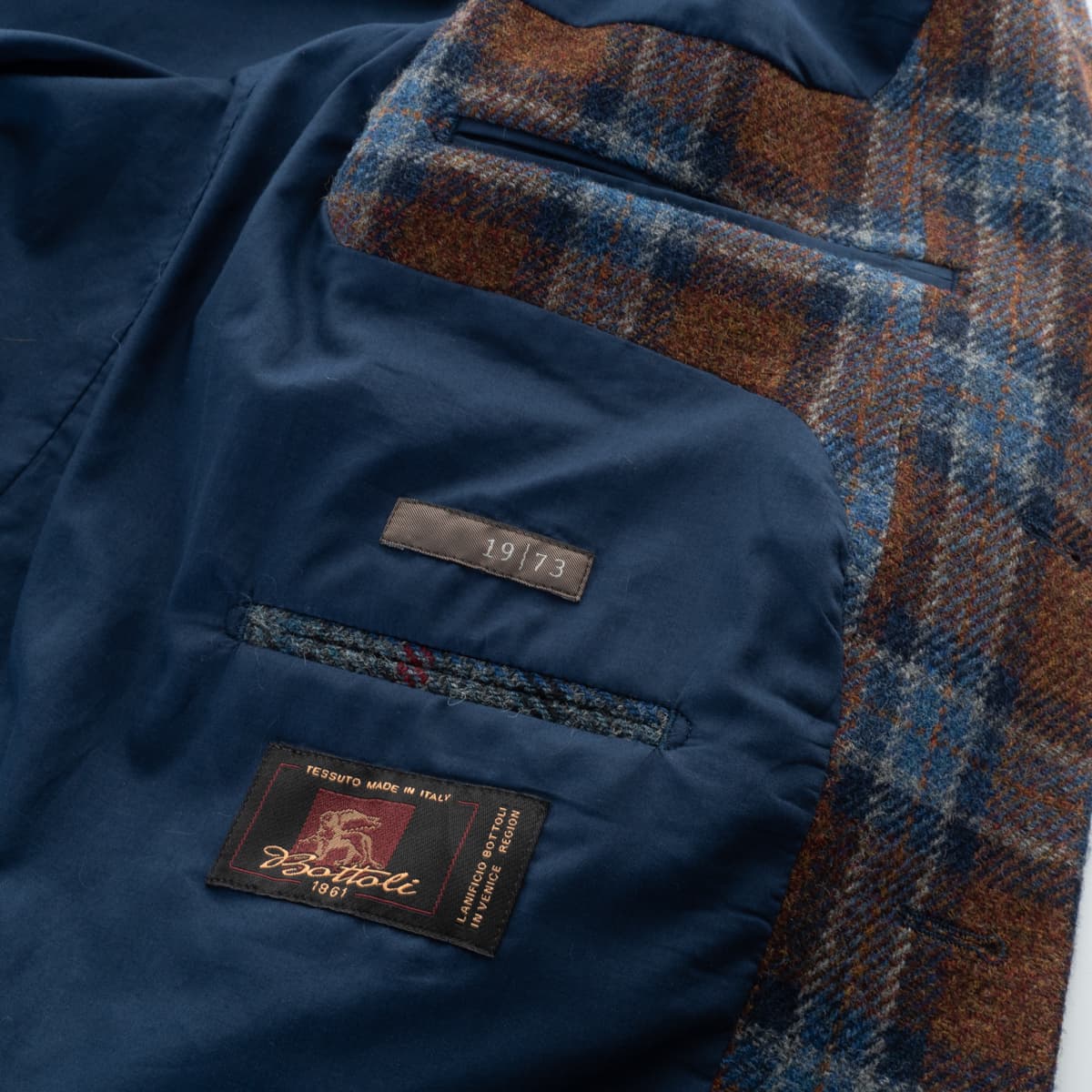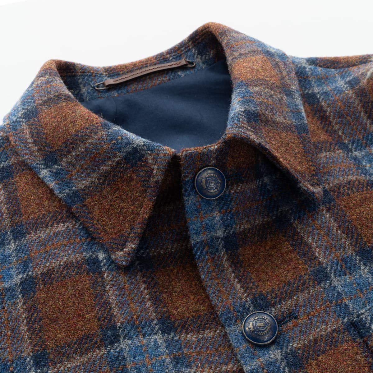 The “Garrett” jacket by 1973 merges classic textile craftsmanship with a modern silhouette. Made from 100 % wool (virgin wool), the checked fabric originates from the renowned Italian mill Botto Giuseppe. Its blue/brown pattern evokes a masculine and autumn-winter character. Fully lined with cotton on the body and viscose in the sleeves, the jacket offers structure and comfort. Details like the engraved buttons and clean design highlight its refined workmanship. A versatile piece balancing between overshirt and lightweight wool jacket.