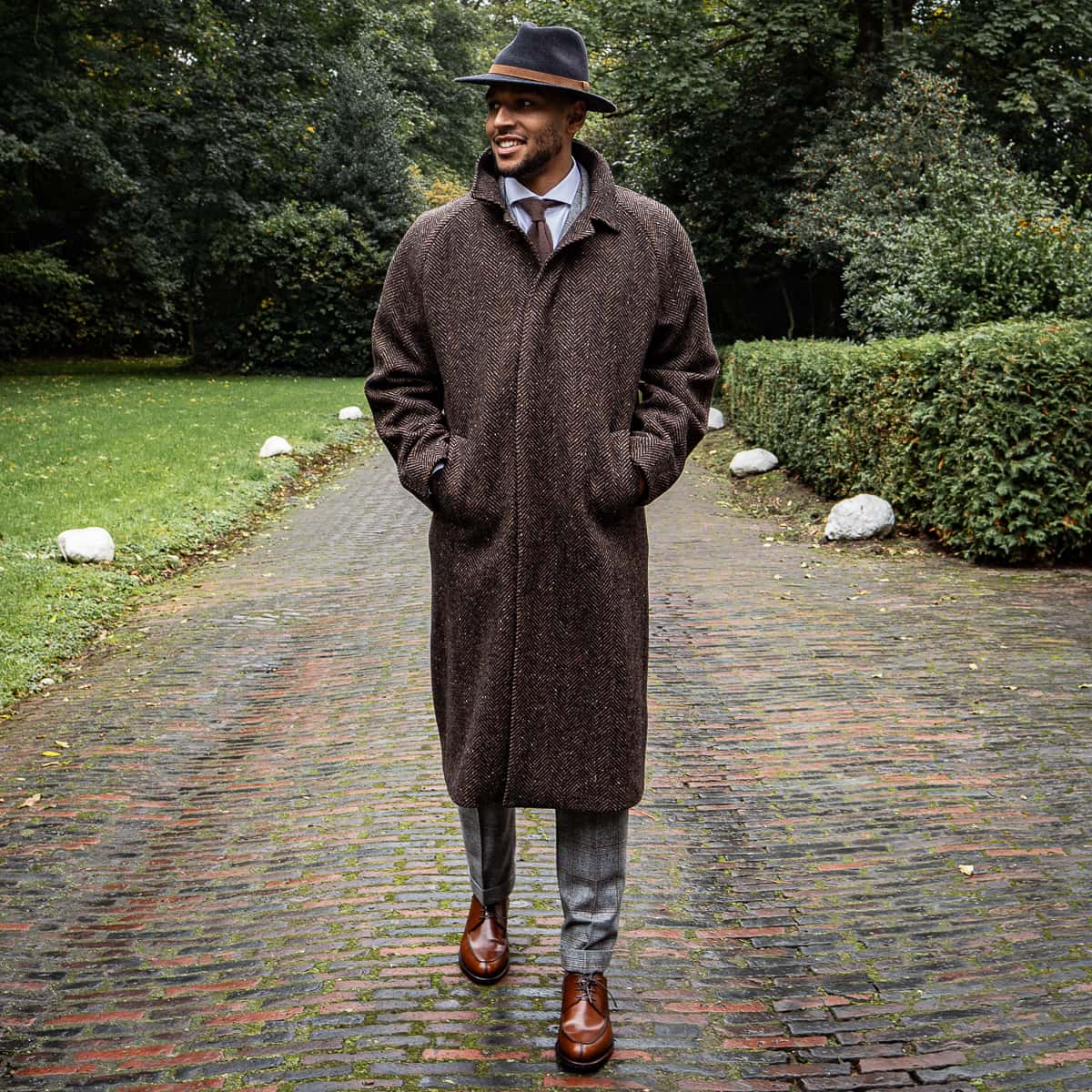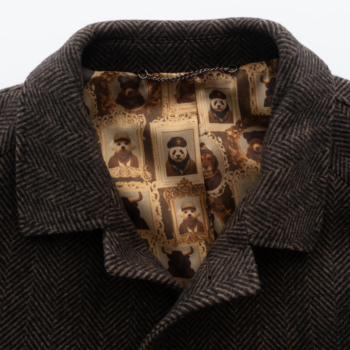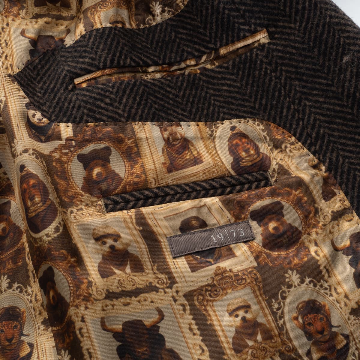 Elegant men’s coat by 1973 made from mid-weight herringbone wool (480 g/m²), crafted from 100 % wool. The classic brown/anthracite herringbone pattern lends the coat a rich texture and refined character. With a straight cut and raglan sleeves, it combines traditional tailoring with everyday comfort. The highlight is the humorous animal-portrait lining – a signature feature of the 1973 label. A coat with personality that bridges timeless craftsmanship and playful design.