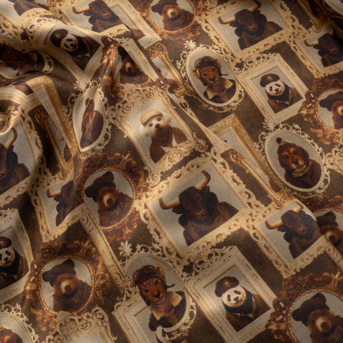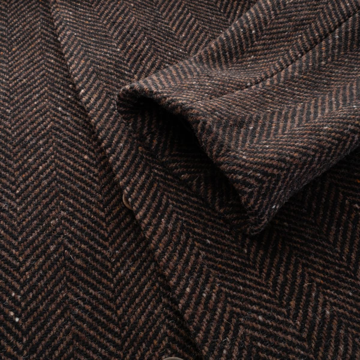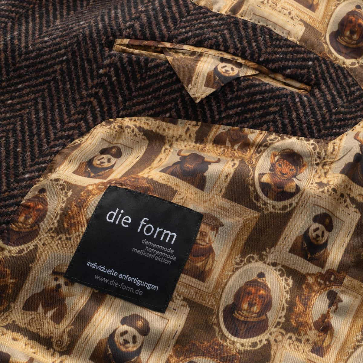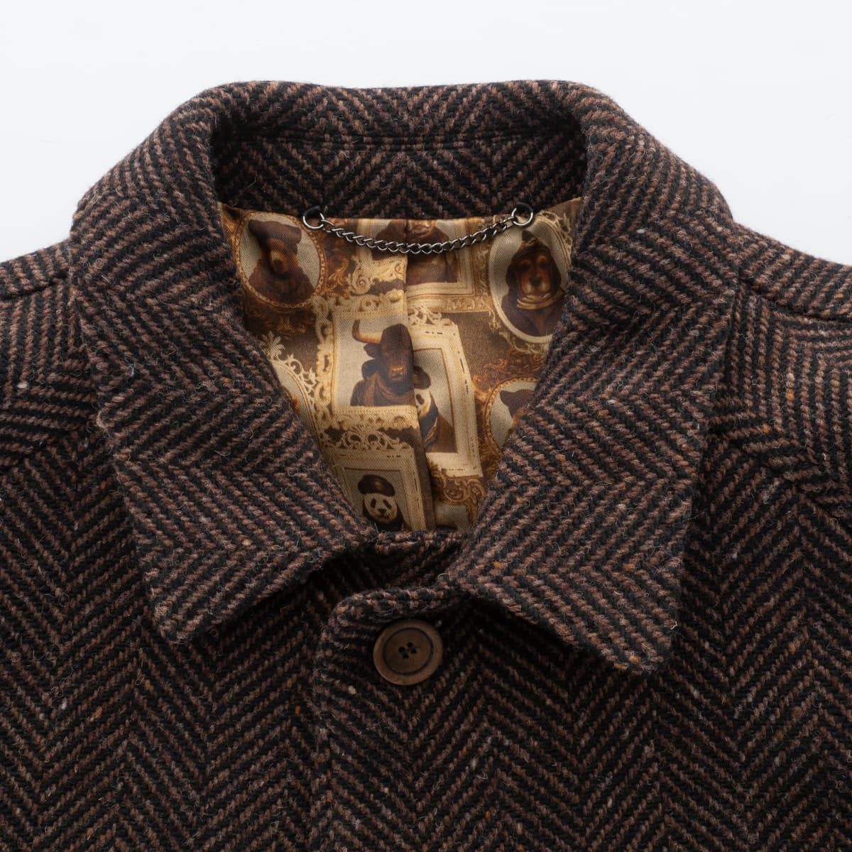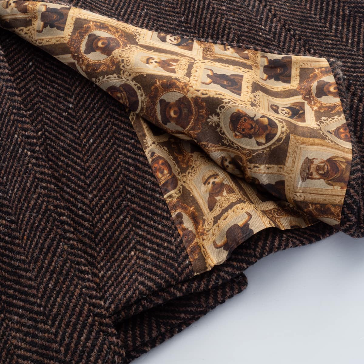 High-quality raglan coat by 1973 made from heavy herringbone wool (530 g), crafted from 100 % virgin wool. The classic brown and black herringbone weave adds a strong texture and masculine elegance. Inside, the coat features a humorous contrast lining printed with vintage animal portraits – a signature detail of the brand. The fit is straight and comfortable, with raglan sleeves for enhanced freedom of movement and a concealed button placket. The full viscose lining in both body and sleeves ensures maximum comfort even when layered.