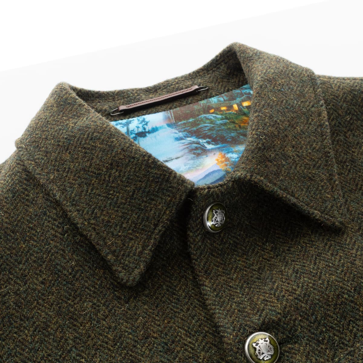 The “Garrett” jacket by 1973 offers a modern take on classic tweed style: Made from 100 % wool (virgin wool) in a traditional herringbone weave, this British Tweed fabric provides both warmth and durability. The standout feature lies in its inner lining – a vivid landscape print in soft viscose. This overshirt-inspired jacket balances rustic appeal with artistic flair, making it a perfect companion for cooler days. The regular fit and engraved buttons complete the premium design.