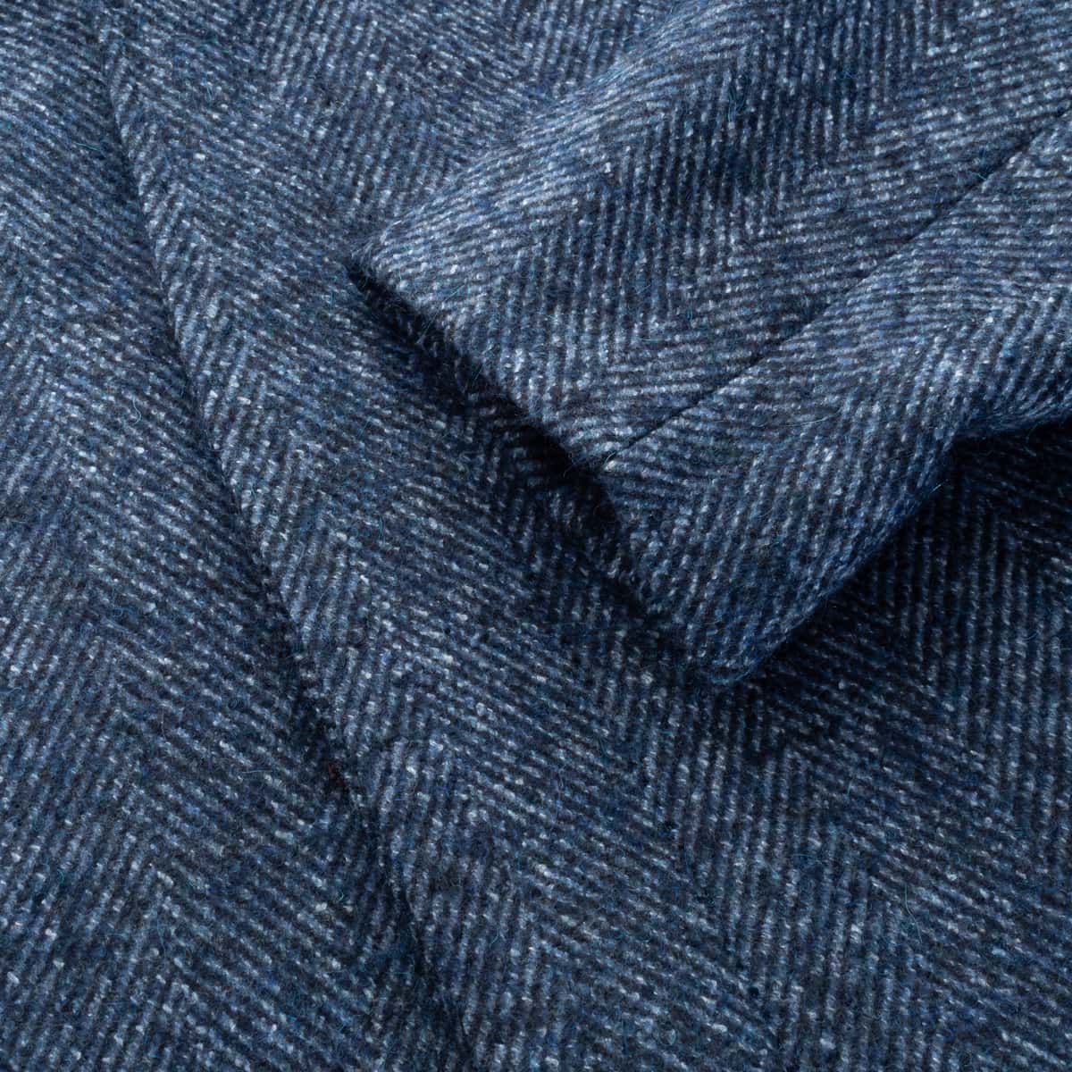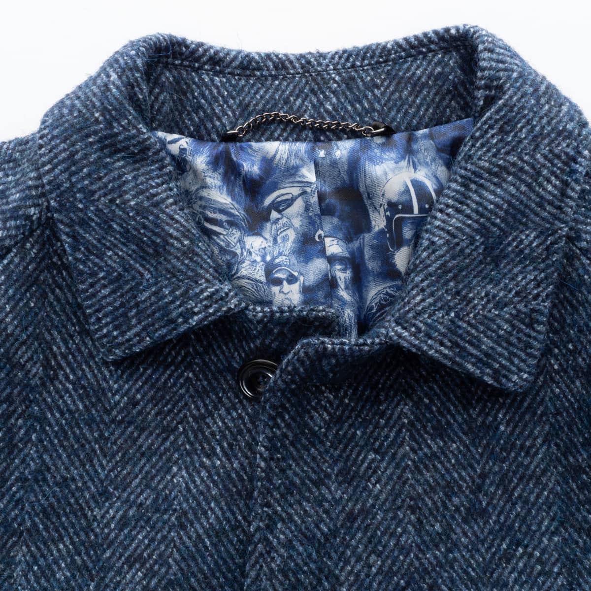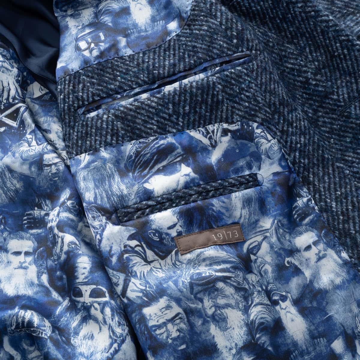 Exclusive raglan coat by 1973, made from a luxurious alpaca wool tweed fabric with a weight of 550 g/m². The model 7985 impresses with its deep blue herringbone pattern and richly textured feel. The refined blend of wool, alpaca, mohair, and silk provides warmth, softness, and elegant structure. Inside, a bold lining print – inspired by vintage biker portraits – adds personality. Classic raglan cut, concealed button placket and thoughtful details make this coat a standout piece for the colder months.