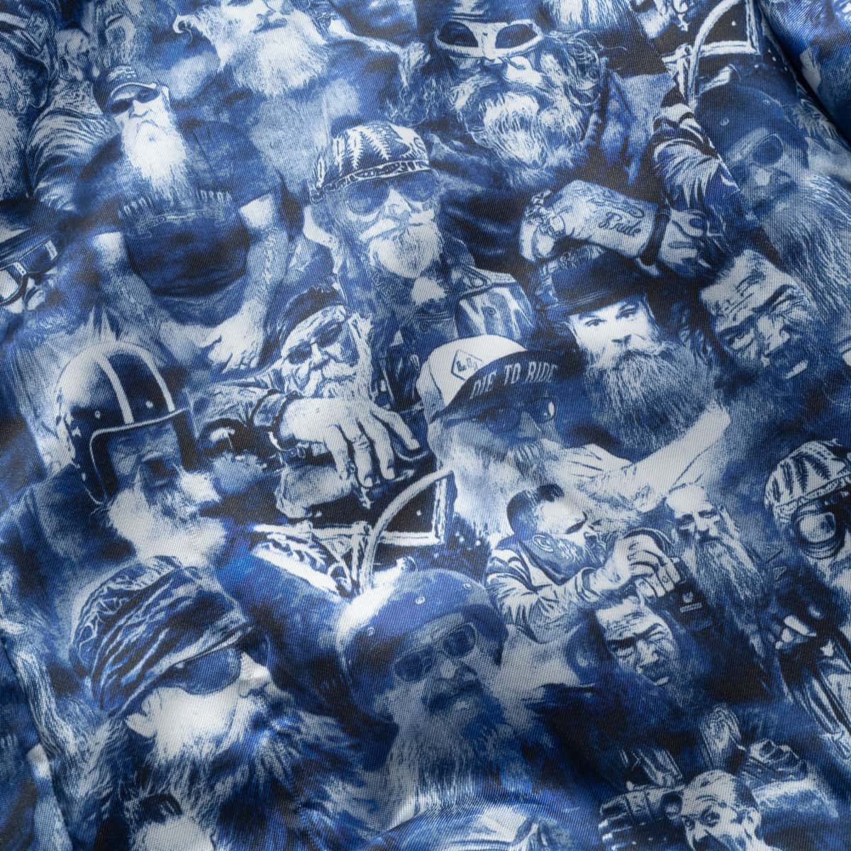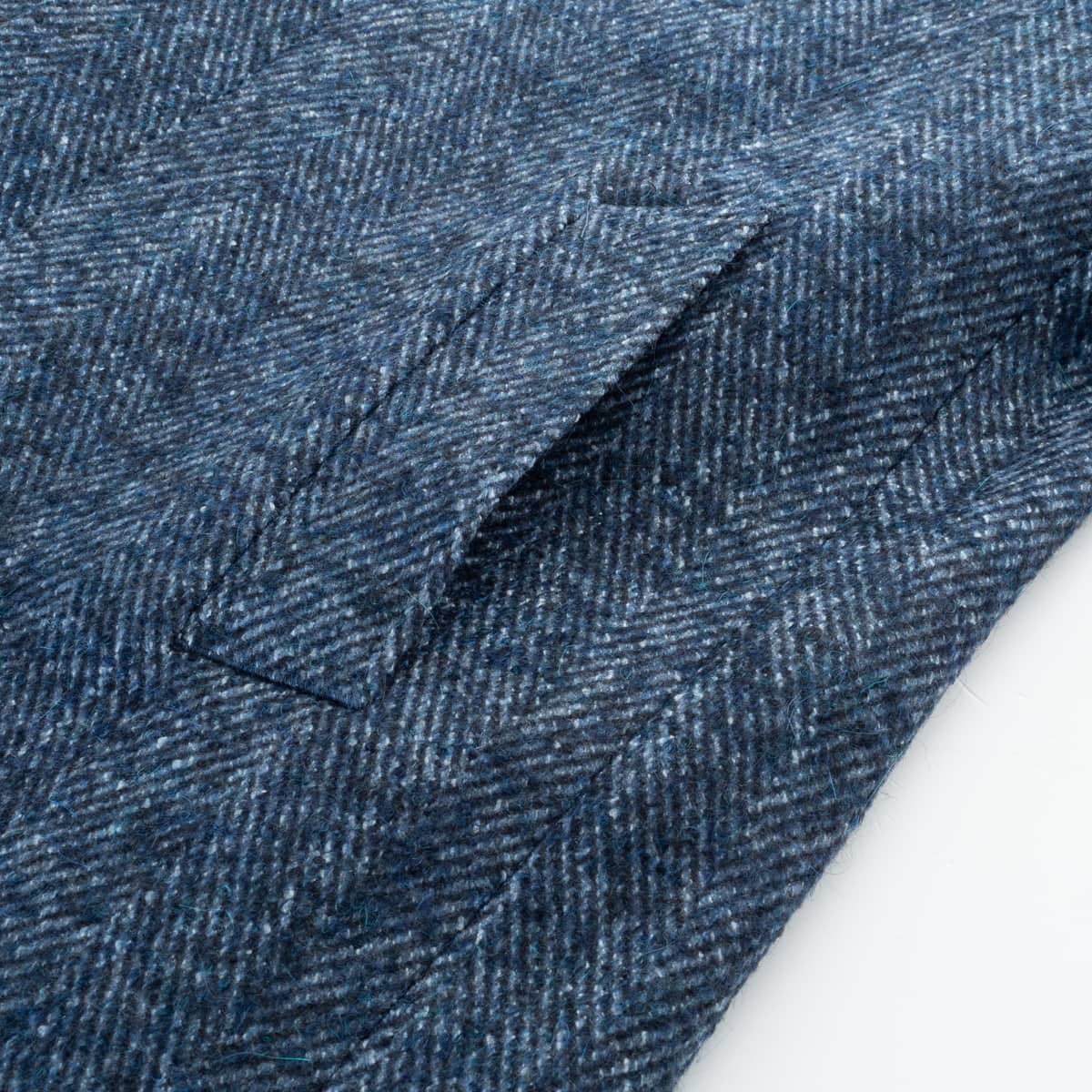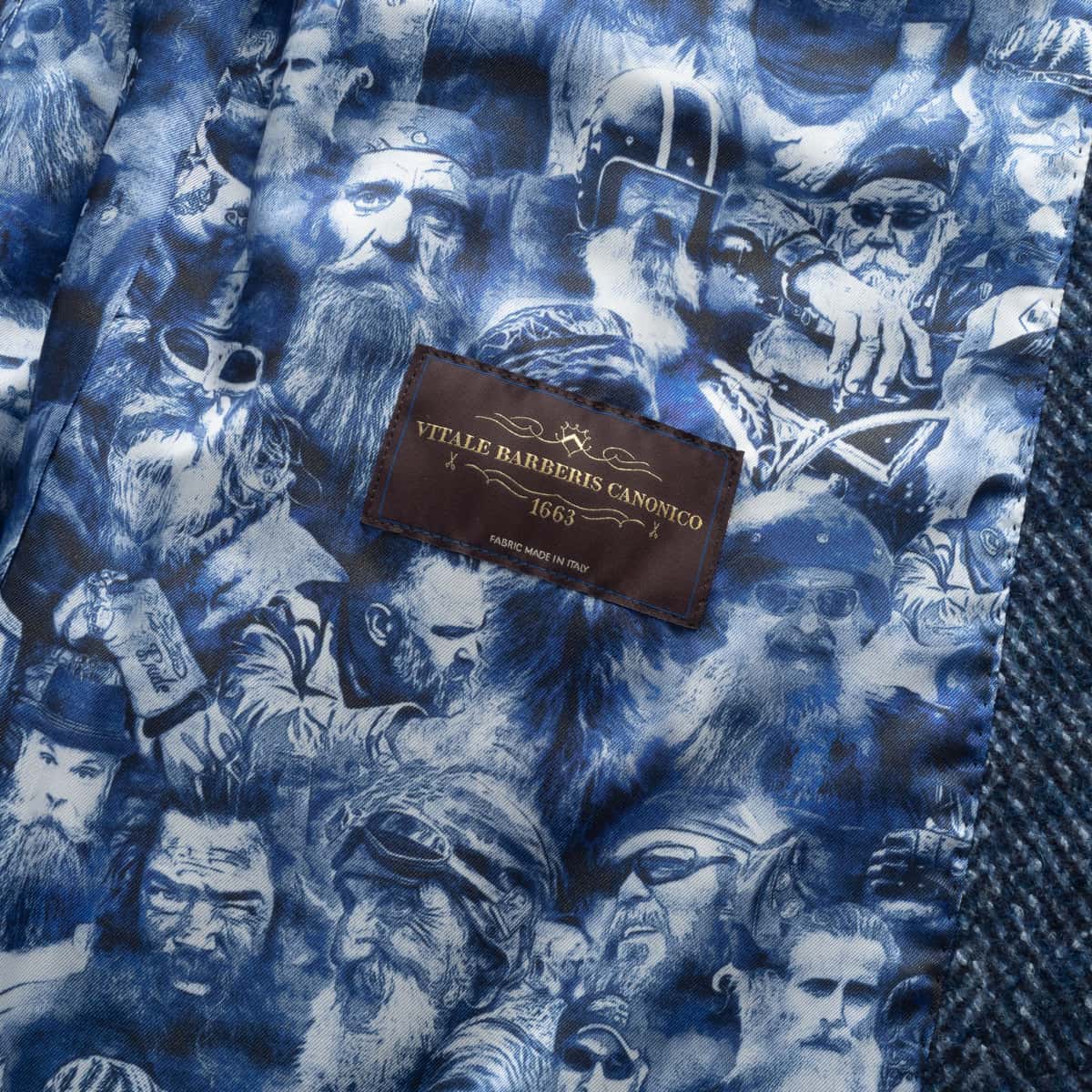 Exclusive raglan coat by 1973, made from a luxurious alpaca wool tweed fabric with a weight of 550 g/m². The model 7985 impresses with its deep blue herringbone pattern and richly textured feel. The refined blend of wool, alpaca, mohair, and silk provides warmth, softness, and elegant structure. Inside, a bold lining print – inspired by vintage biker portraits – adds personality. Classic raglan cut, concealed button placket and thoughtful details make this coat a standout piece for the colder months.