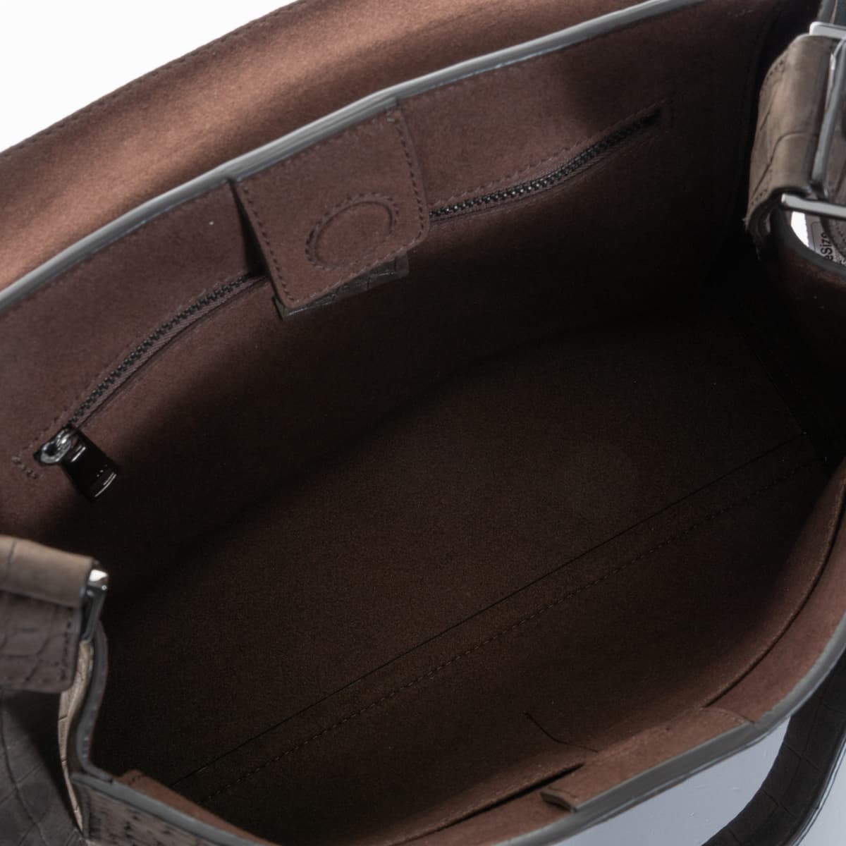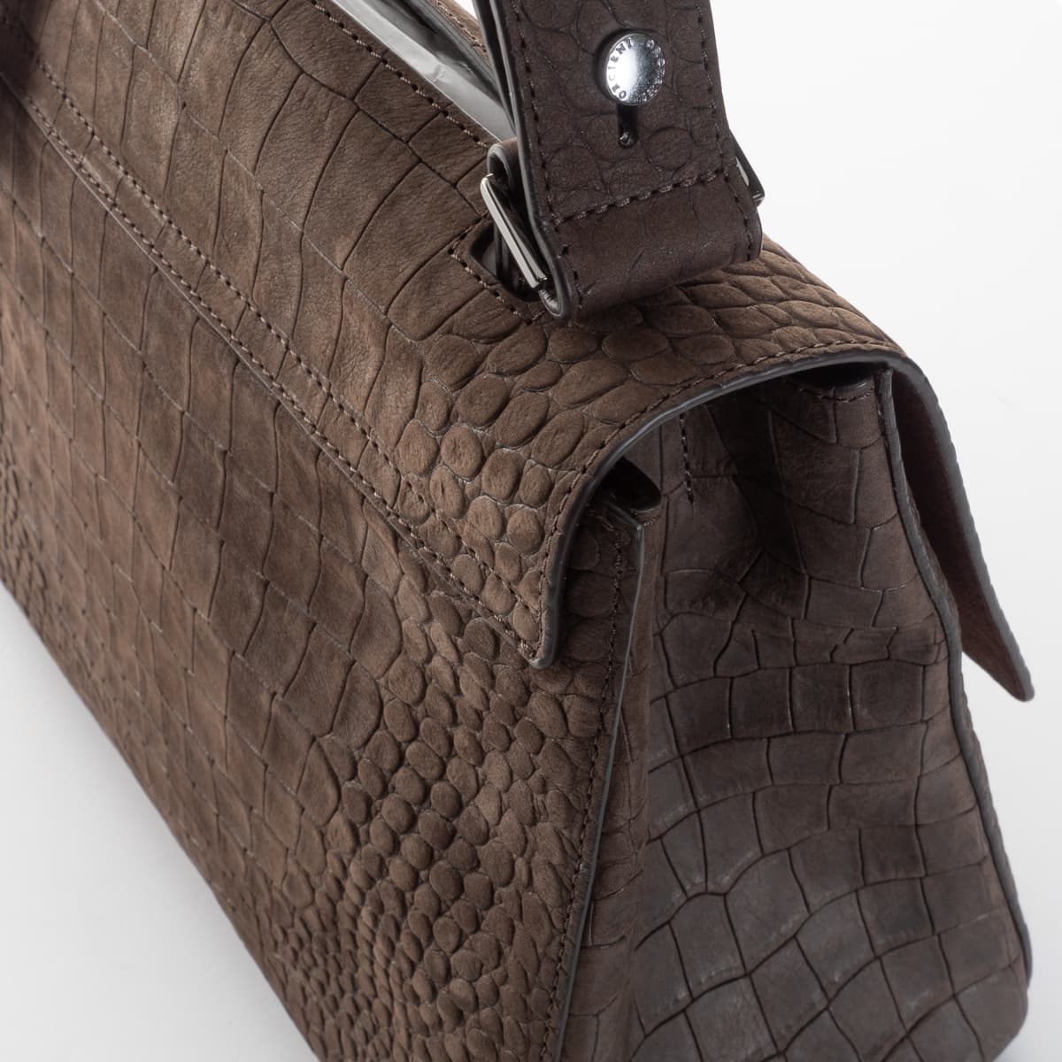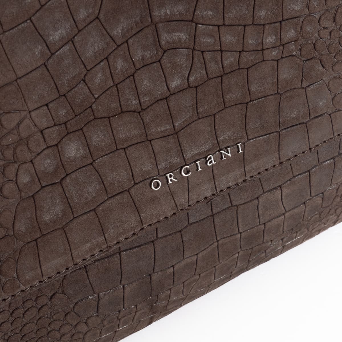 The iconic Sveva bag by Orciani is showcased here in an especially refined version crafted from velvety nubuck leather with an embossed crocodile texture ("Cocco Nabuk"). The warm chocolate tone enhances the bag’s luxurious feel, while the textured leather adds a tactile appeal. With its well-proportioned design, this model is perfect for everyday use – elegant, functional, and distinctively stylish. It features a short top handle and a detachable shoulder strap for versatile wear. The interior is lined with cotton and includes a zip pocket for valuables.