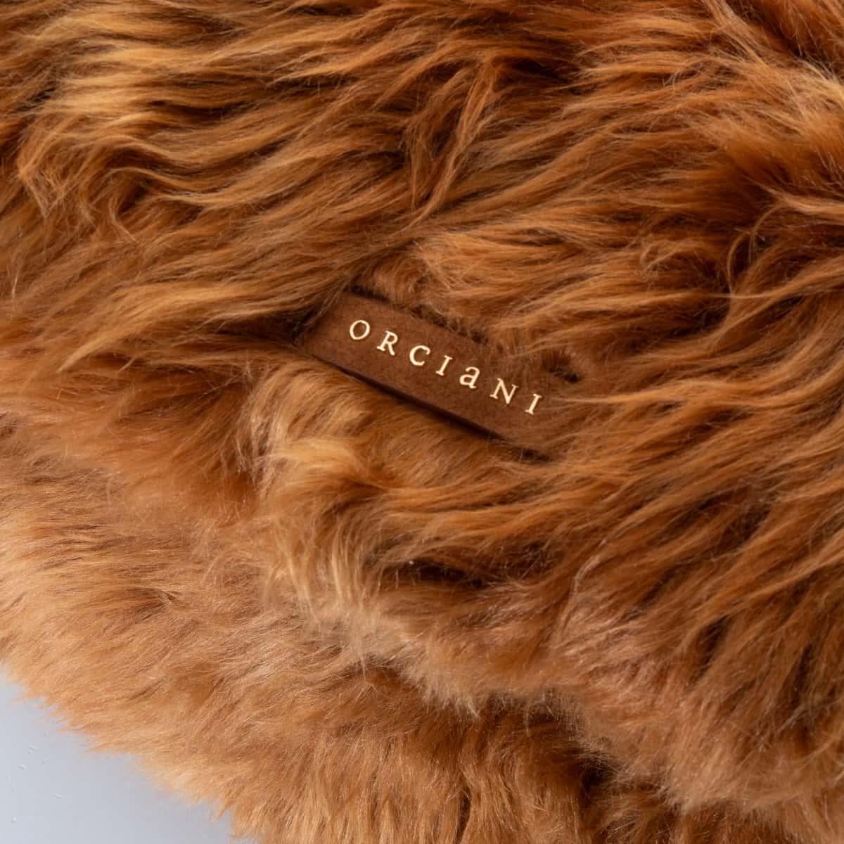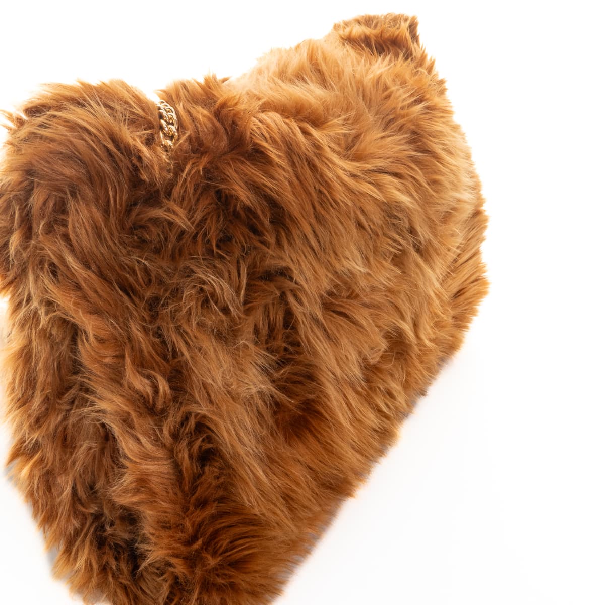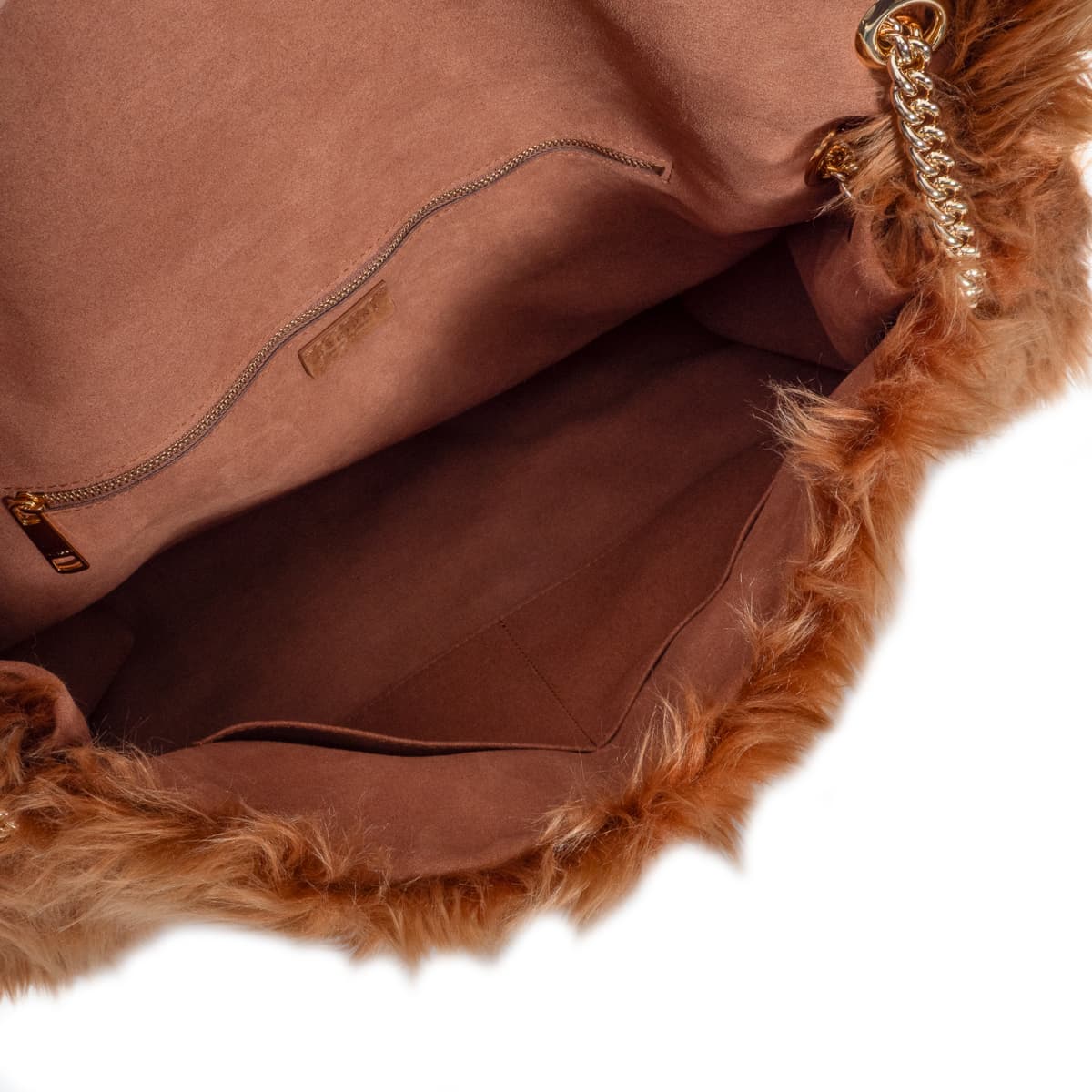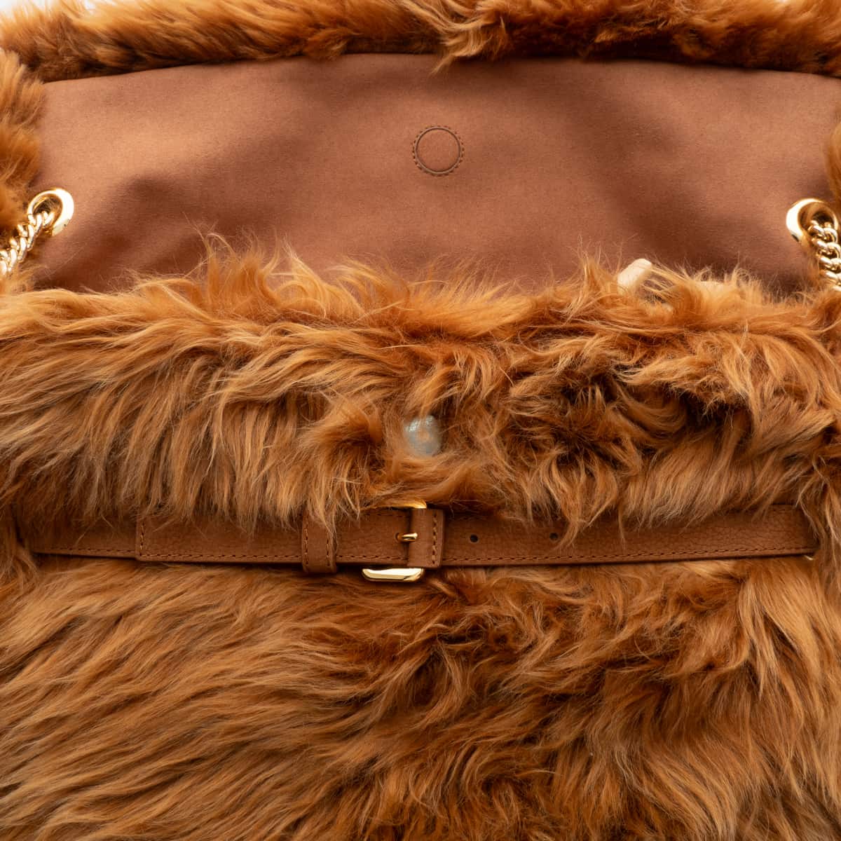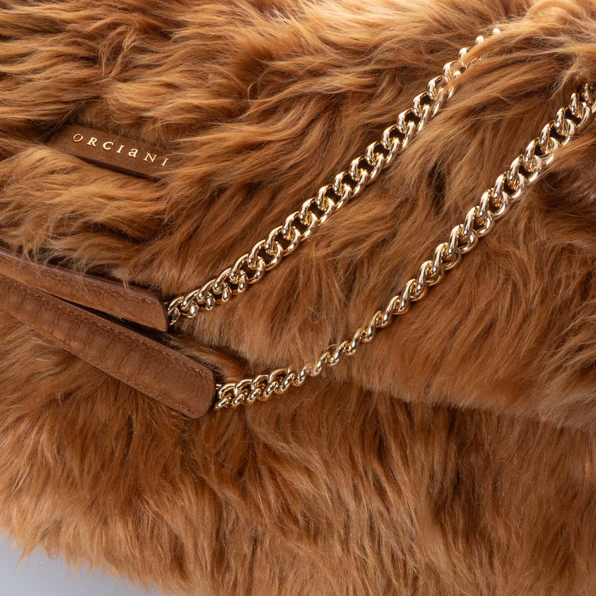 The “Venus L” bag by Orciani is a true statement piece – soft, voluminous, and covered in fluffy faux fur. The warm brown hue (Terra di Siena) enhances the luxurious look, while the gold-tone chain strap adds an elegant accent. The tactile surface is lined with a suede-like interior, beautifully finished with leather details. A spacious main compartment with zip and slip pockets ensures practicality. The bag is comfortable to wear on the shoulder, and a protective dust bag is included for storage.