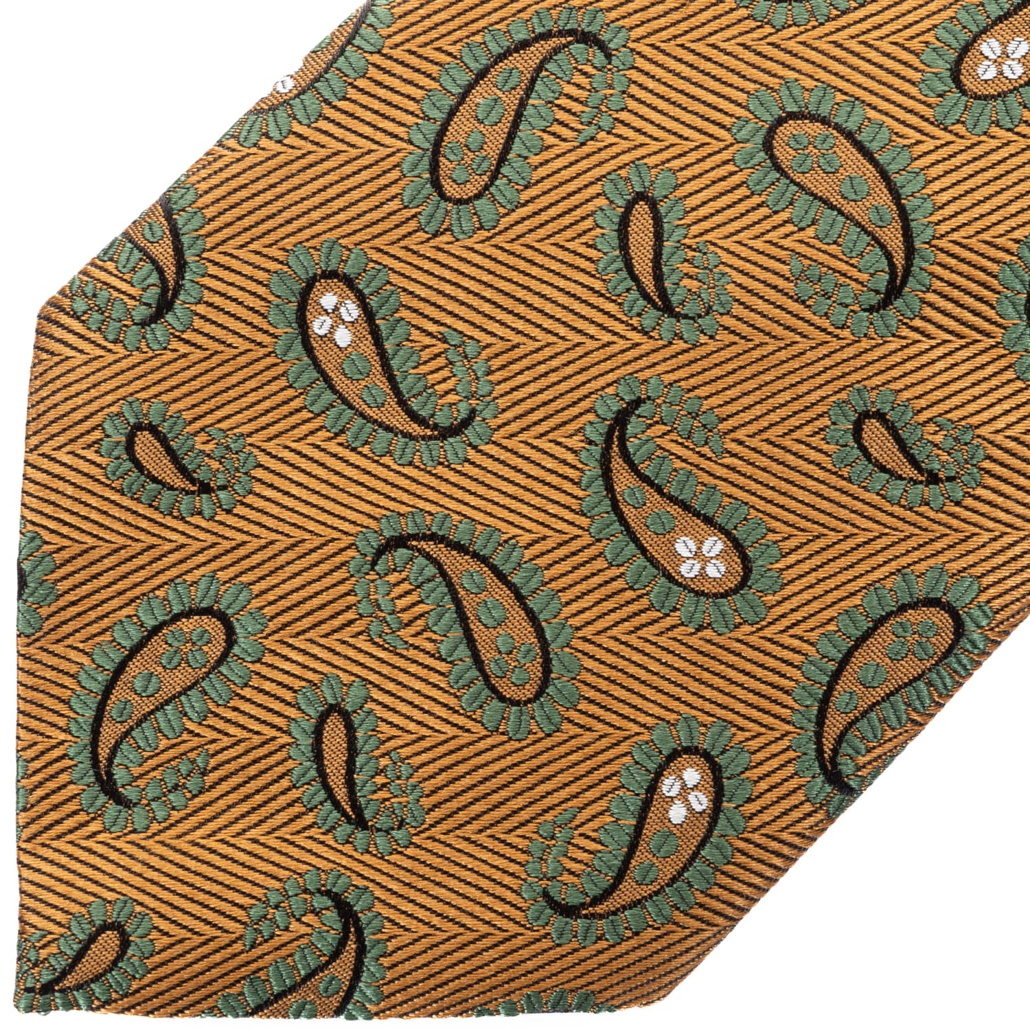This elegant tie impresses with its classic paisley pattern in shades of green and brown on a warm ochre background. Made from high-quality silk, it adds a stylish and timeless touch to any outfit.
