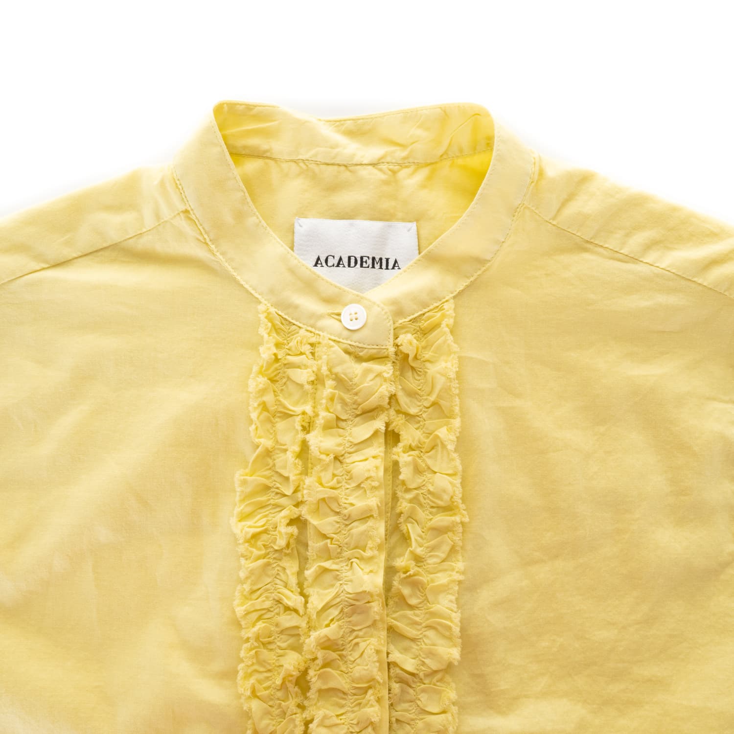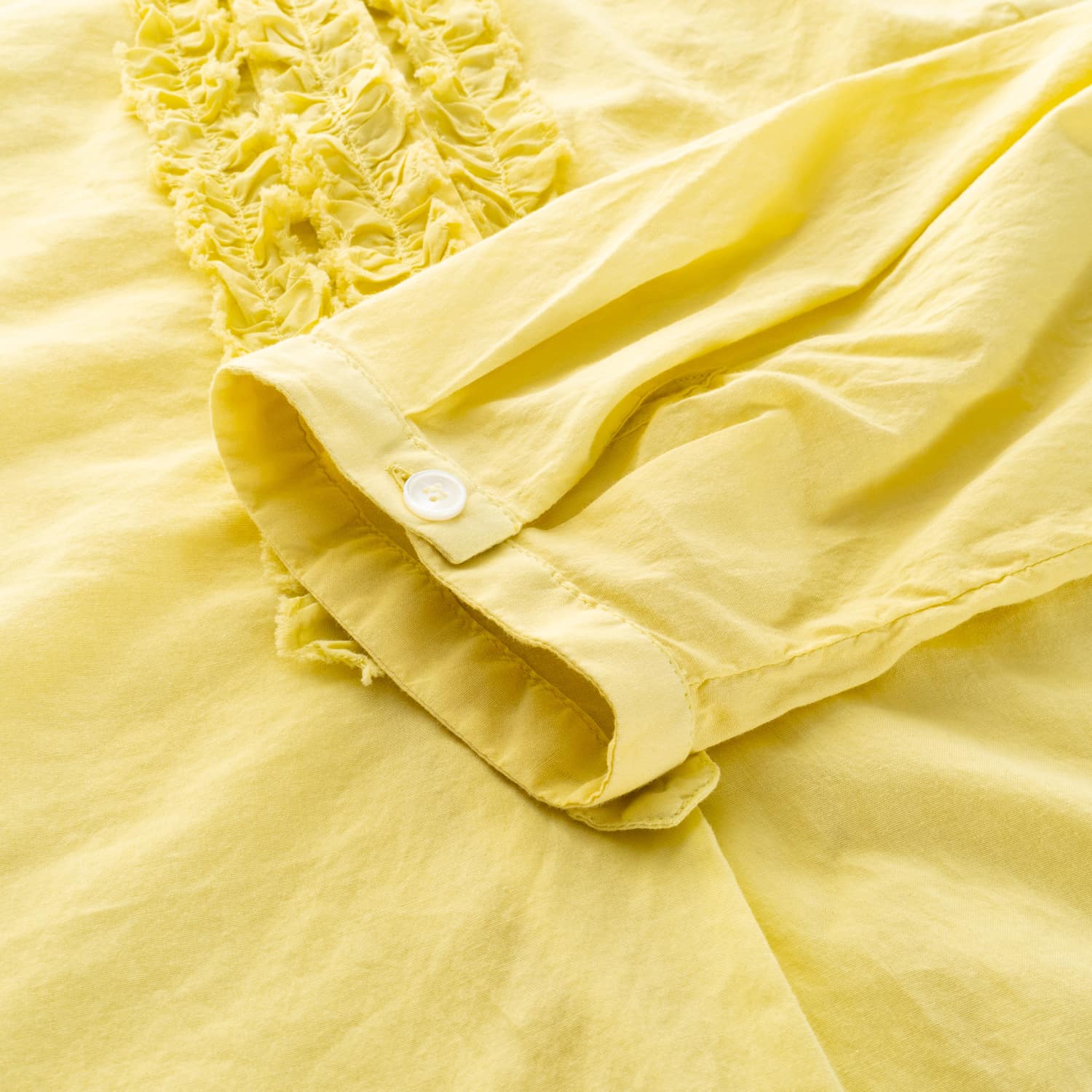 - Decorative ruffle detailing along the button placket