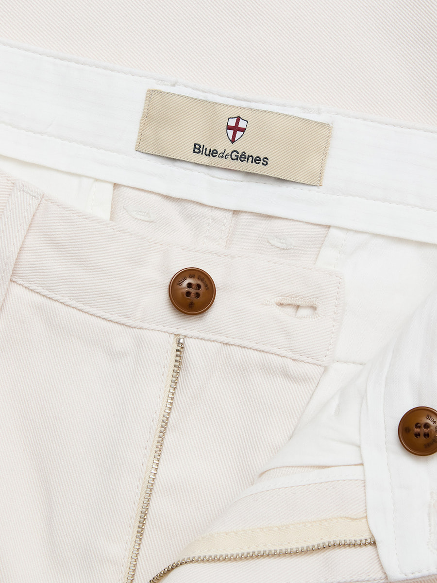Designed with a regular fit and a slightly tapered leg, the Palco offers a balanced silhouette and comfortable wear. Slanted front pockets and welted back pockets emphasise the traditional chino character. Subtle brand details such as the Blue-de-Gênes flag rivet and the corozo logo button at the waistband complete the design. A zip fly ensures practical daily use.