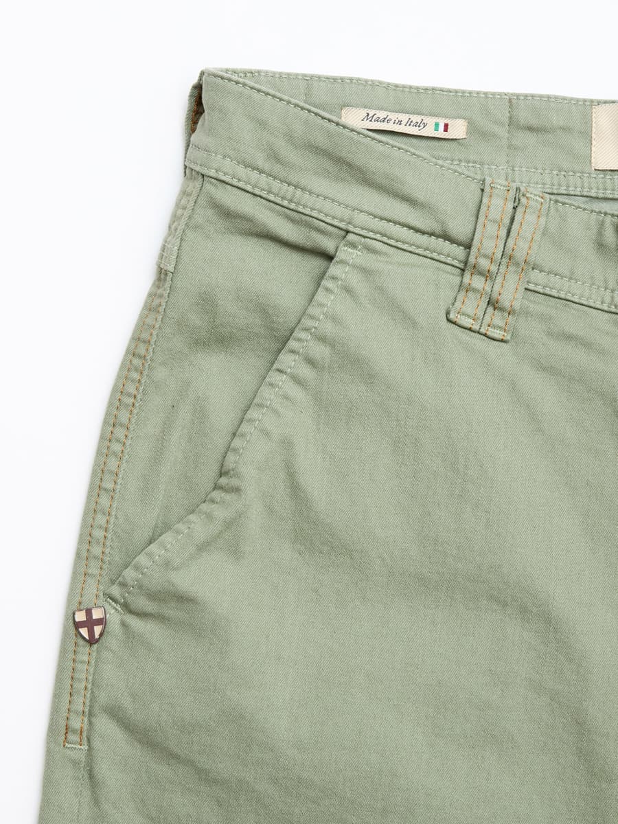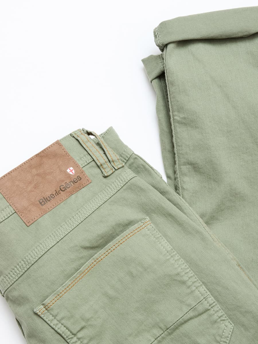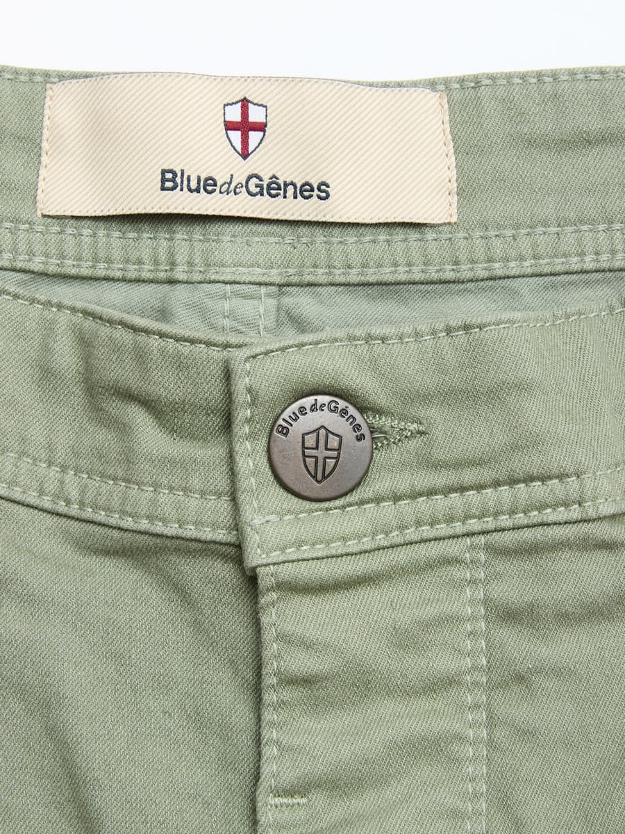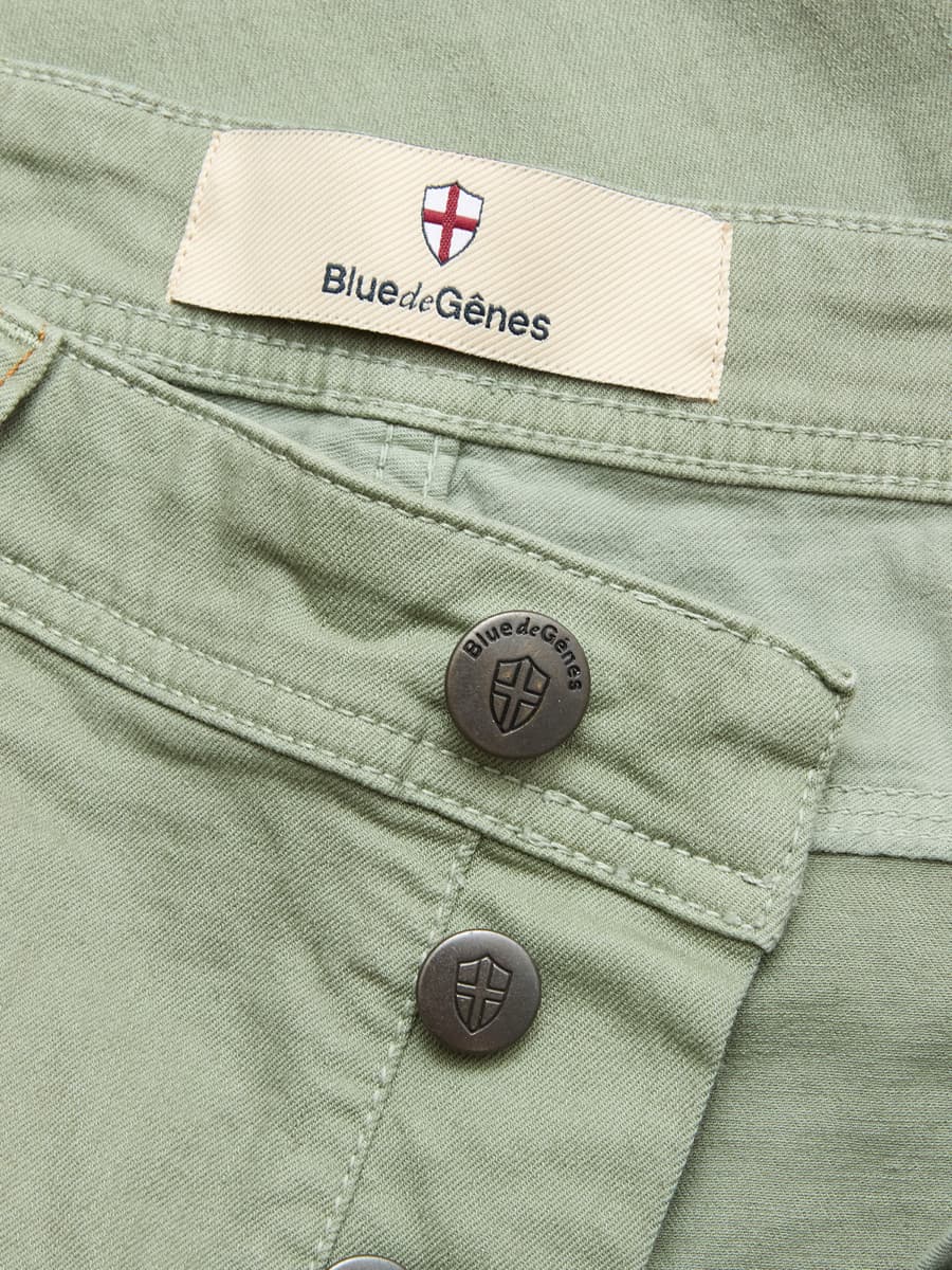 The Paulo Shadow Green Chino by Blue de Gênes is a modern interpretation of classic military trousers, combining functional details with timeless style. The light, subtly washed blue tone gives the trousers a fresh, summery appearance, making them a versatile choice for everyday wear.