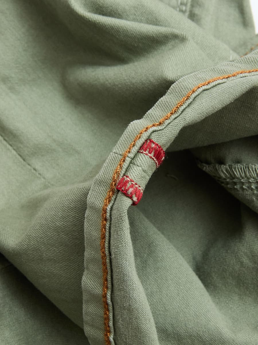 - Double and triple stitched seams inspired by military trousers