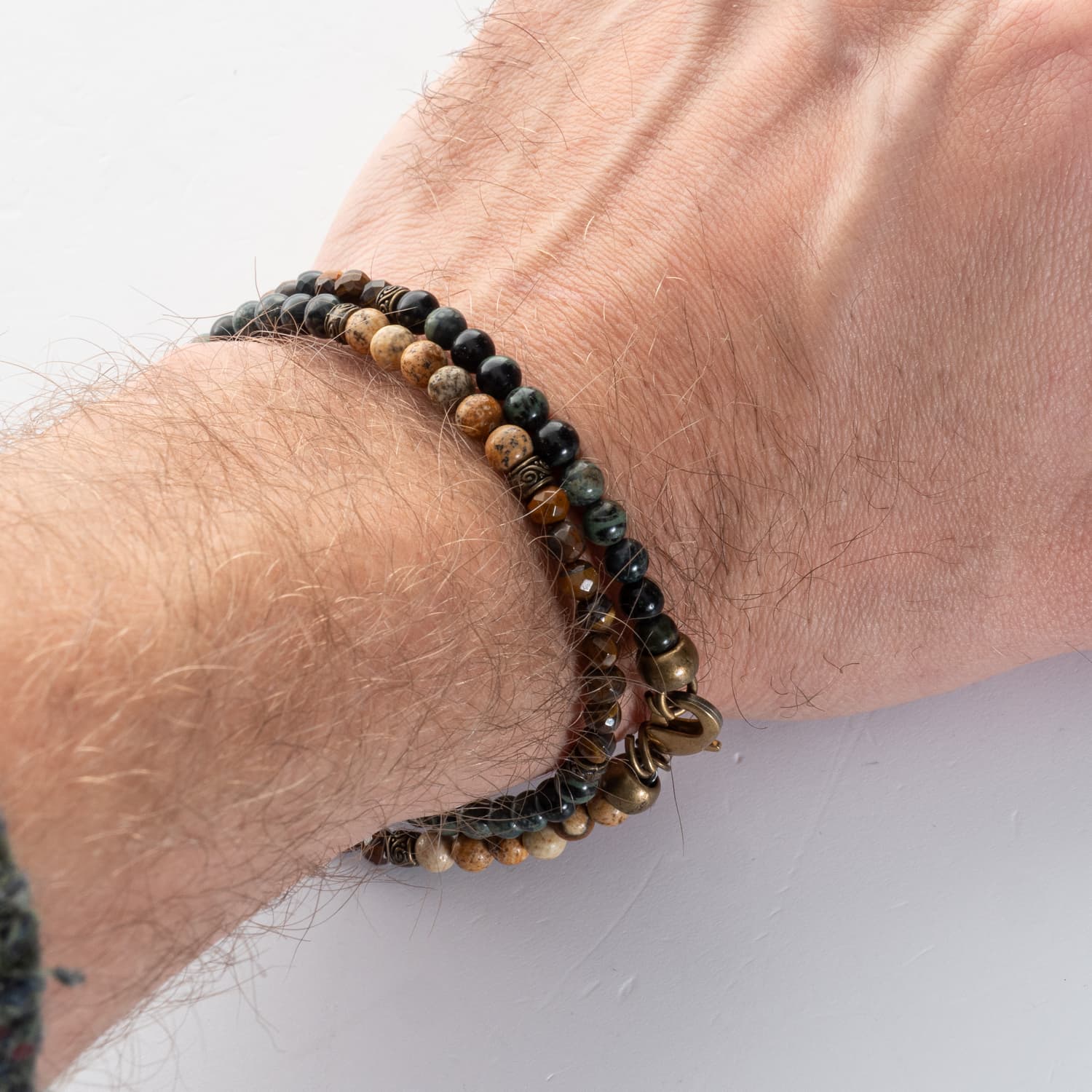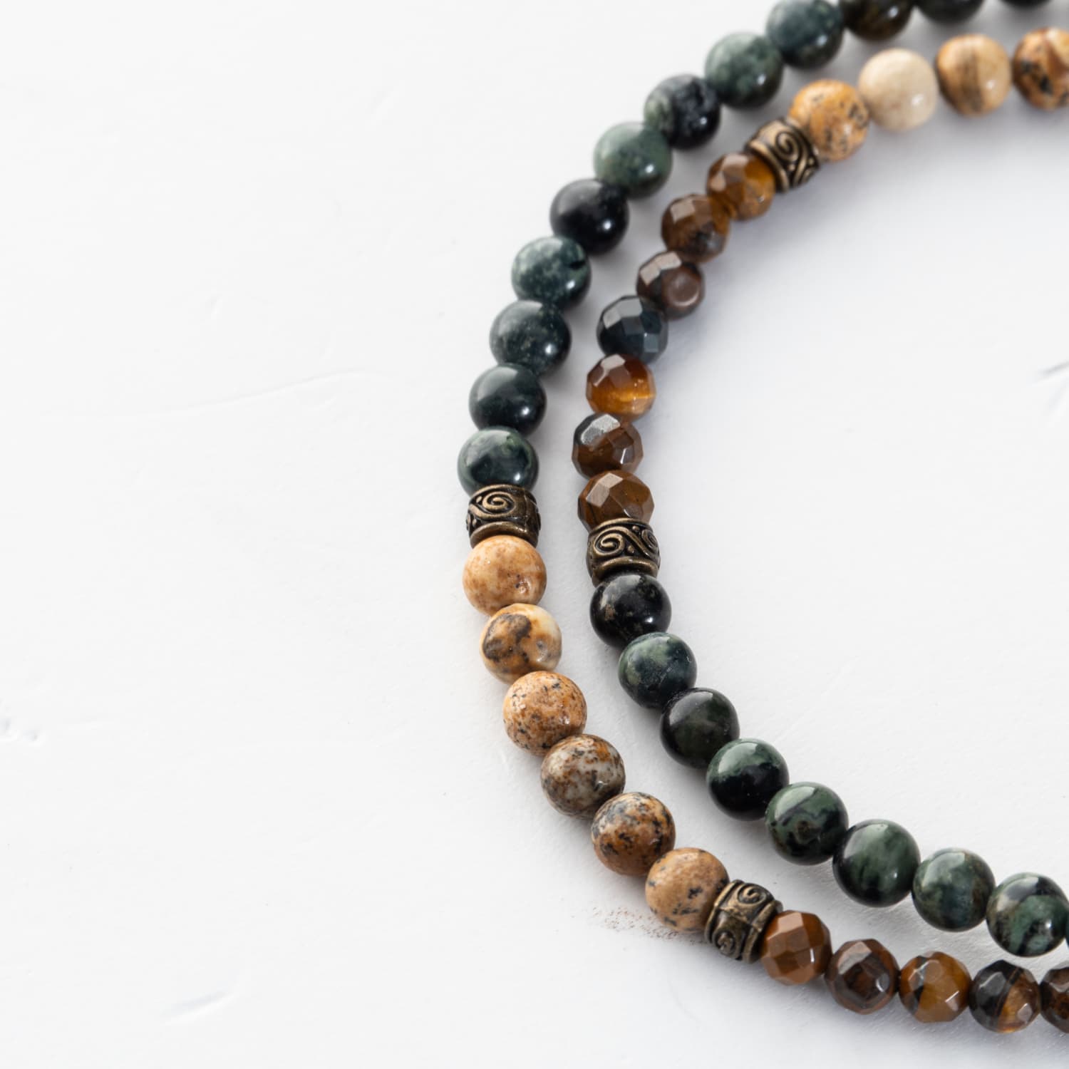 The Bosc bracelet by XXL Hardwear combines natural minerals in a striking double-wrap design. Crafted from moss agate, jasper, tiger’s eye, and dark volcanic rock, it creates a balanced mix of green, brown, and beige tones. Antique brass spacer beads with engraved spiral details add character and depth. Each bracelet is handmade, making every piece unique – a true reflection of craftsmanship and natural texture.