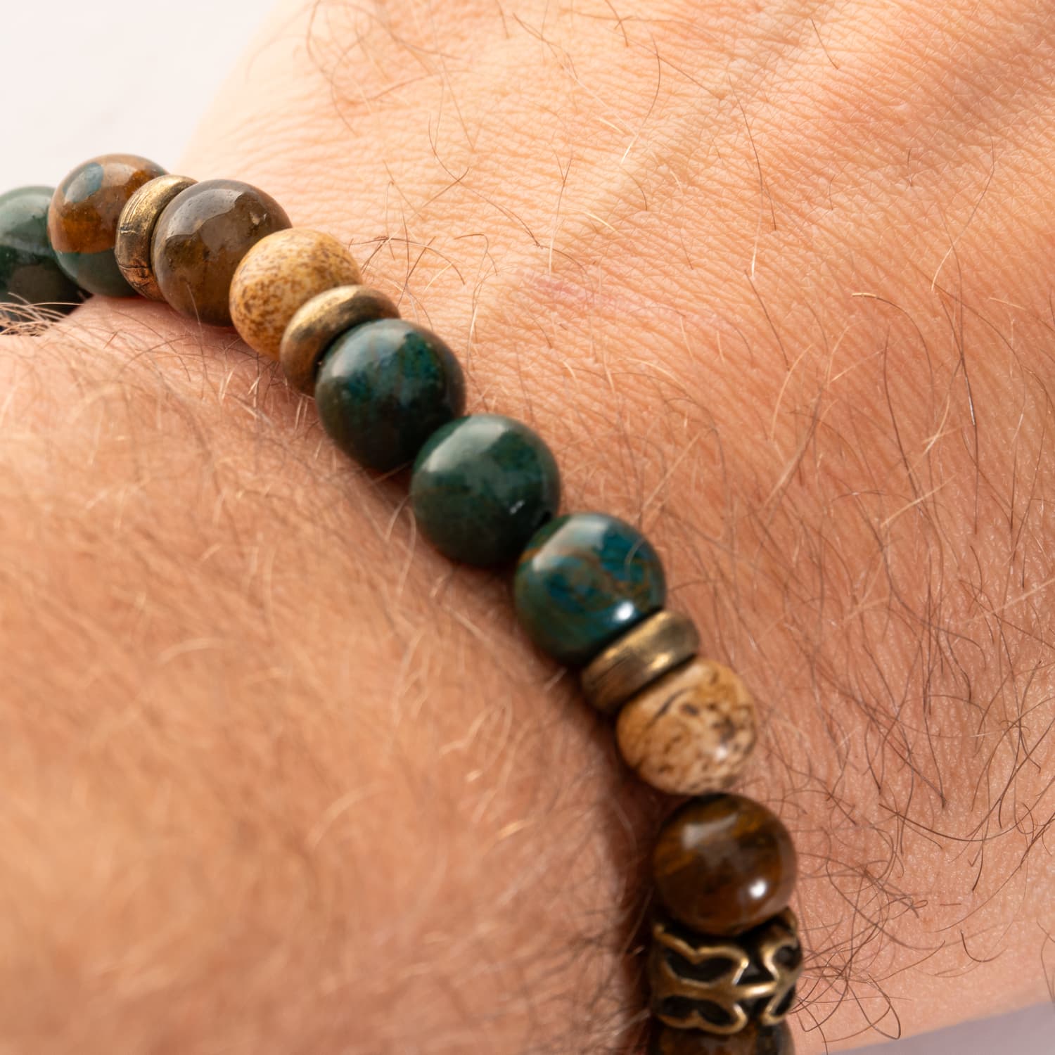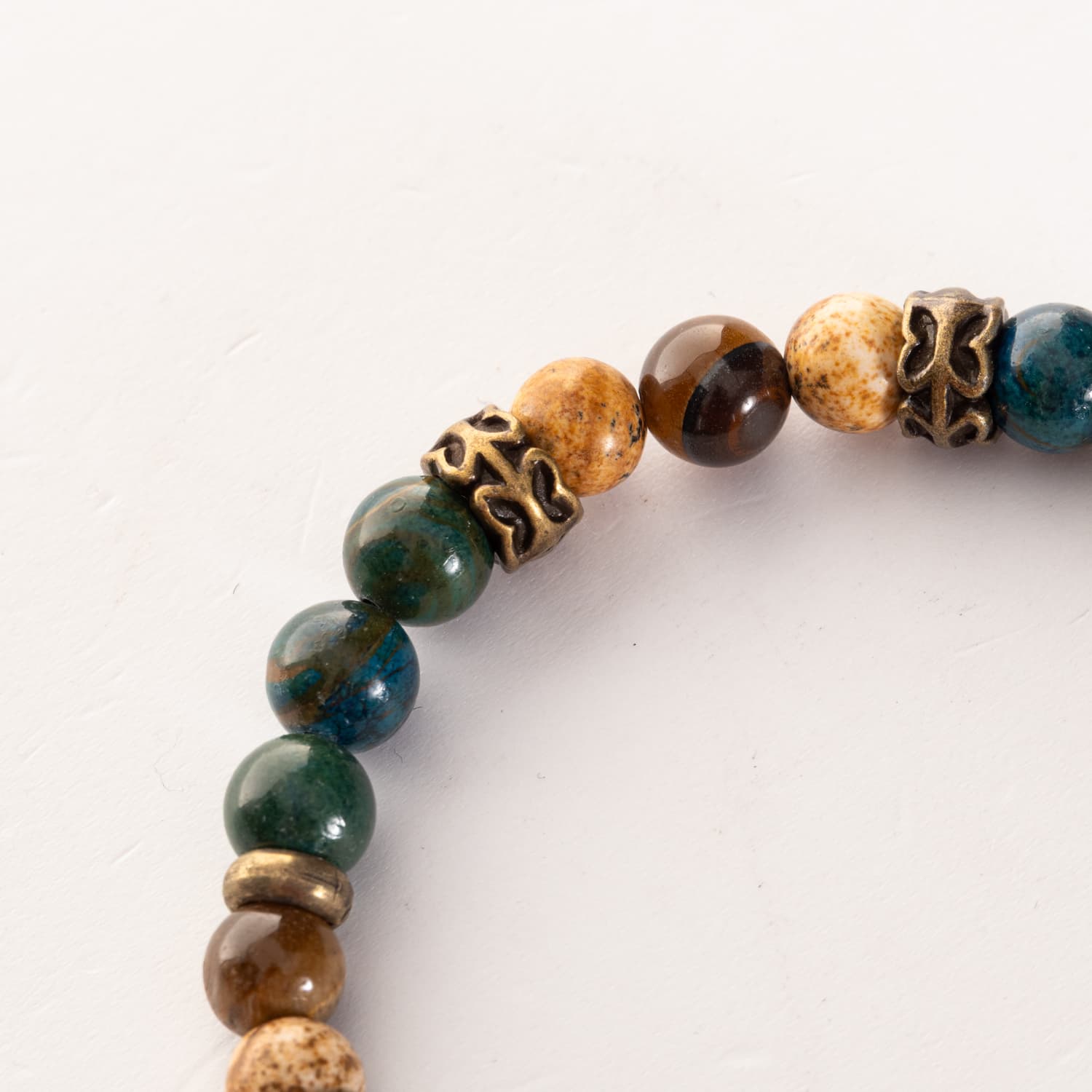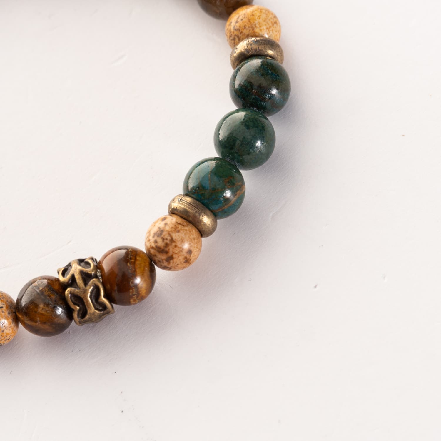 - Material: Natural tiger’s eye stone, green moss agate, jasper, brass (antique gold finish)