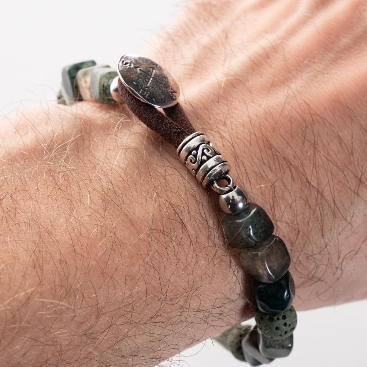 - Material: leather, agate (polished) [mineral stone], volcanic stone, brass, metal