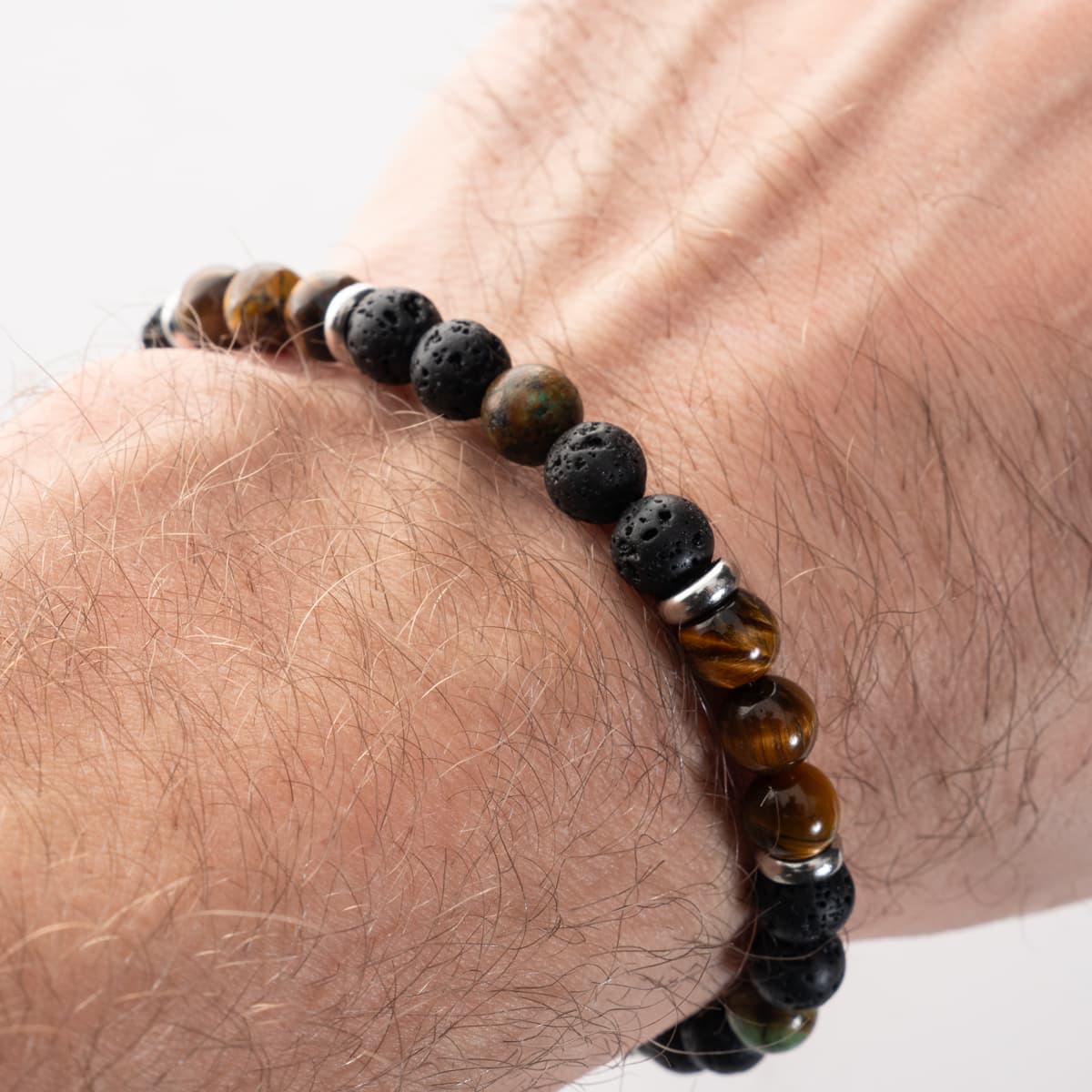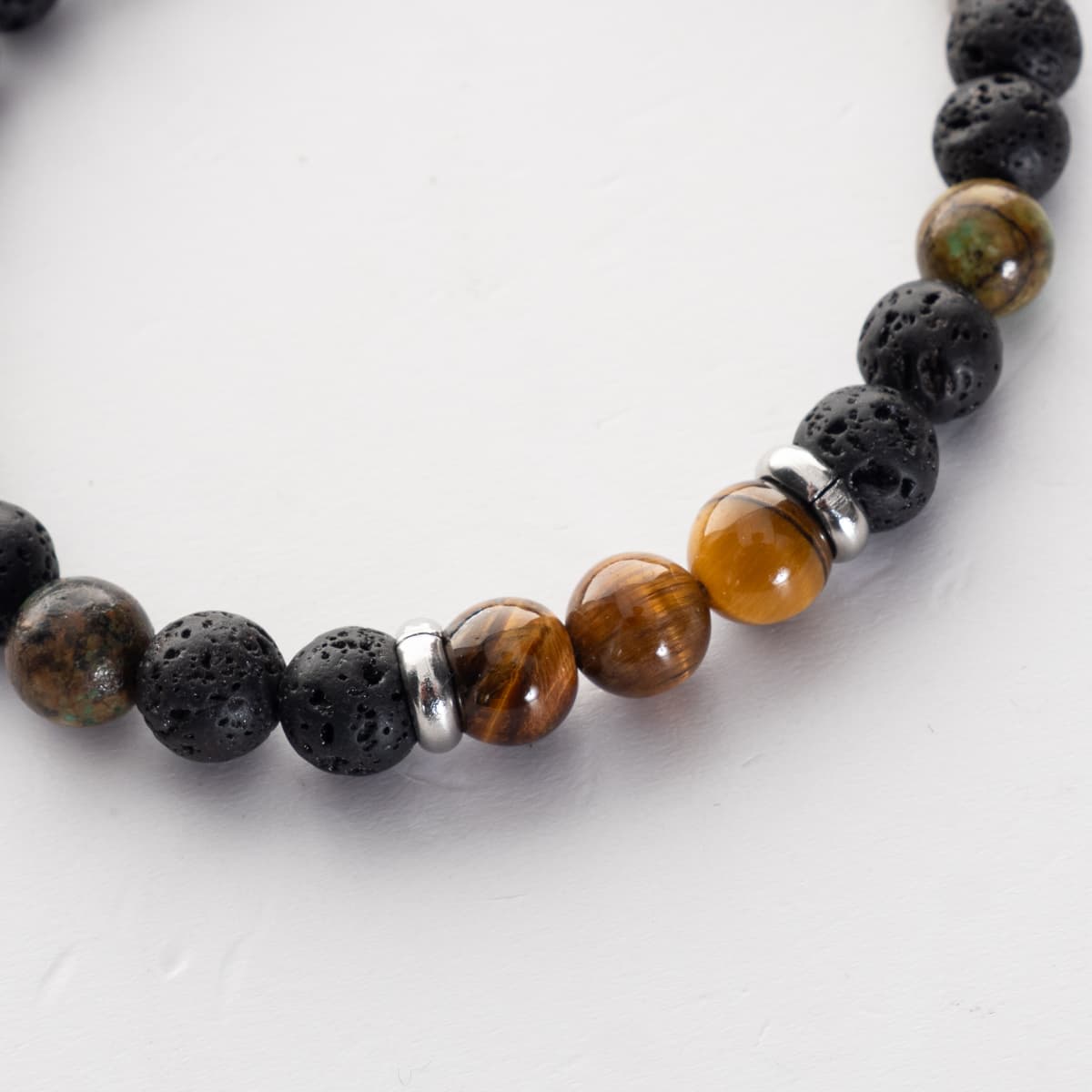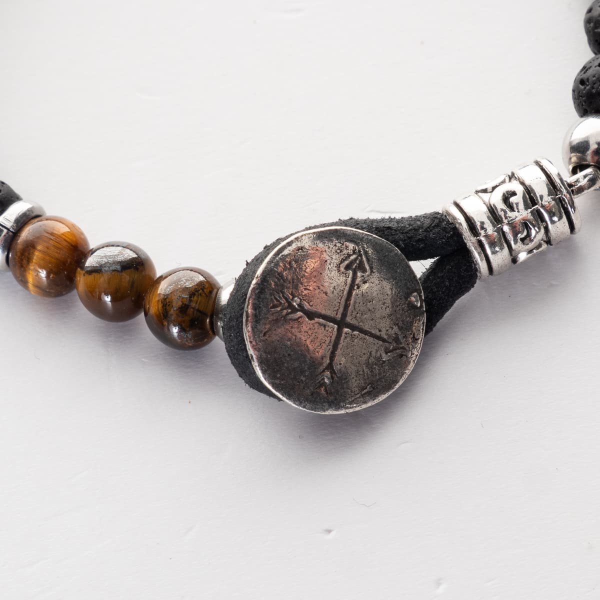 - Material: leather, tiger’s eye, agate, volcanic stone, metal