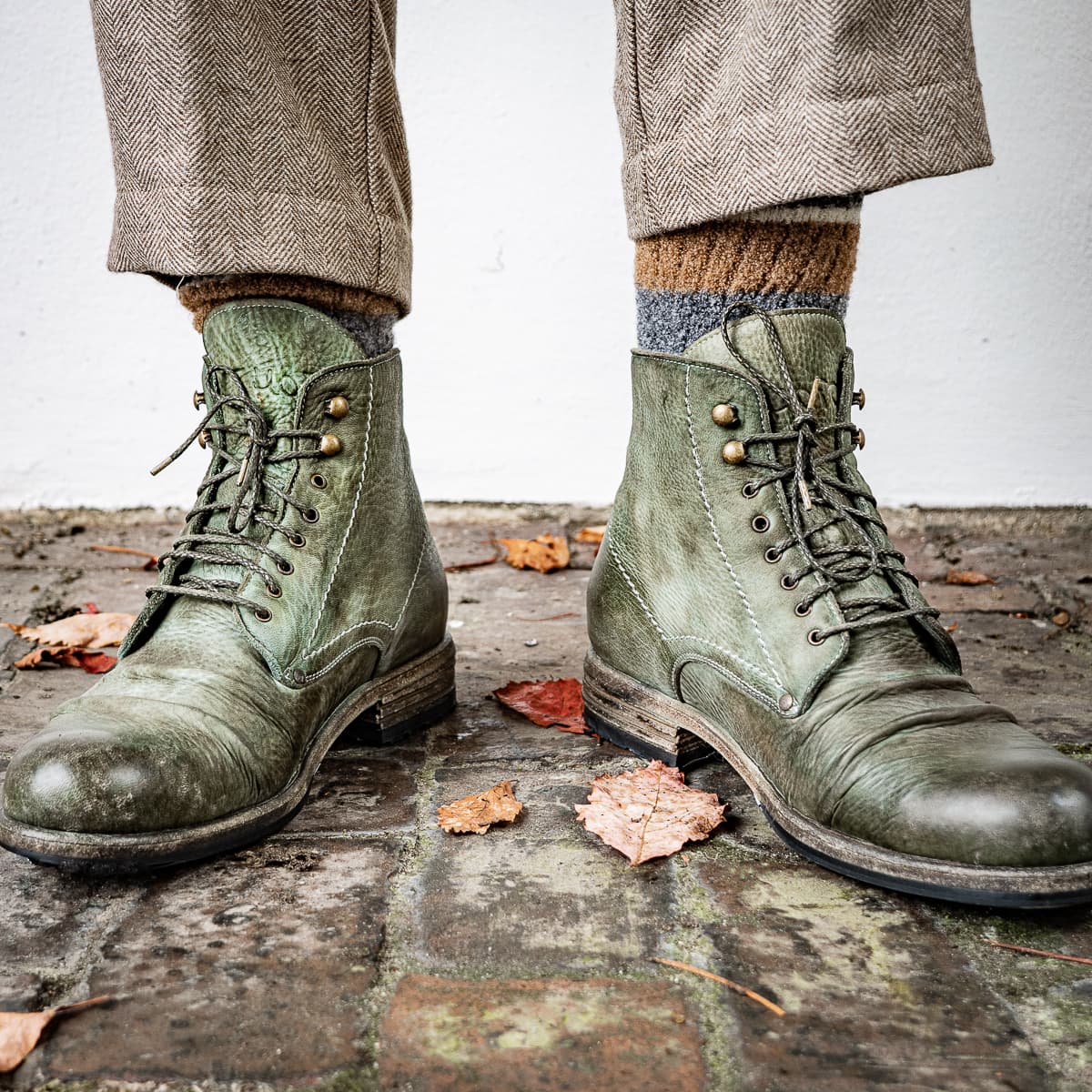 In the 'Stoned Washed' process, the shoes, which are treated with abrasive stones, gain an authentic vintage look. The final finish brings out the unique characteristics - the gradients and shades. The use of premium horse, elk, antelope and calf leather, combined with the best Italian leather soles, create a one-of-a-kind shoe of the finest quality.