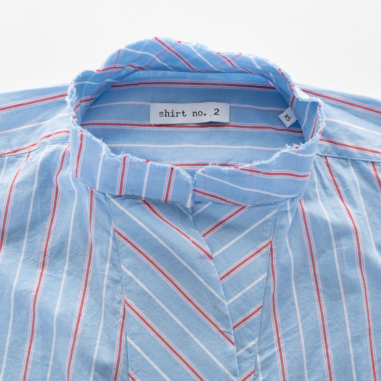 - Raw edges at the collar, sleeve hem and hem