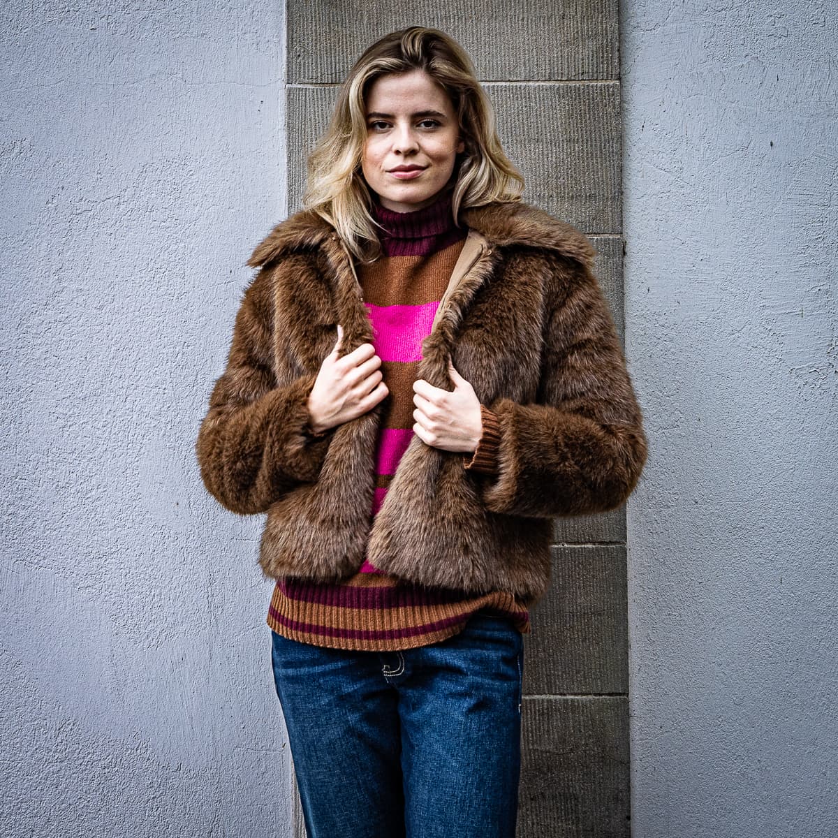 Trendy faux fur jacket by Des Petits Hauts featuring a soft touch and elegant design. This piece impresses with its dense, velvety texture, perfect for stylish appearances on cooler days. The classic turn-down collar and concealed button placket emphasize the clean aesthetic. The acetate lining ensures exceptional comfort. A versatile jacket – from casual to chic looks.