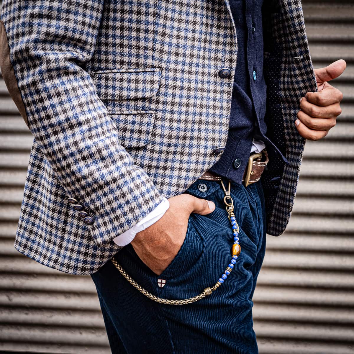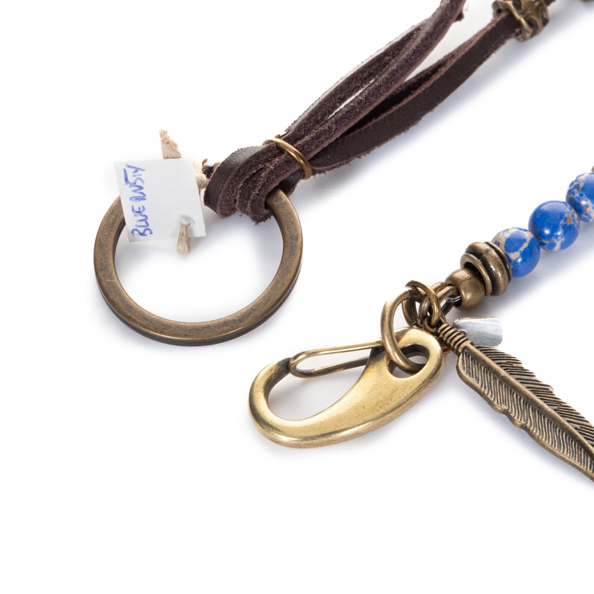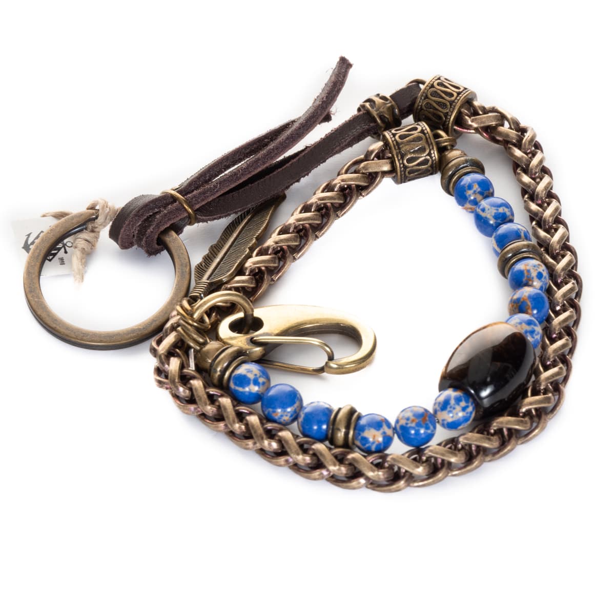 The "Blue Rusty" wallet chain by XXL Hardwear is a handcrafted one-of-a-kind piece with bold character. It combines blue jasper, tiger’s eye, and an antique gold-plated brass chain with leather details and feathers. All materials are of natural and/or mineral origin. Strung on a double steel cable – extremely tear-resistant and durable.