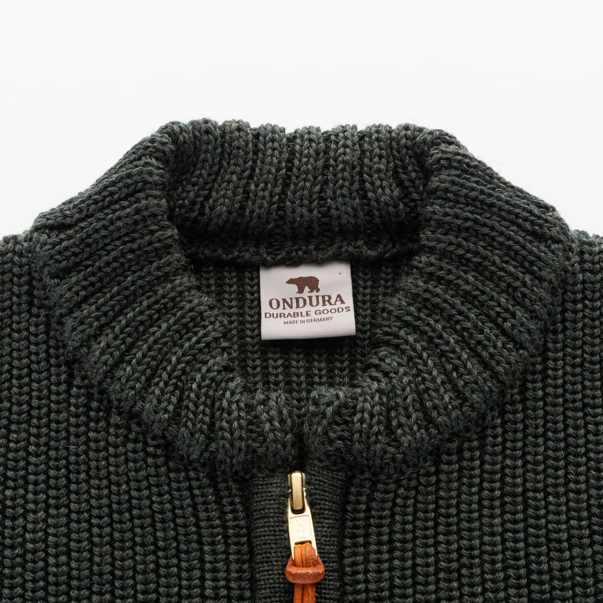 The Classic Cardigan by Ondura Durable Goods is a true statement of functional quality and timeless design. Knitted from 100% wool (Merino wool), it impresses with its natural warmth, breathability, and antibacterial properties. The chunky moss stitch texture and durable YKK two-way zipper highlight the garment's craftsmanship. A slightly raised collar offers protection against wind, while the small leather patch with embossed bear logo on the left sleeve adds a subtle brand detail. Made in Germany – a warm companion for cold days, outdoor activities, or as the perfect mid-layer under a leather jacket.