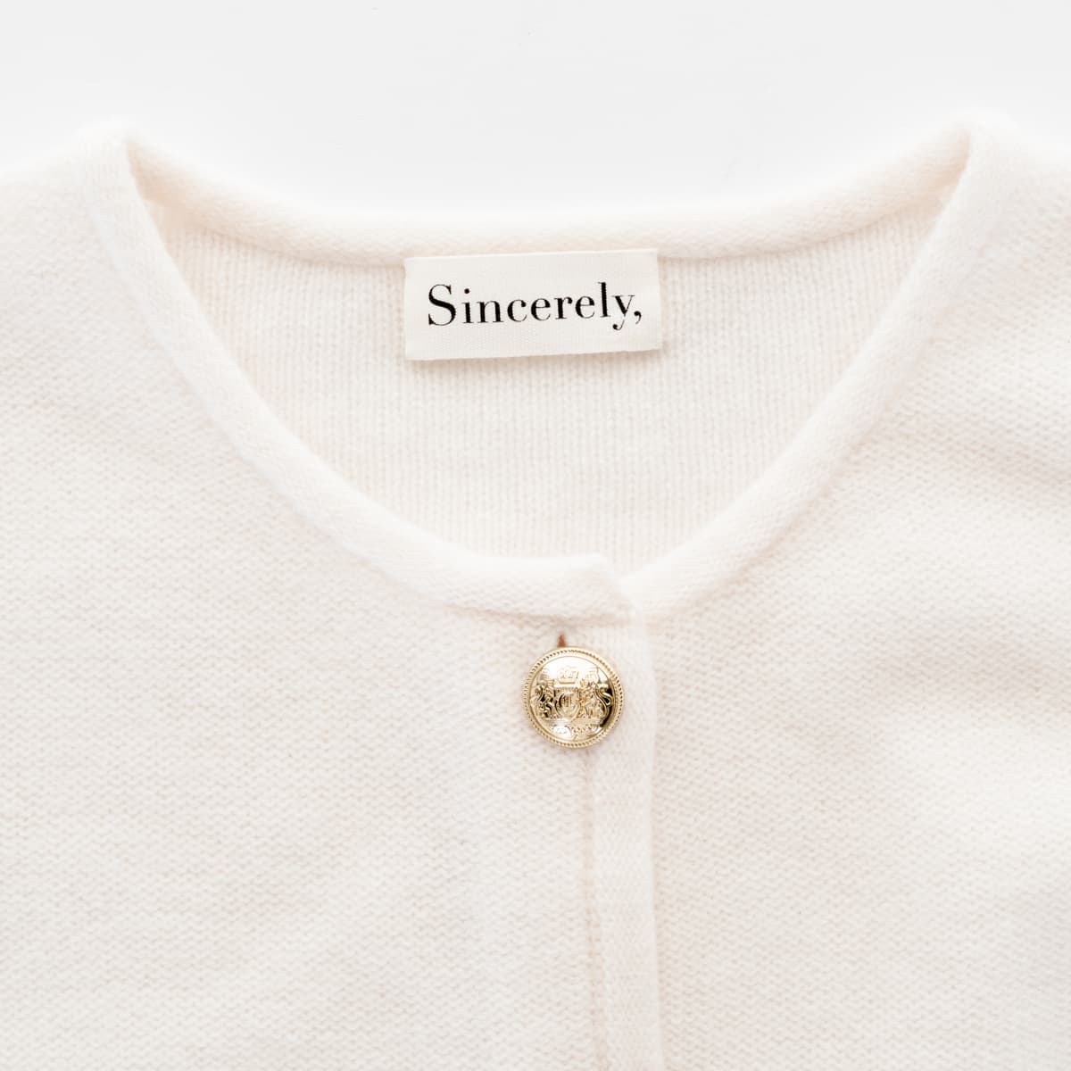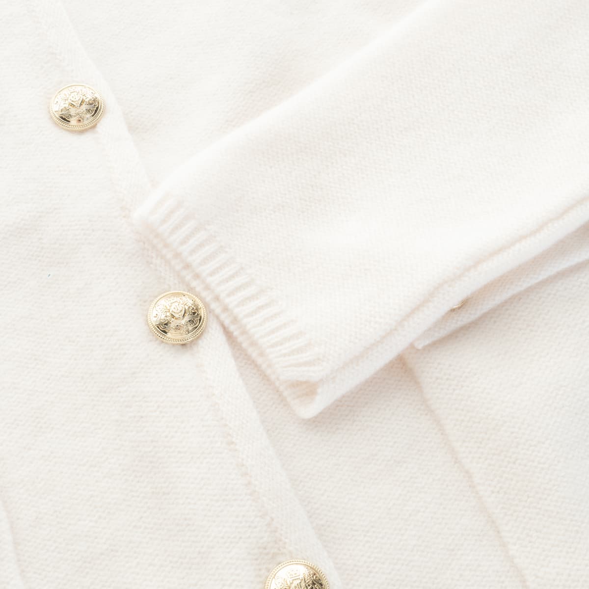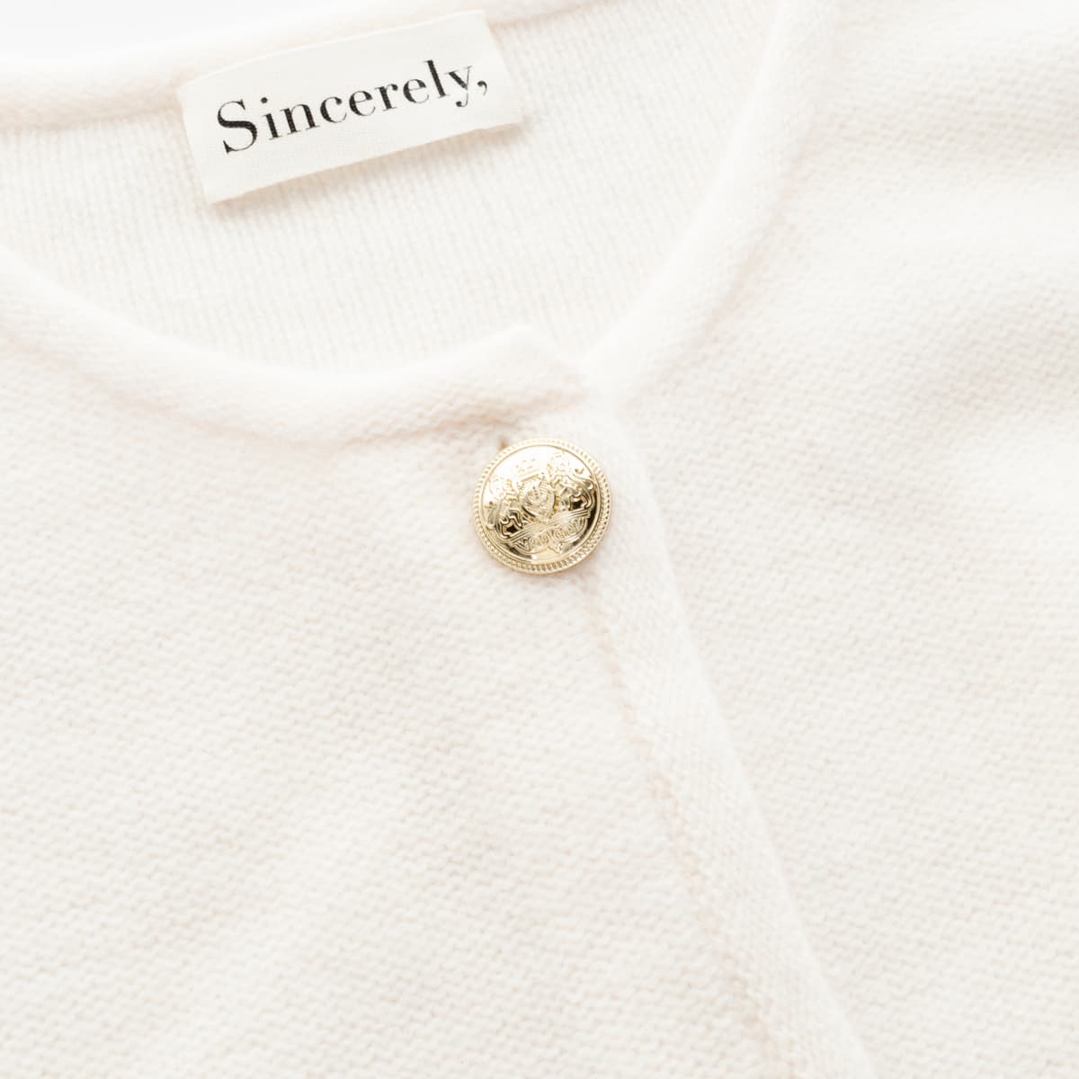 Elegant cardigan by Sincerely, crafted from a soft blend of 70% wool and 30% cashmere. The classic silhouette features a round neckline and eye-catching gold-toned decorative buttons for a refined touch. Two patch pockets with flaps underline the sophisticated character of this style. Thanks to the high-quality yarn, the cardigan is soft to the touch, warming and comfortable – perfect for feminine looks with a modern twist.