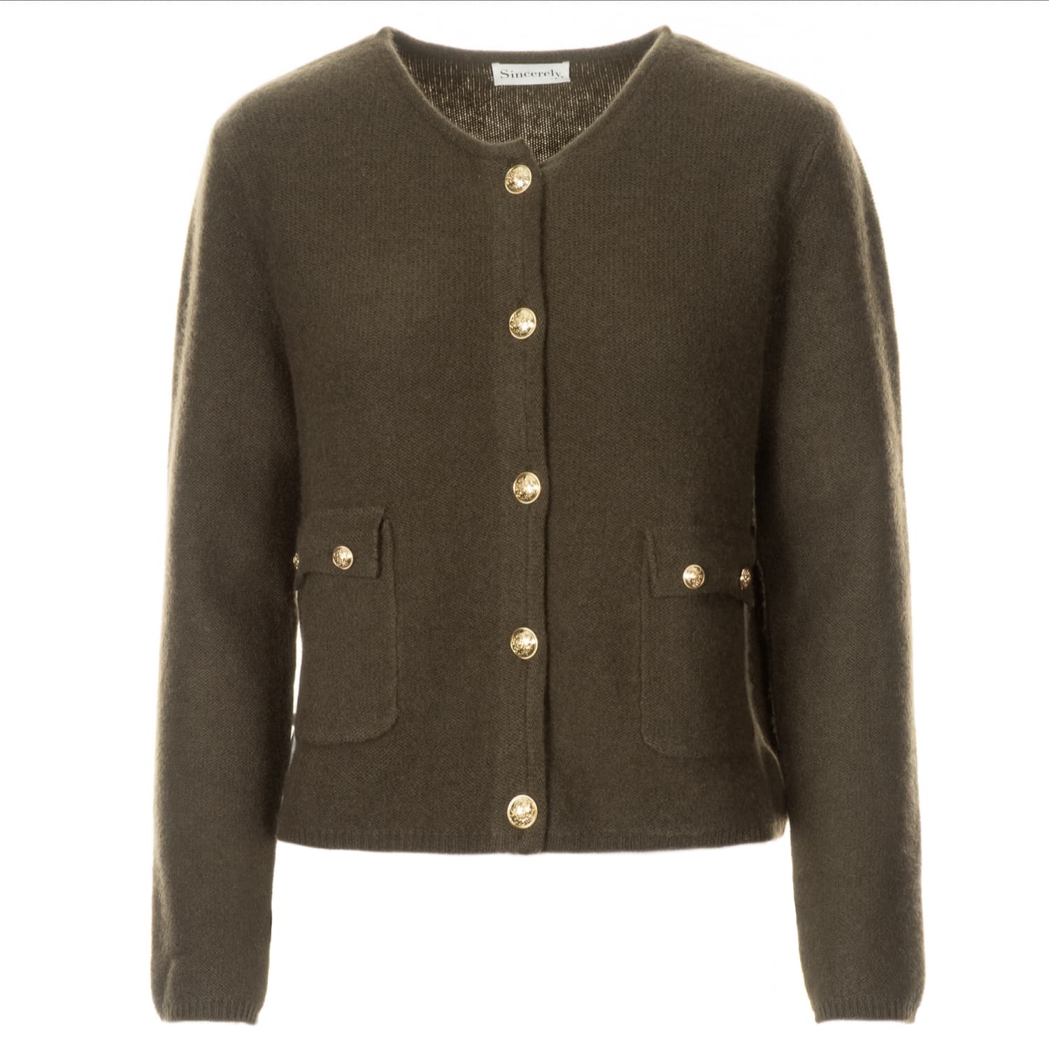 Elegant cardigan by Sincerely, crafted from a soft blend of 70% wool and 30% cashmere. The classic silhouette features a round neckline and eye-catching gold-toned decorative buttons for a refined touch. Two patch pockets with flaps underline the sophisticated character of this style. Thanks to the high-quality yarn, the cardigan is soft to the touch, warming and comfortable – perfect for feminine looks with a modern twist.