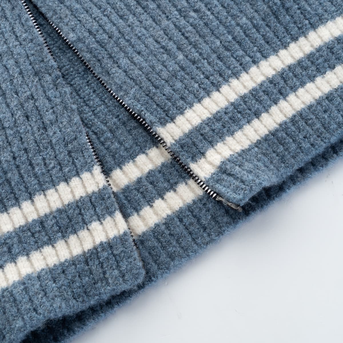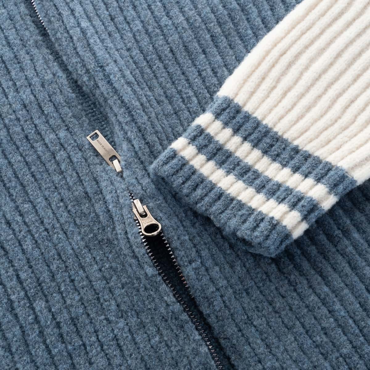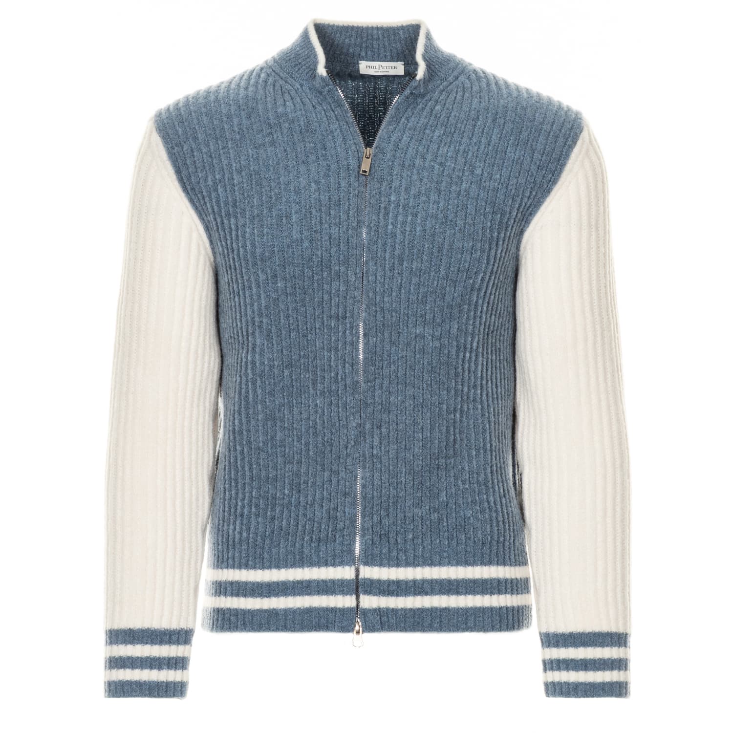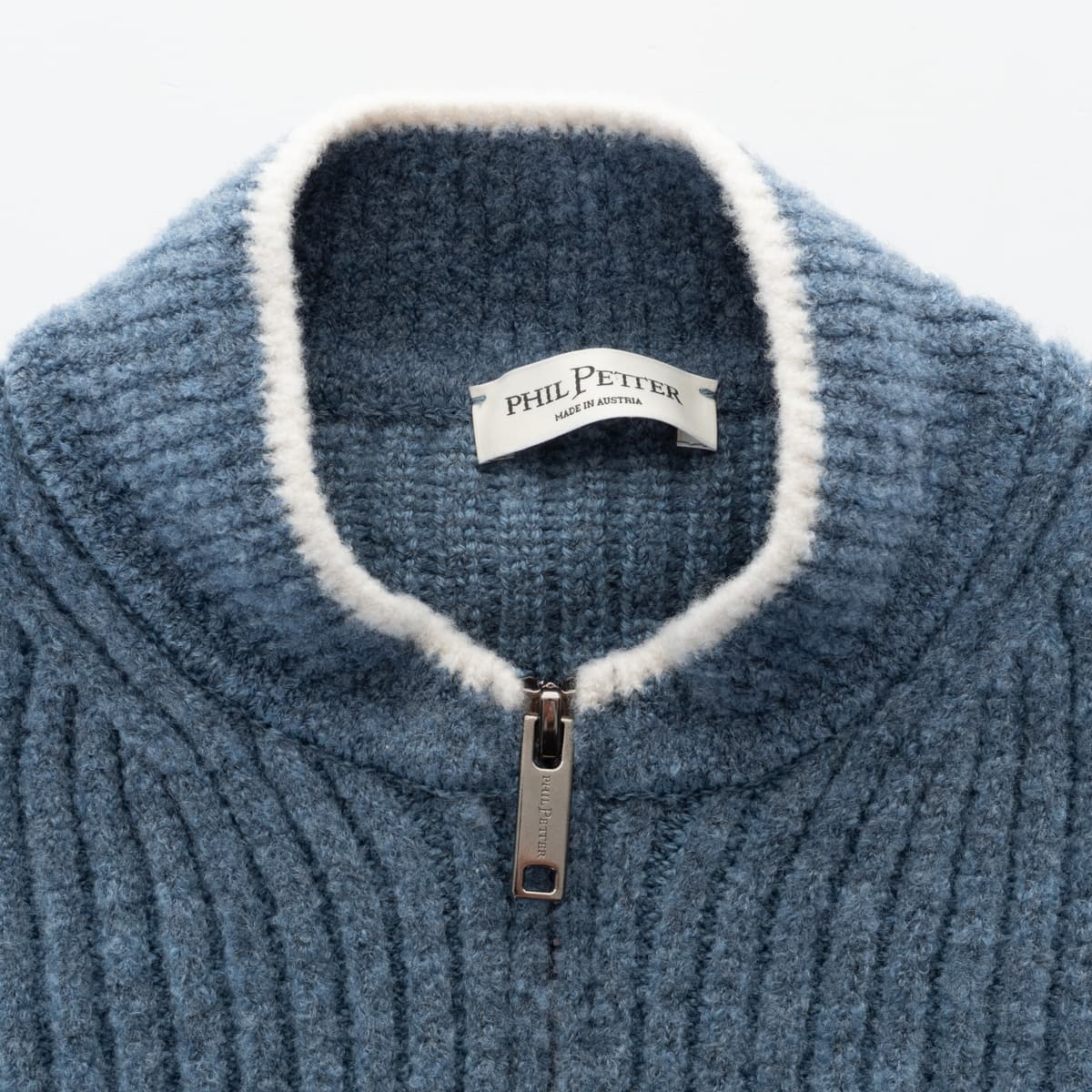 The college-style cardigan by Phil Petter combines casual sporty flair with exceptional knit craftsmanship. Made from lightweight merino bouclé yarn in a wide rib structure, this piece offers a relaxed fit and collegiate character. The outer surface features a textured bouclé look, while the inside is knitted from smooth merino wool for stability and comfort. Thanks to its multi-thread knit construction and high stitch density, the jacket retains its shape over time. Distinctive lines along the shoulders and sleeves add visual interest. A two-way Metallux zipper completes the design with functional elegance. Made in Austria.