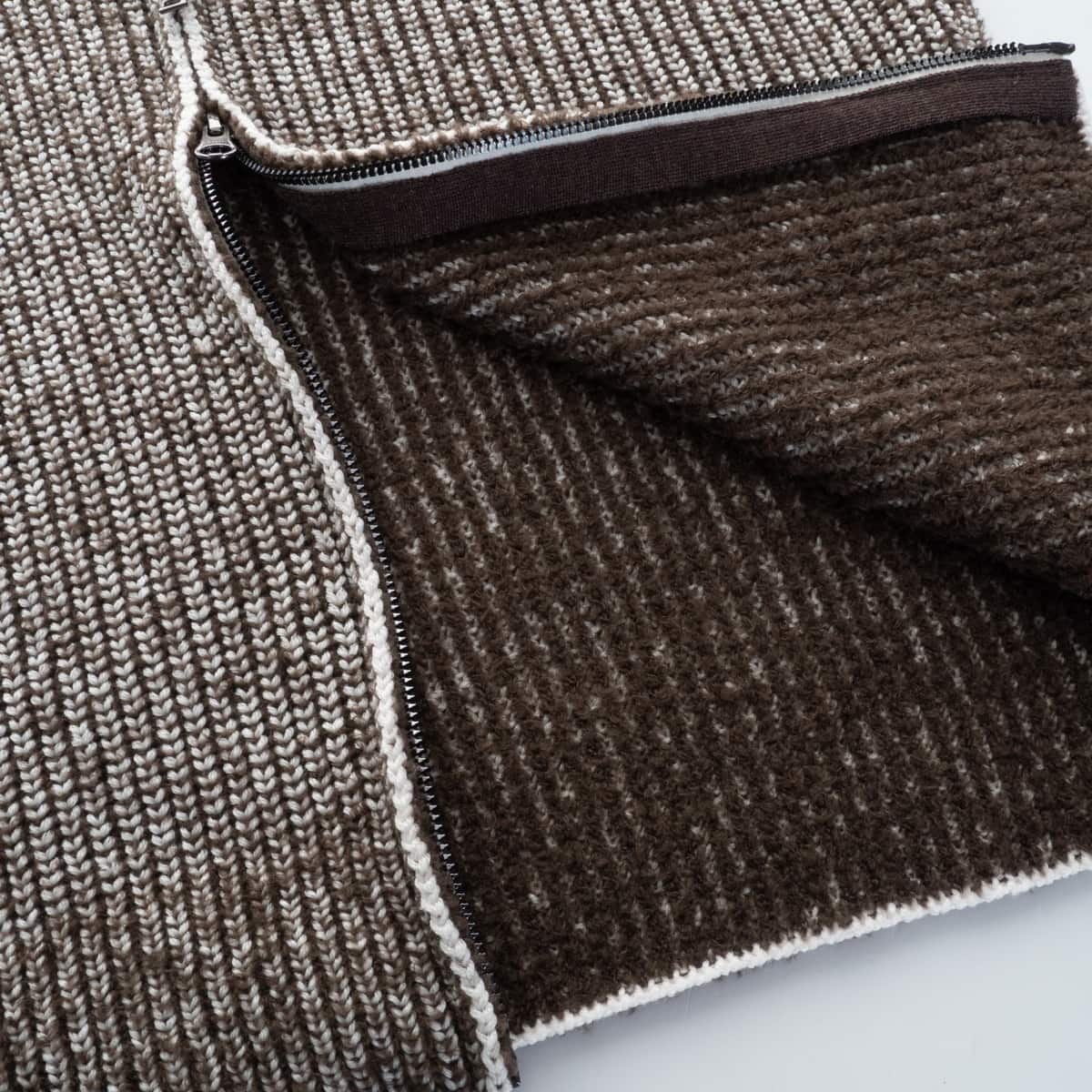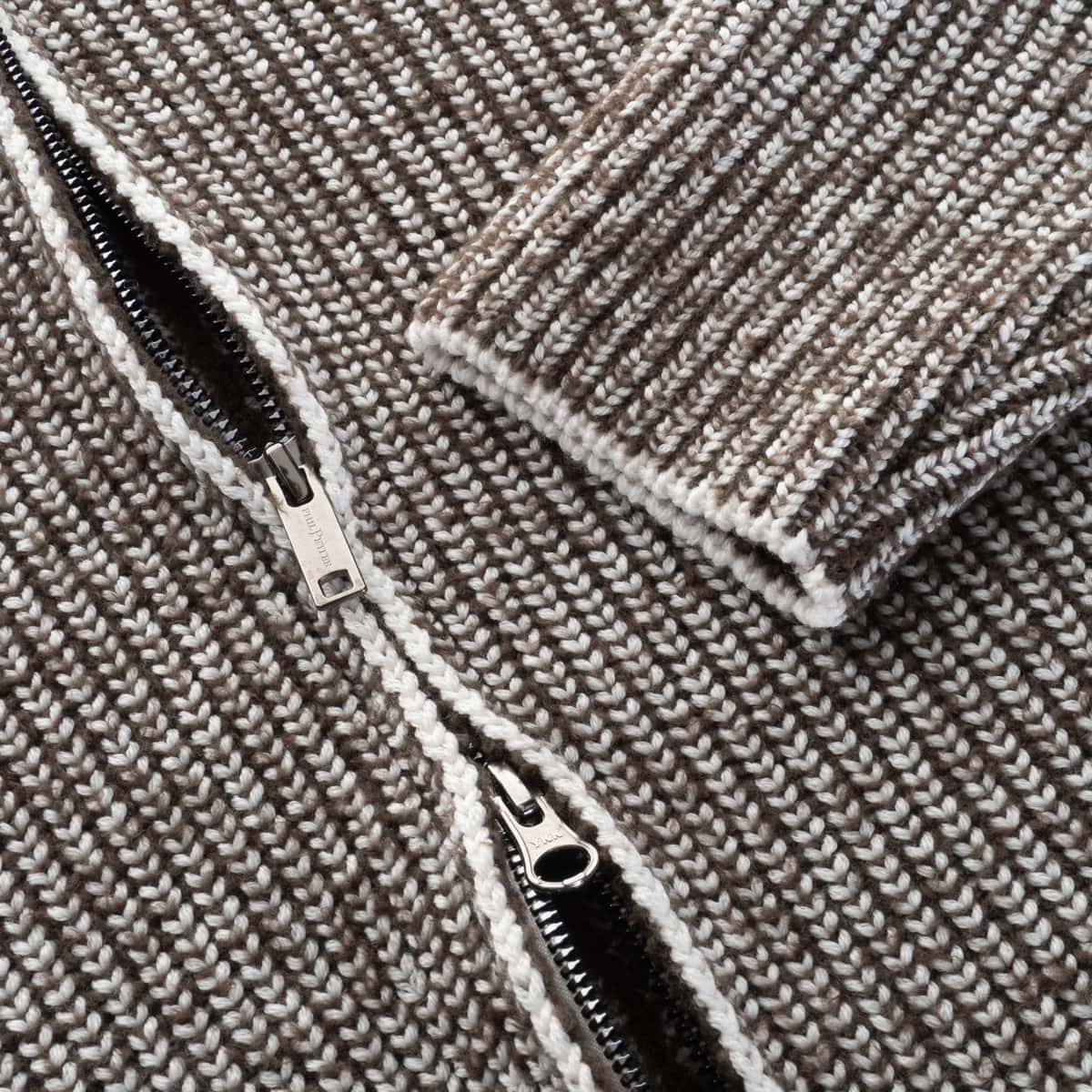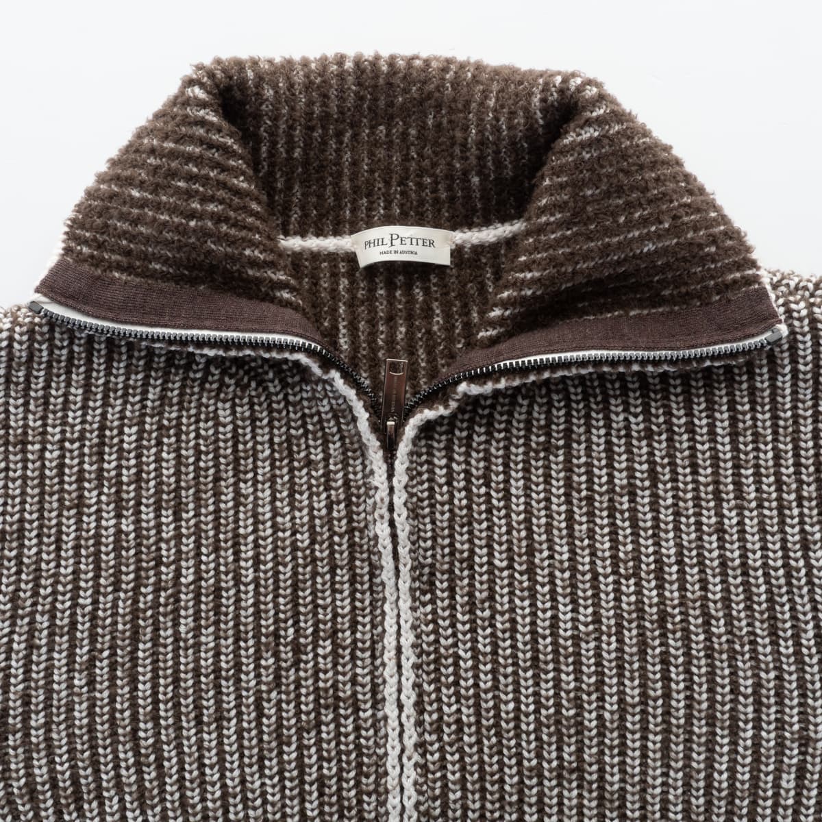 This zipped cardigan by Phil Petter impresses with its distinctive two-tone look and special knit structure. Made in Austria, it combines modern design with functional comfort. The so-called “Royal Stitch” is based on a two-tone moss stitch pattern, created by blending soft fake fur yarn with a smoother contrast yarn. This results in a unique visual effect with depth and structure.