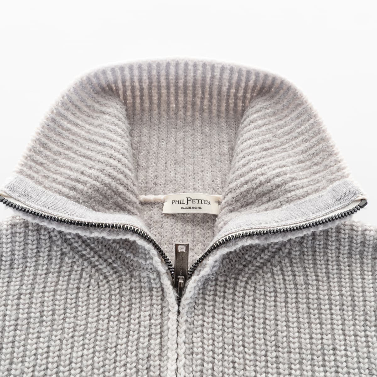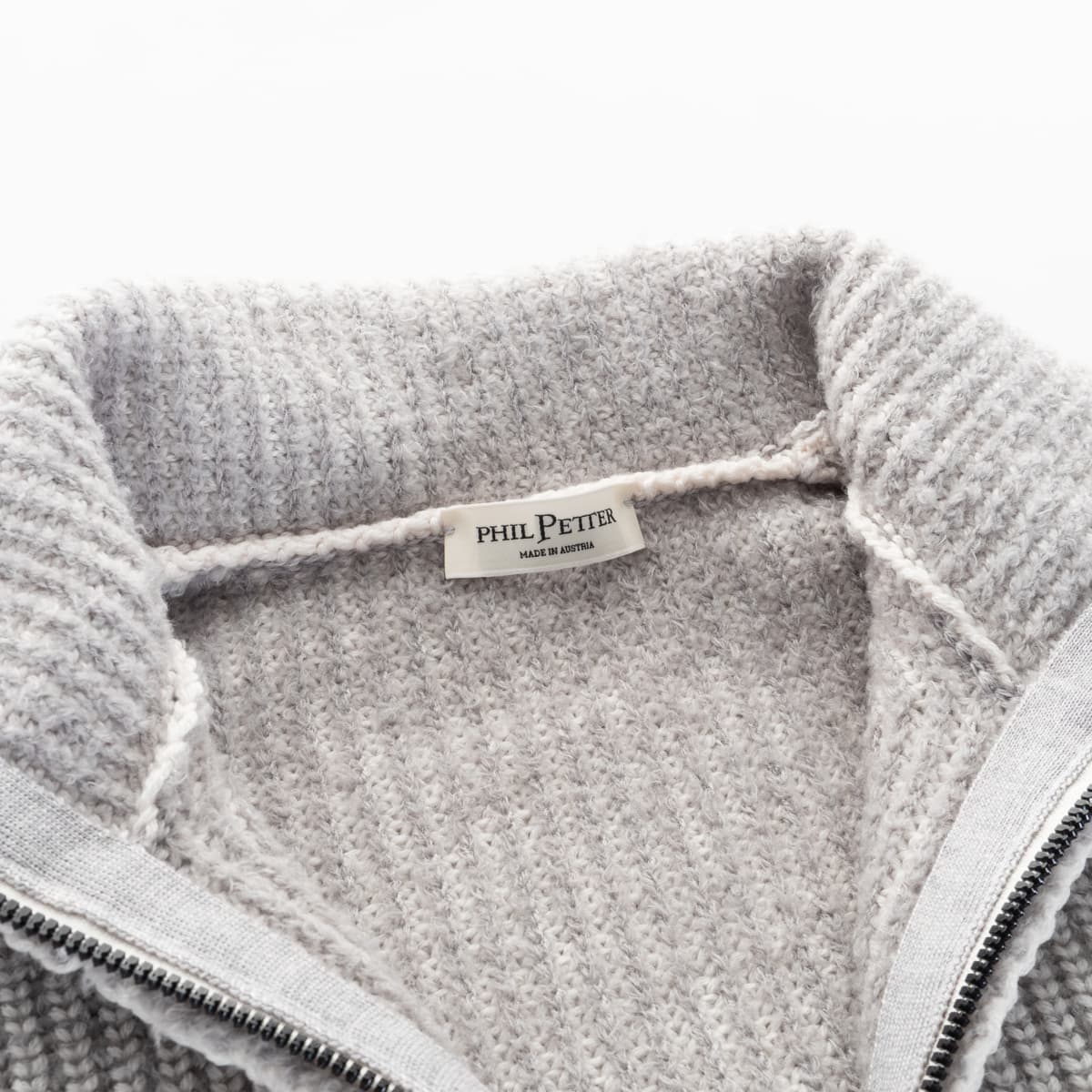 This zipped cardigan by Phil Petter impresses with its distinctive two-tone look and special knit structure. Made in Austria, it combines modern design with functional comfort. The so-called “Royal Stitch” is based on a two-tone moss stitch pattern, created by blending soft fake fur yarn with a smoother contrast yarn. This results in a unique visual effect with depth and structure.