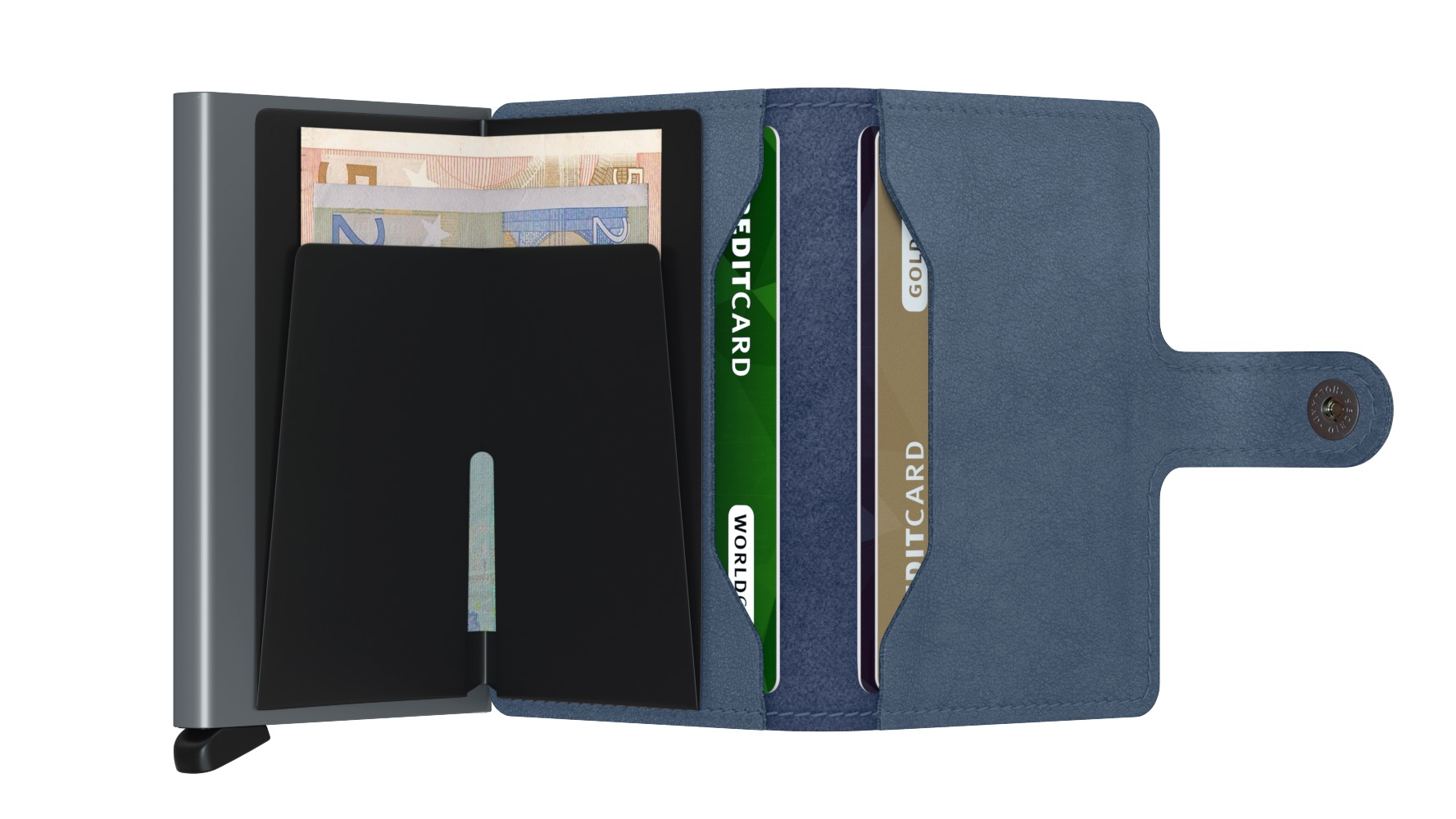The Miniwallet is compact in size, but offers a surprising amount of space. It is available in a variety of styles and colours and fits in any pocket. The patented mechanism allows access to your cards with a single movement, so they're ready to go. The aluminum protects against bending, breaking and unwanted mobile communication.