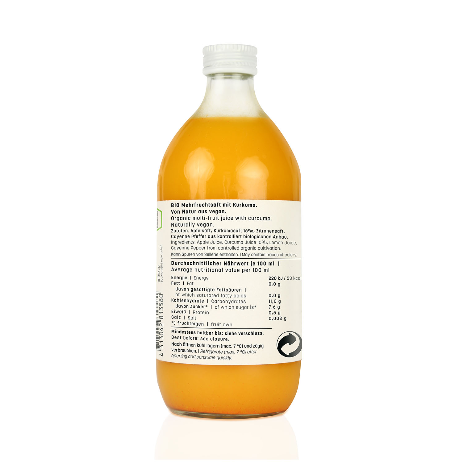 Ingredients: Apple juice 76.3%, turmeric juice 16%, lemon juice 7.6%, pepper from certified organic cultivation.