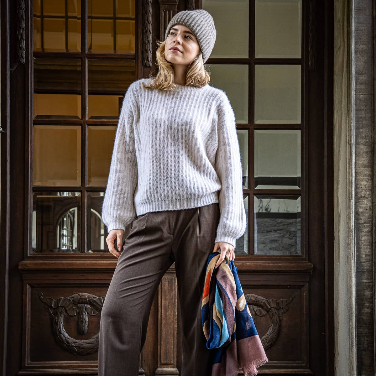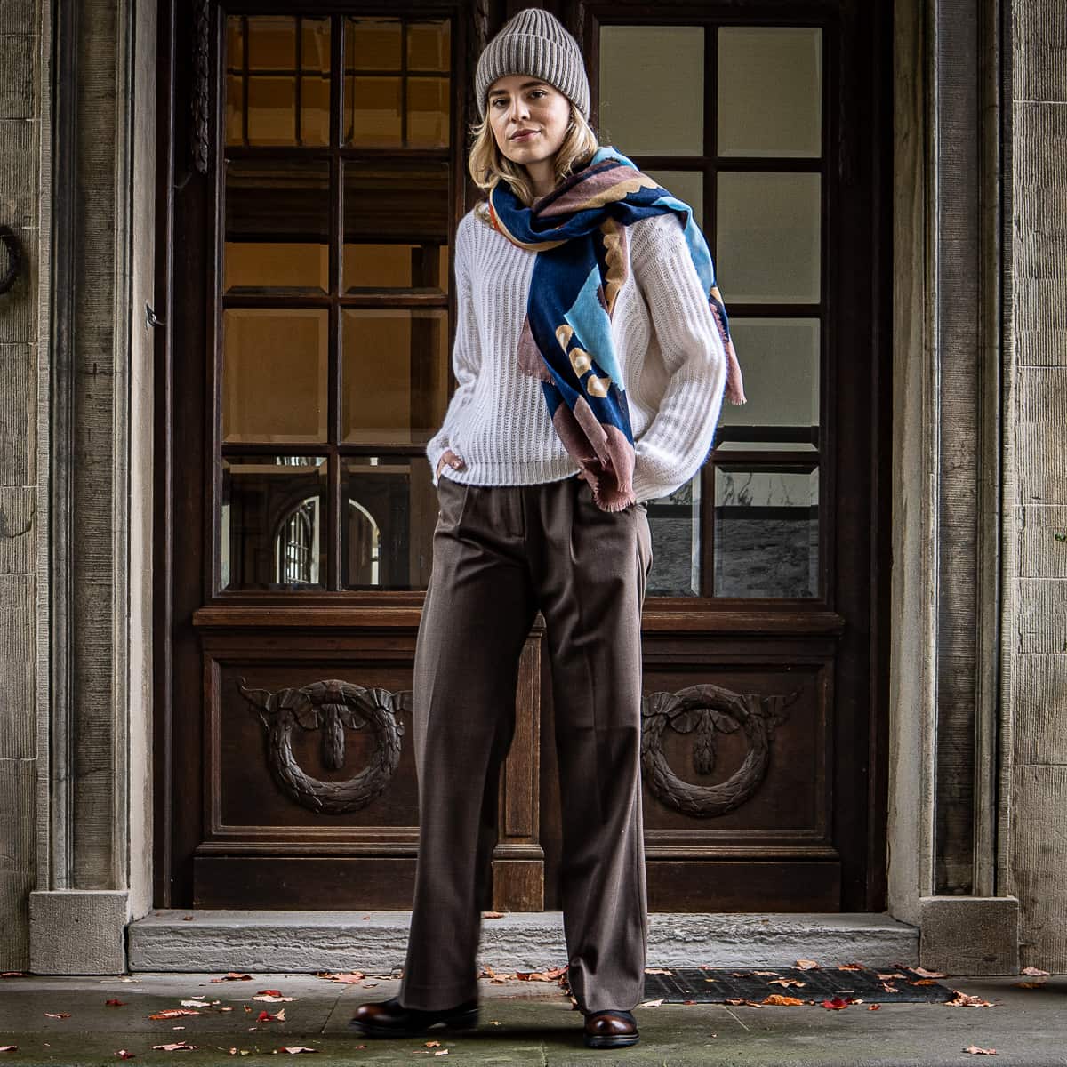 This stylish scarf is made of pure new wool. The knit is airy & light and perfect for mild summer evenings.