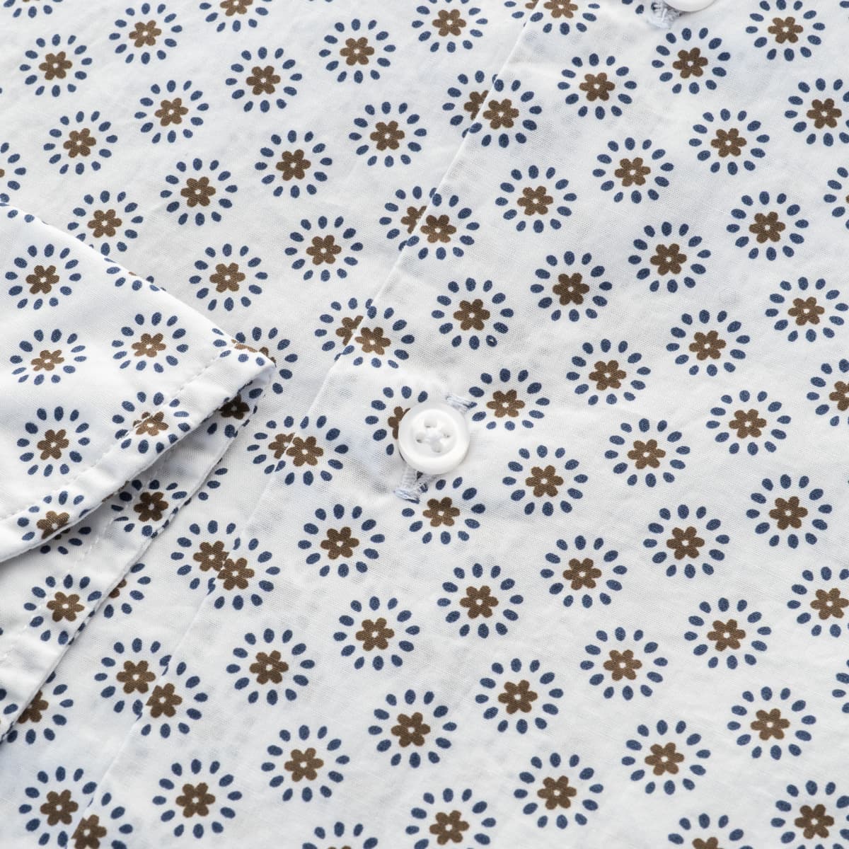 - All-over floral pattern in blue/brown on white