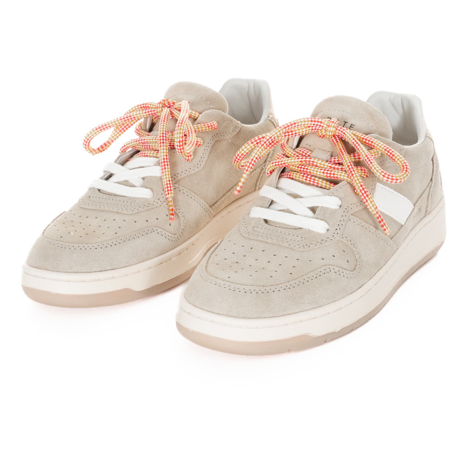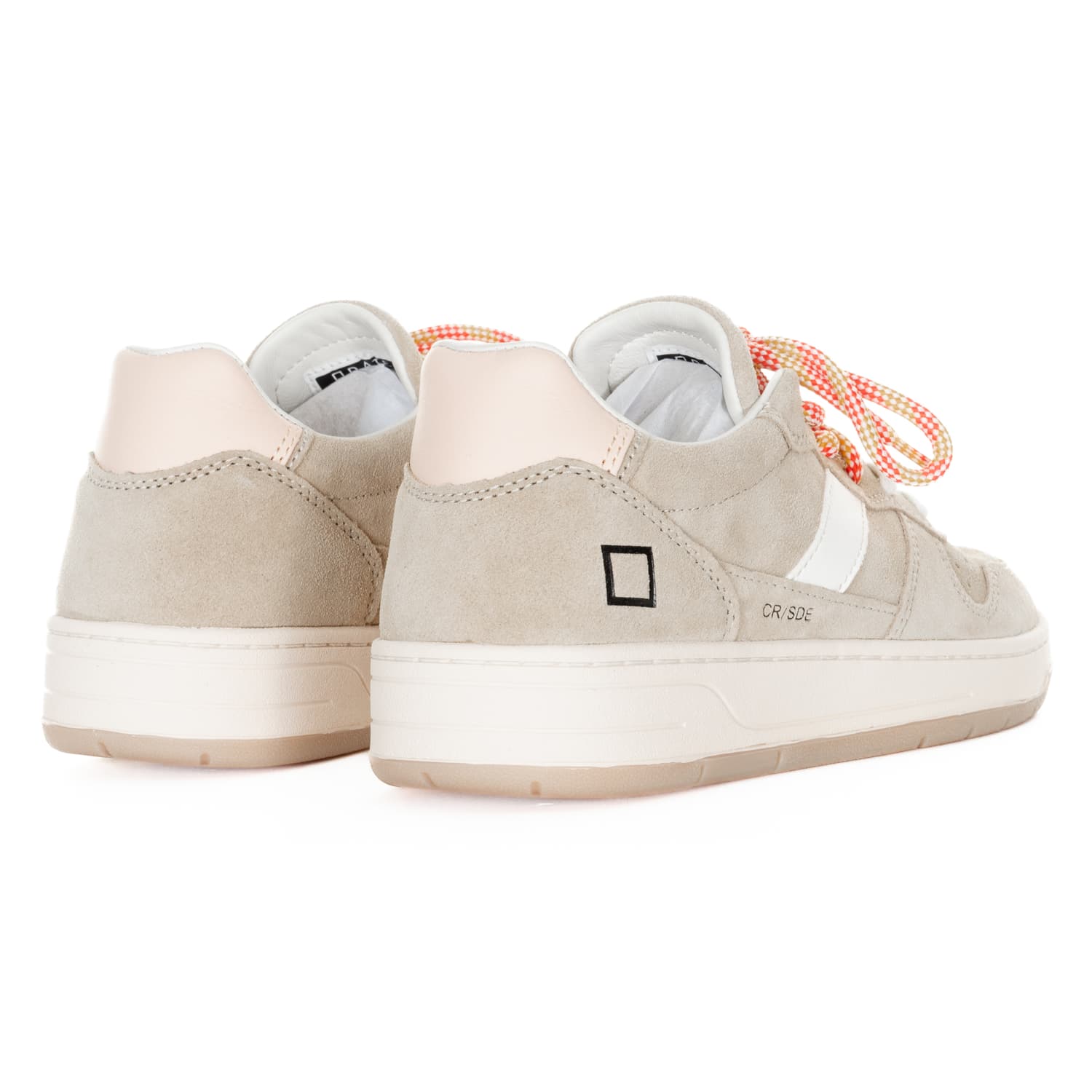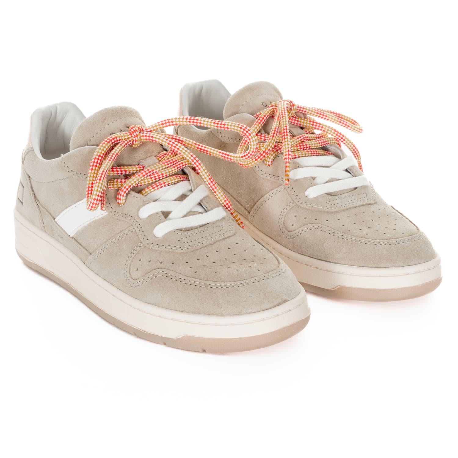 DATE Court 2.0 Suede Sand sneakers crafted from premium suede leather with a contrasting nappa leather side stripe. These shoes feature a perforated toe cap for breathability, comfortable leather and cotton terry lining, and a raised insole for enhanced wearability. Signature details include multicolored laces, engraved side logo with code, and a pink leather heel patch for a distinctive look.