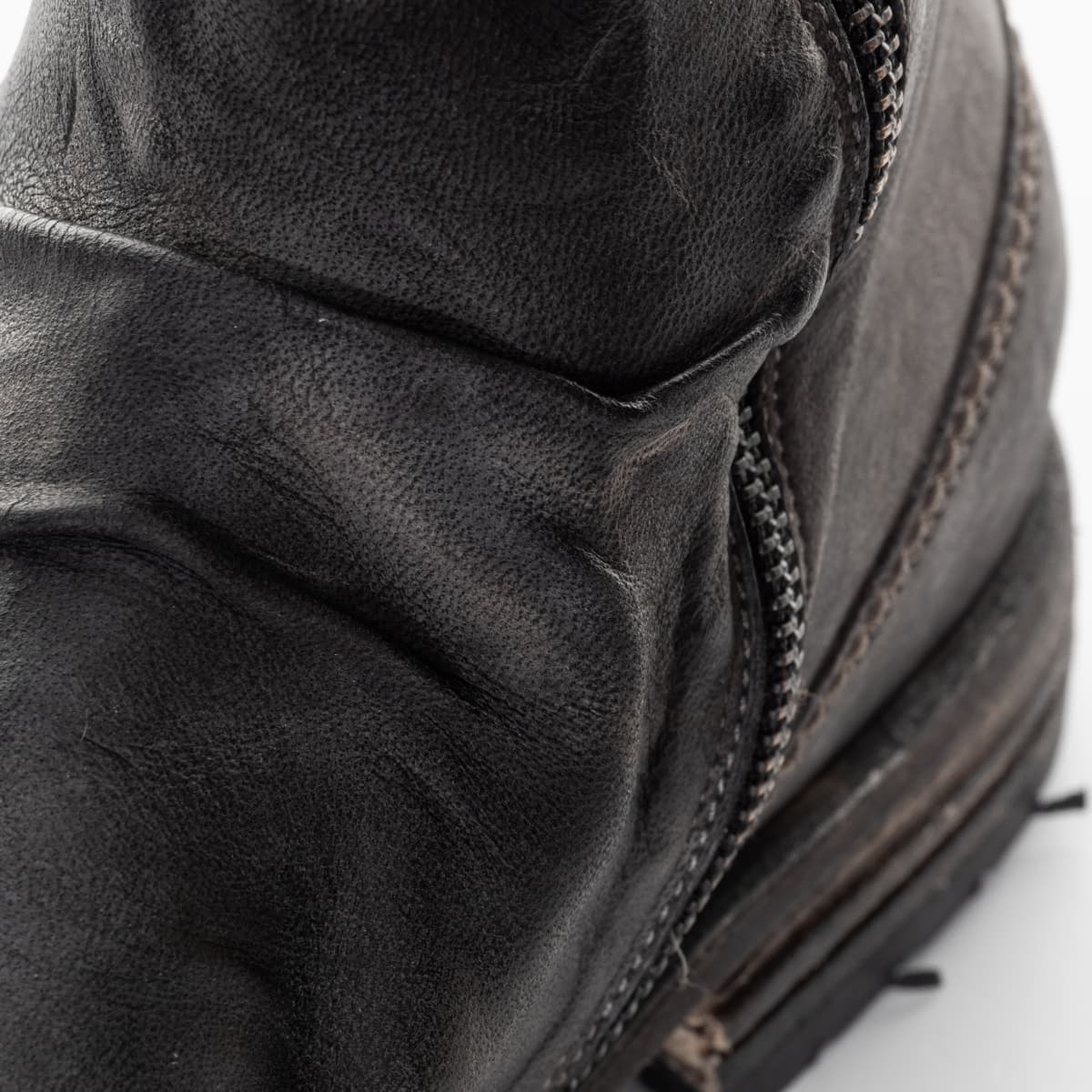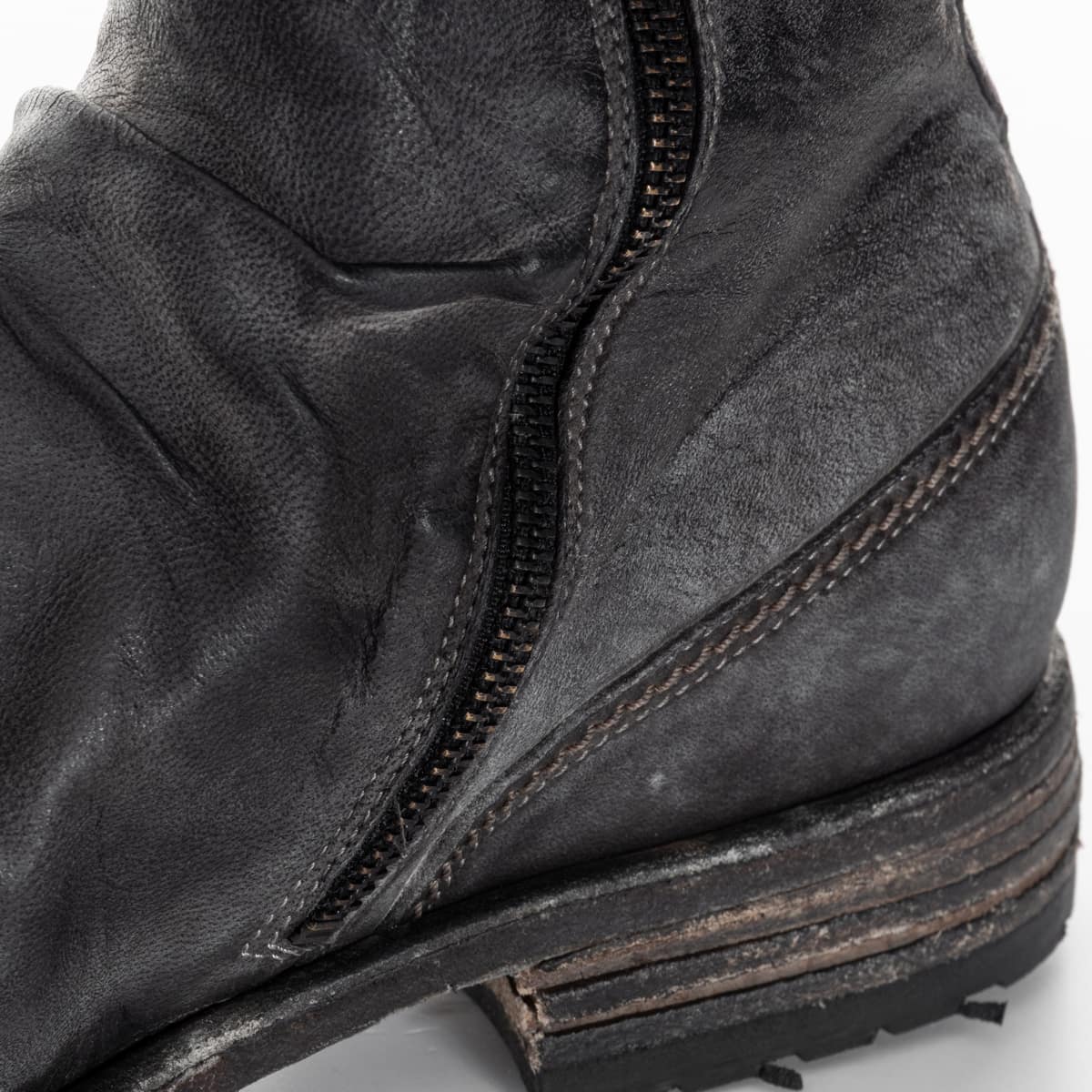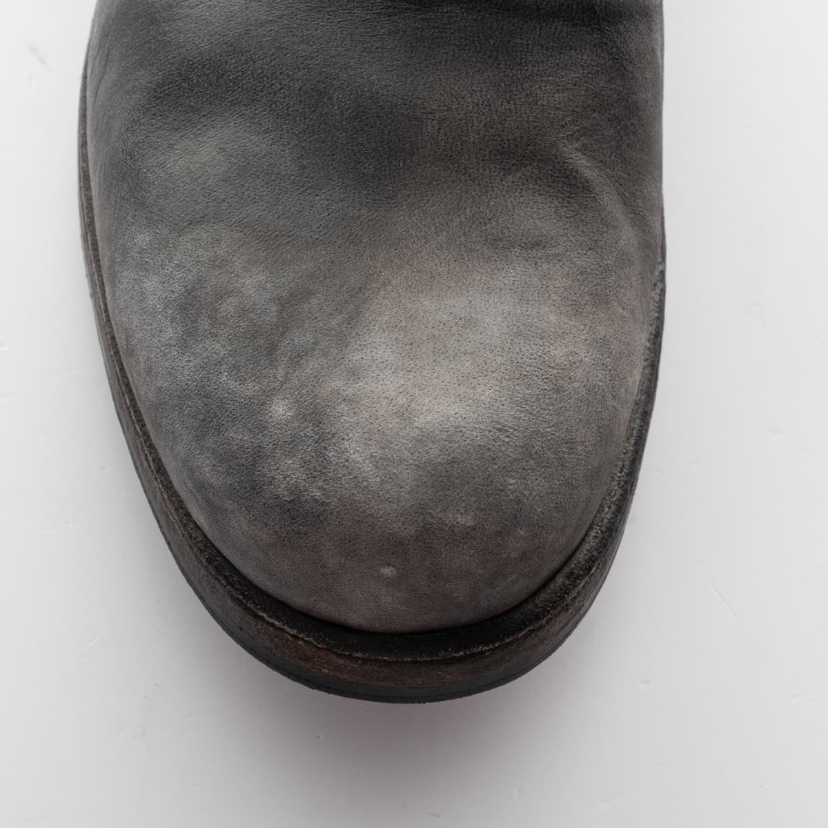 The 50268 from Shoto is made of deerskin and is completely dipped into a special tincture and then washed. The aim is not to wash out the paint completely, but rather to let it blurr out. Here it is the "high art" to wash the leather in such a way that it does not become stiff. The "Caos" treatment makes the shoe lighter in the front at the tip and in the back at the heel than in the middle. Thus the beautiful different grey tones develop with this model. Then the shoe is stuffed with paper and dried slowly in the air.