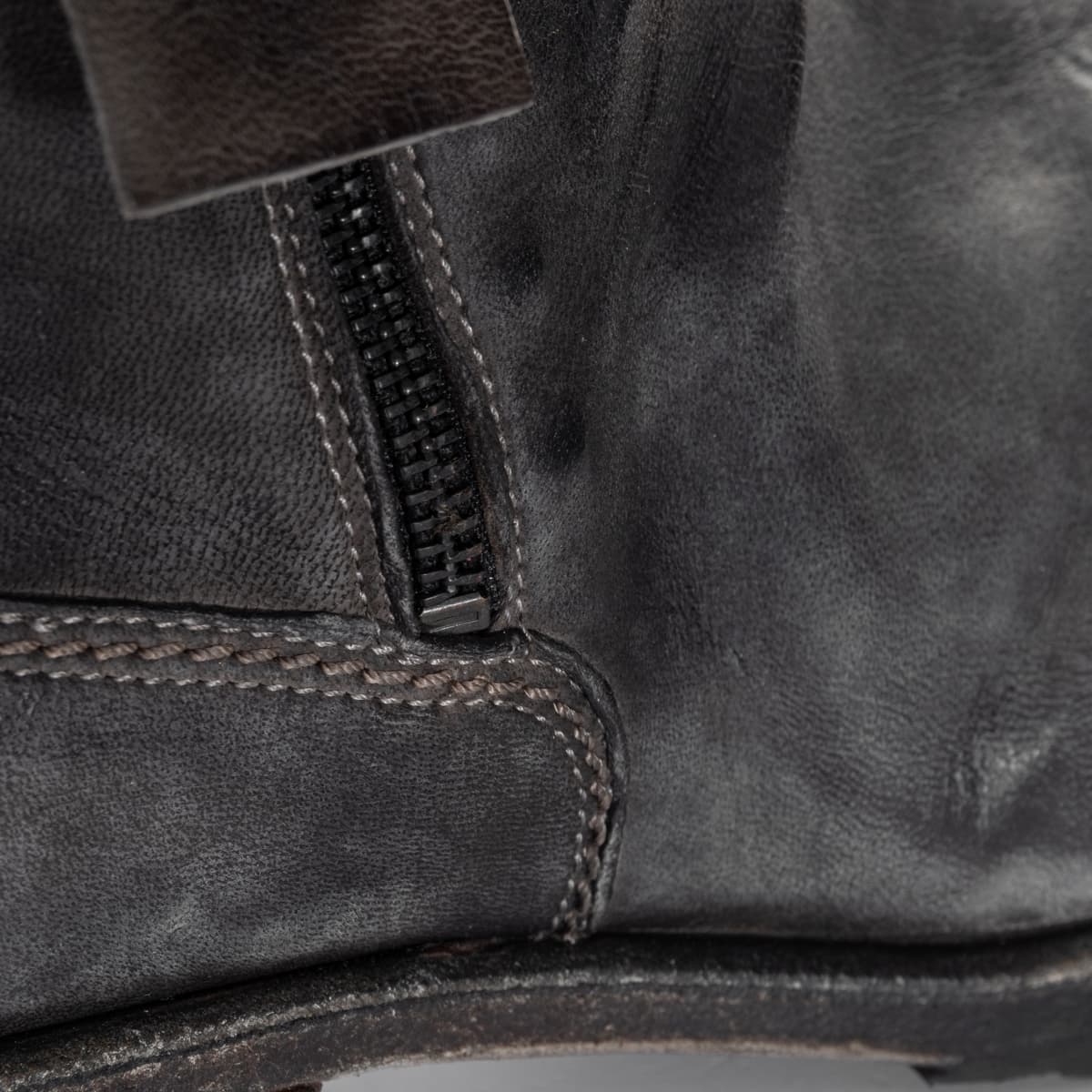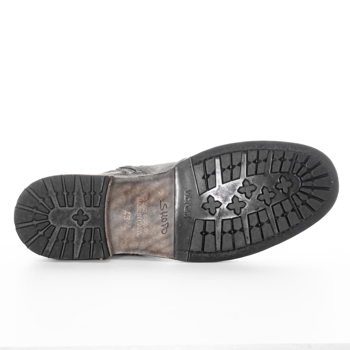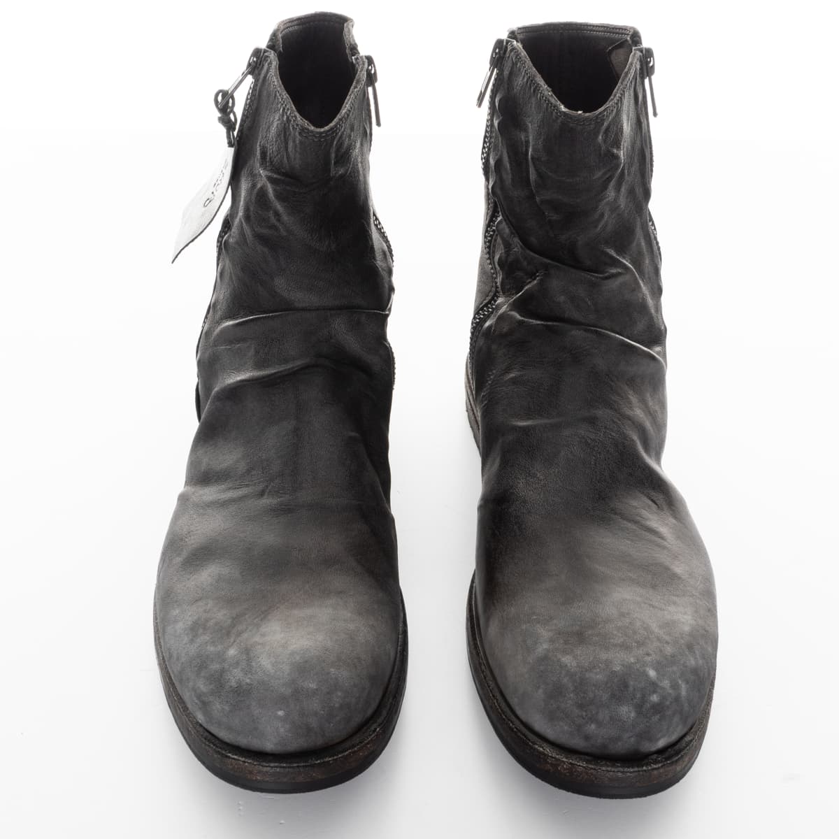 The 50268 from Shoto is made of deerskin and is completely dipped into a special tincture and then washed. The aim is not to wash out the paint completely, but rather to let it blurr out. Here it is the "high art" to wash the leather in such a way that it does not become stiff. The "Caos" treatment makes the shoe lighter in the front at the tip and in the back at the heel than in the middle. Thus the beautiful different grey tones develop with this model. Then the shoe is stuffed with paper and dried slowly in the air.
