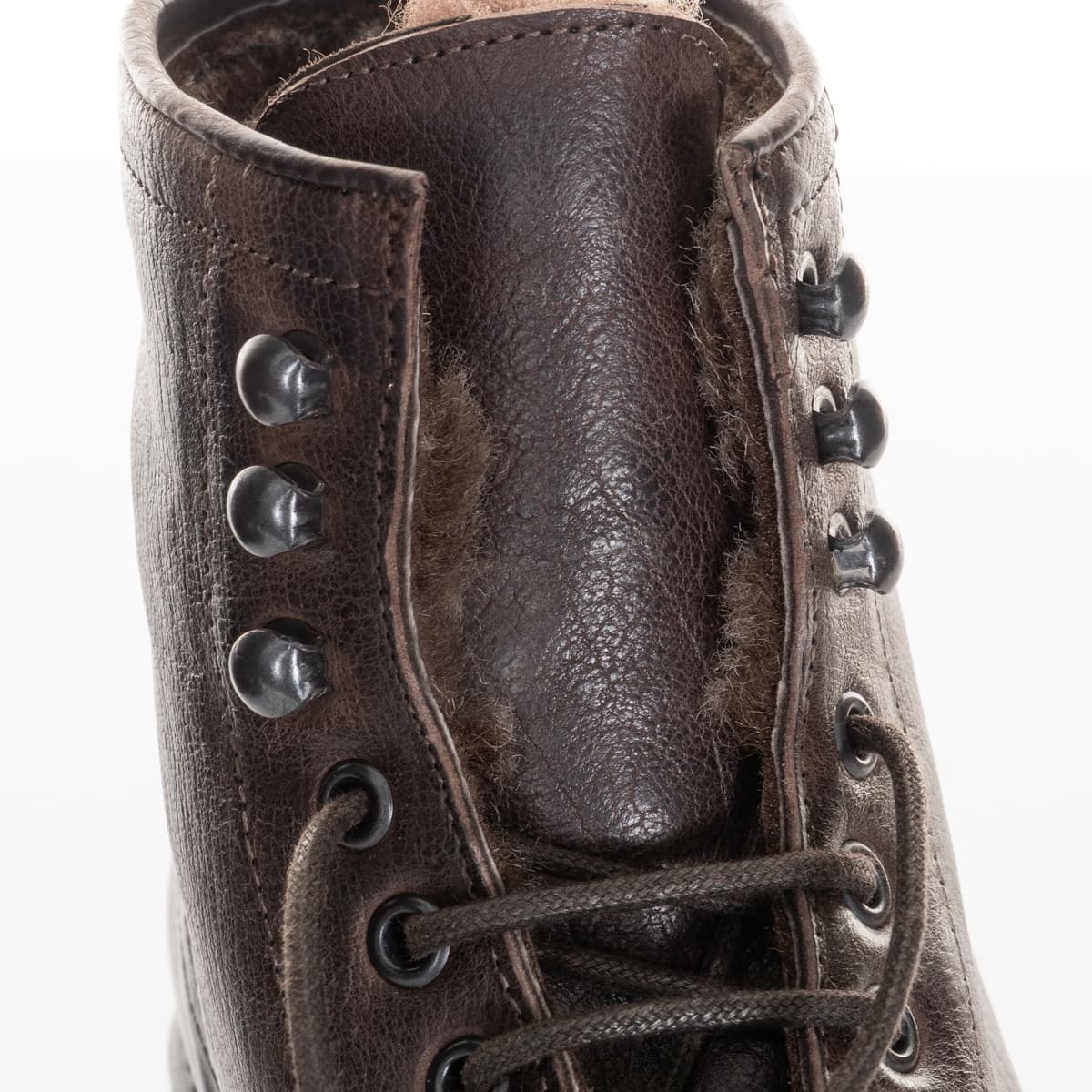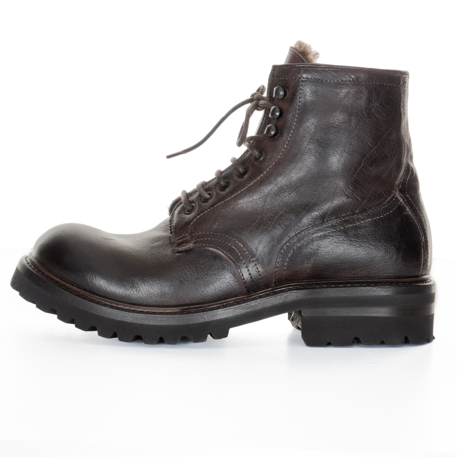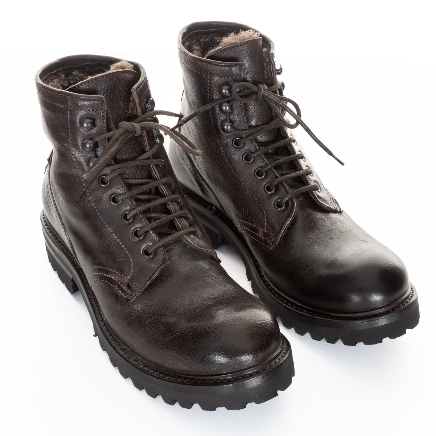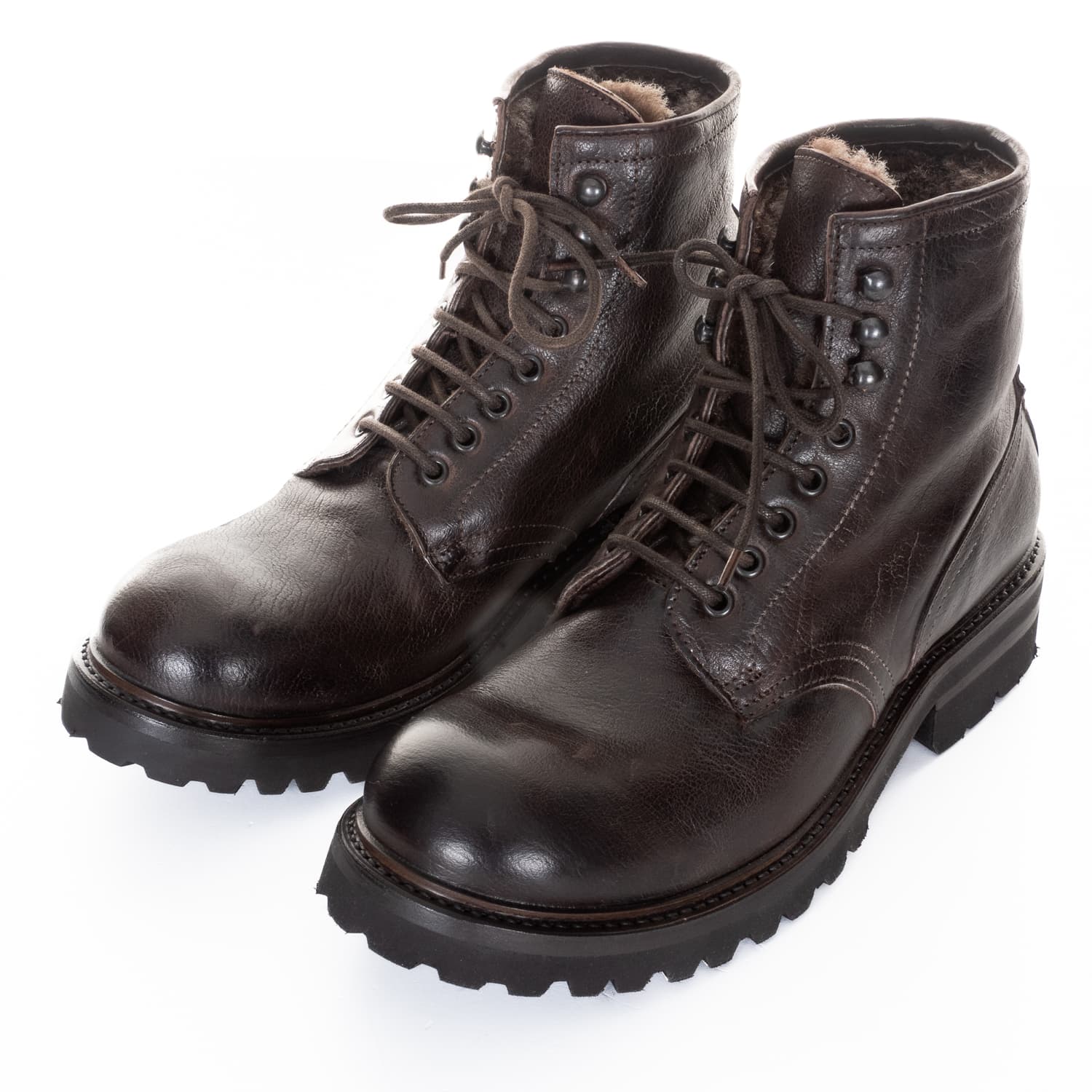 Masculine Shoto men's boots made from high-quality calfskin, lined with soft lambskin and featuring a sturdy treaded sole. This model combines classic craftsmanship with functional winter comfort: the warm lambskin interior provides pleasant insulation on cool days, while the treaded rubber sole offers a secure grip on varying surfaces. The traditional lacing with metal eyelets underlines the authentic, durable character of these outdoor-inspired shoes.