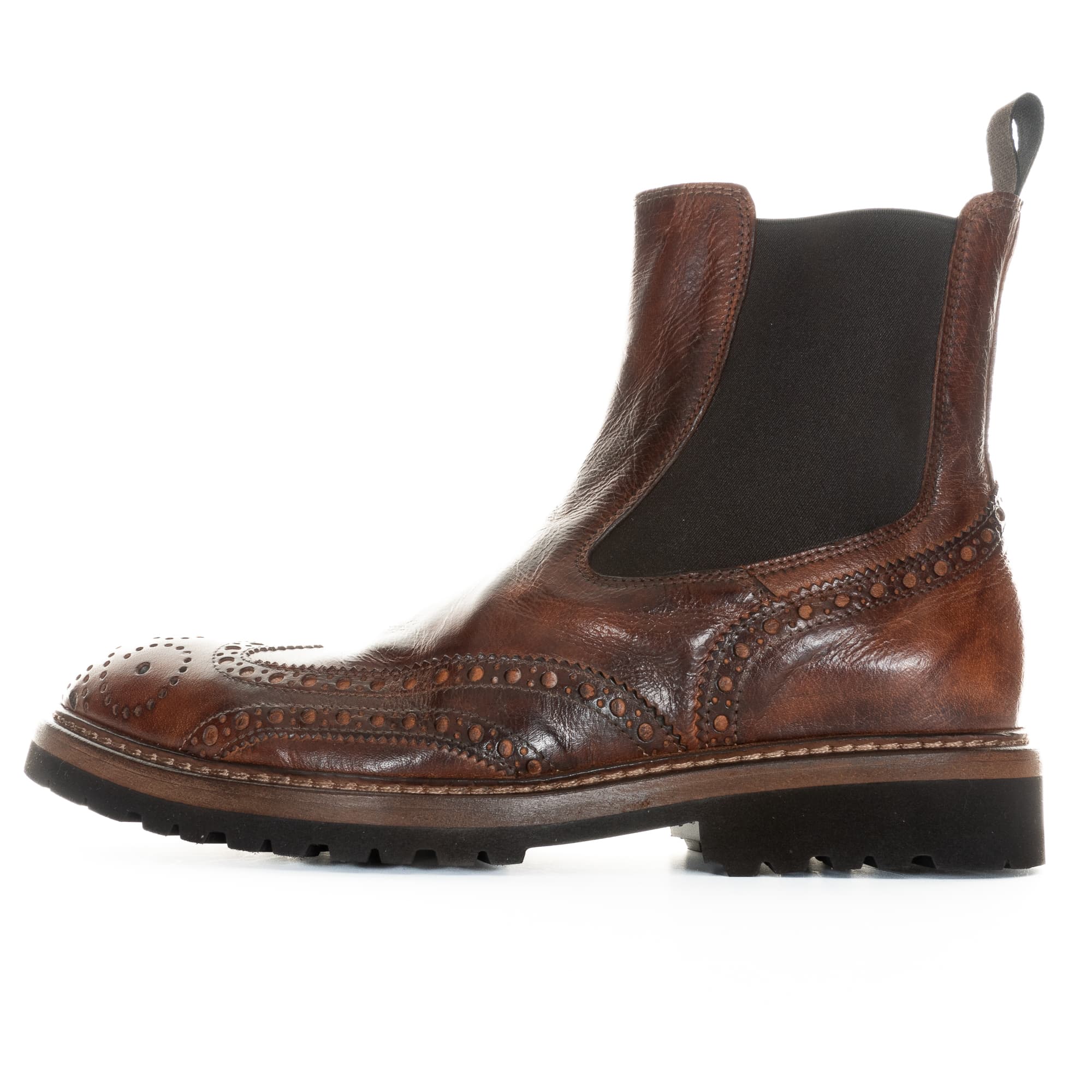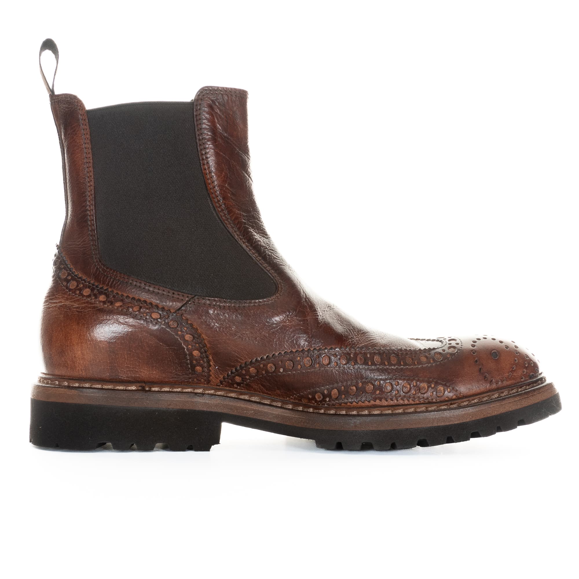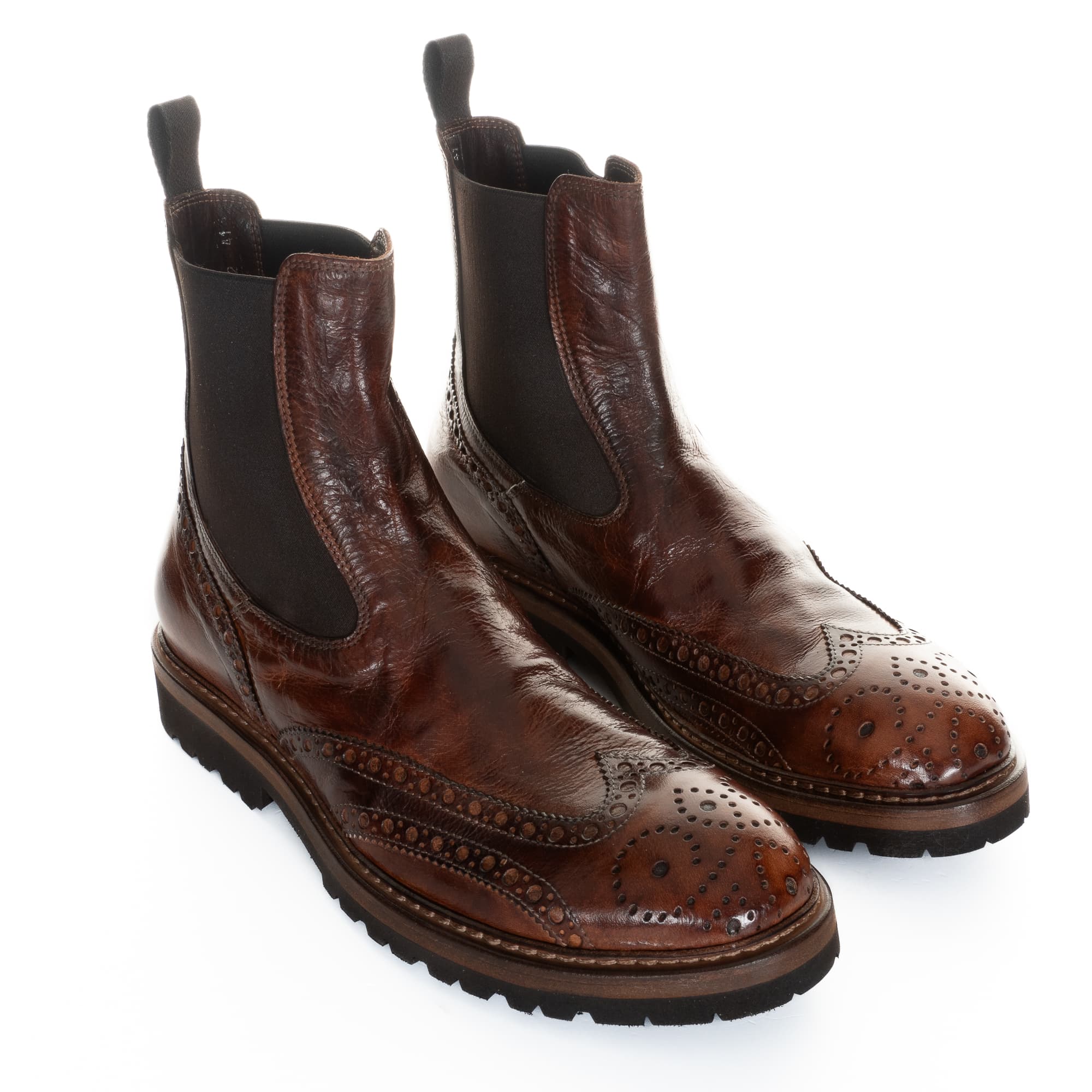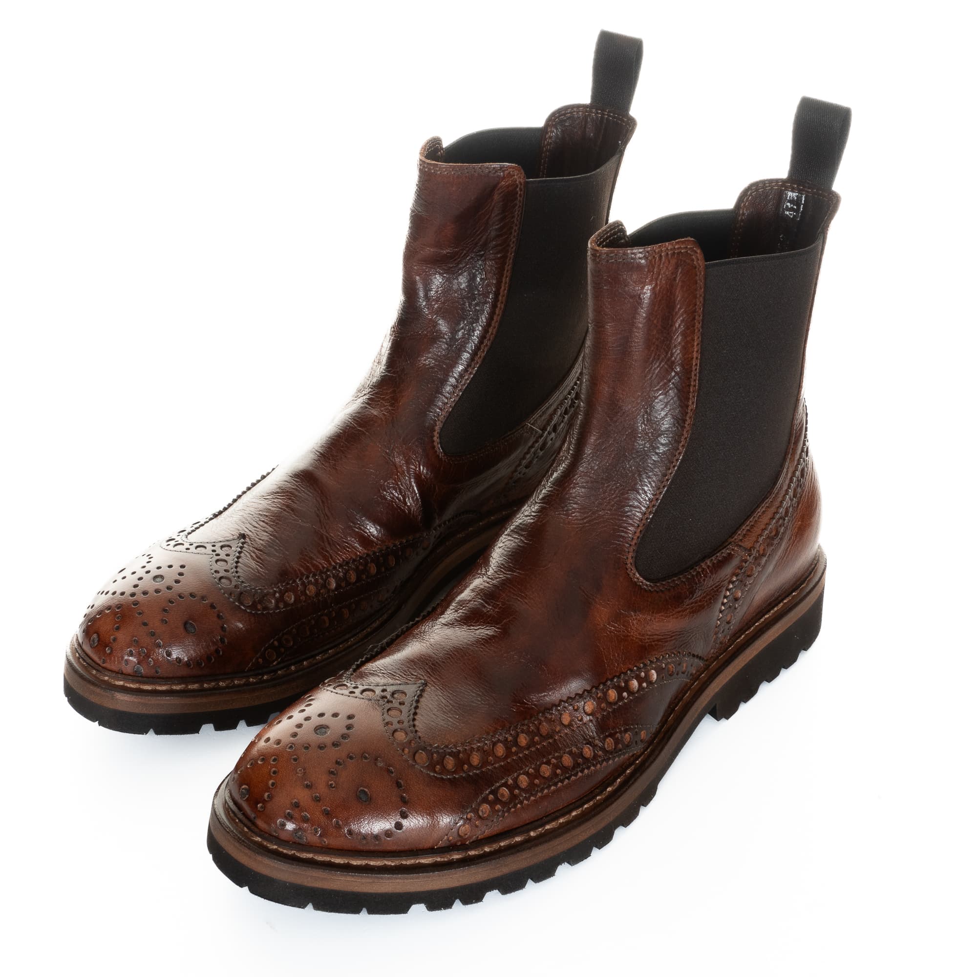 Exclusive Chelsea boot made from high-quality buffalo leather in elegant brown with a striking caos finish that highlights stylish colour changes on the toe and heel. The shoe is accentuated by a brogue on the toe cap and back. A practical pull tab on the shaft and stretch inserts at the sides ensure a high level of comfort. Equipped with a lightweight and robust Vibram Vi-Lite sole, the shoe offers optimum grip and flexibility. Precisely manufactured in Italy. Note: The shoe is approx. one size larger - size 42 is recommended for size 43.