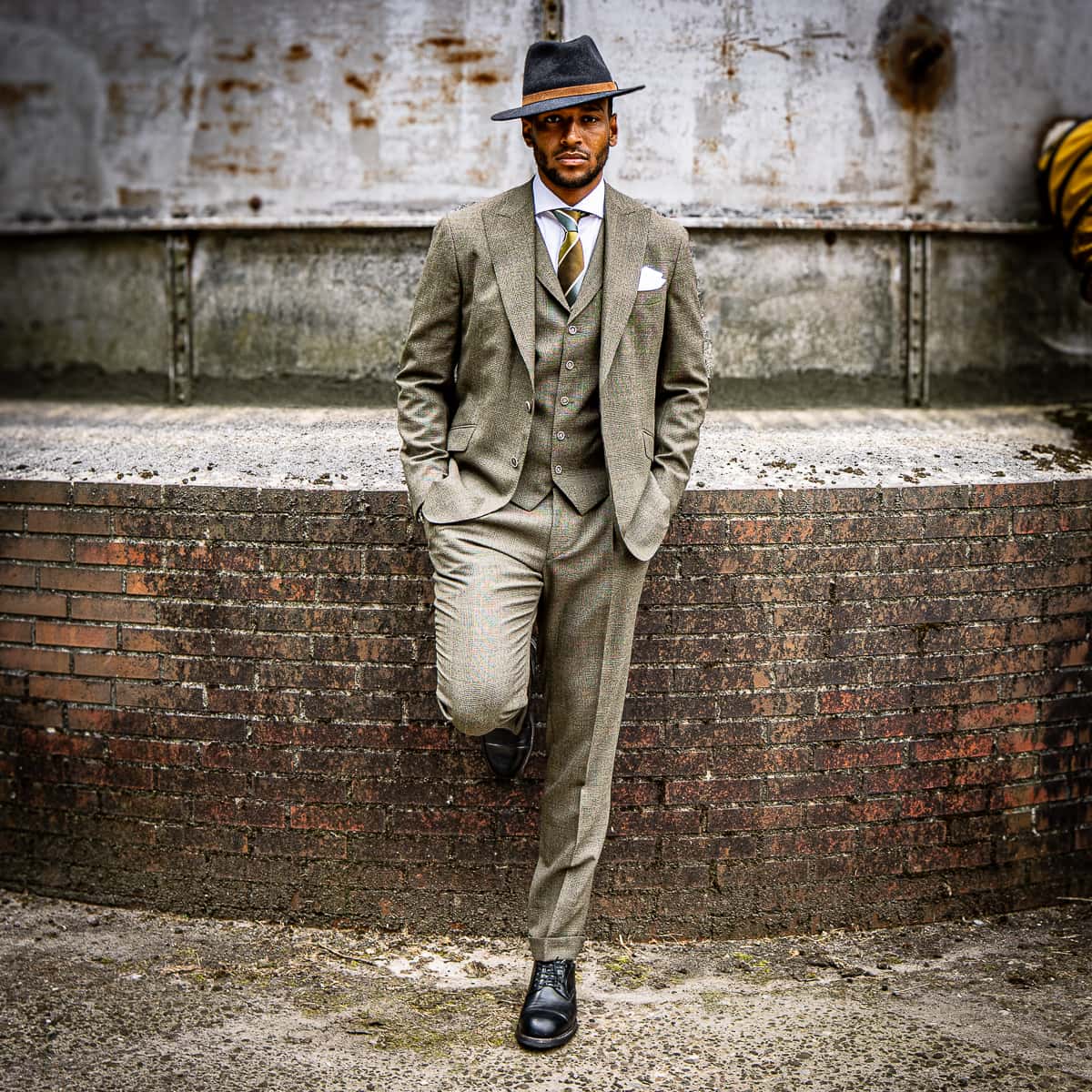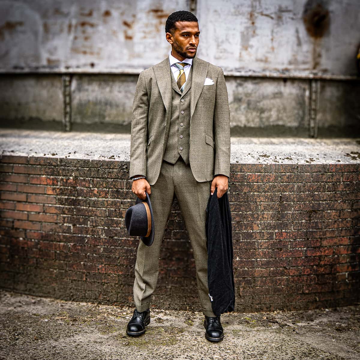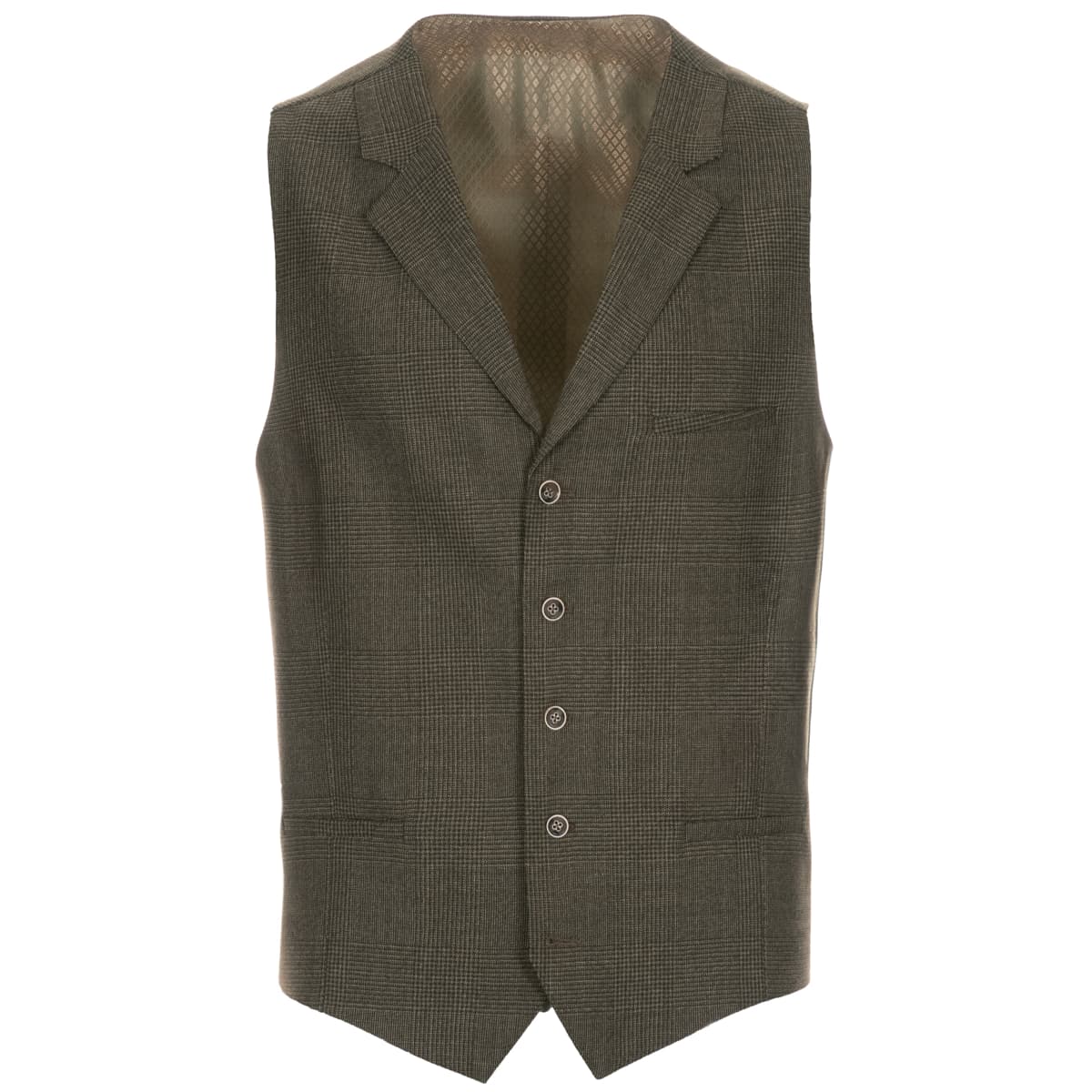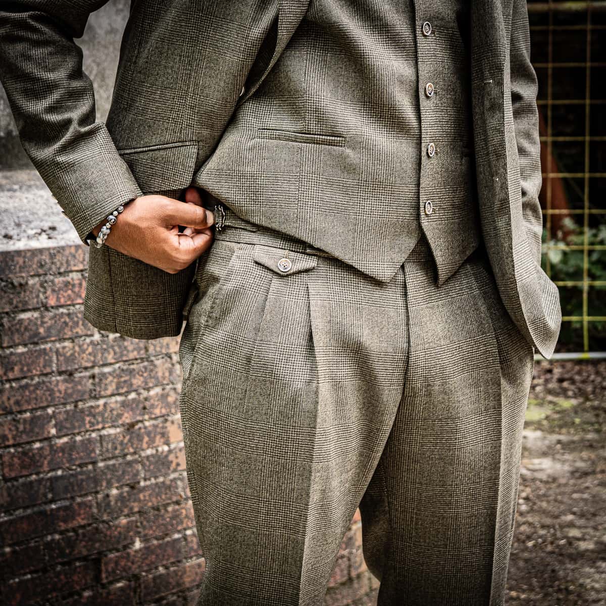 Elegant three-piece suit in a classic glencheck pattern in stylish olive khaki. The jacket features fine details such as kissing buttons, two back slits and functional pockets, an inside coin pocket and its unlined finish. The matching waistcoat features a subtle diamond pattern in the lining and an adjustable back strap for a perfect fit. The trousers with pleats, turn-ups and practical coin pockets harmoniously round off the ensemble - a timeless look with a modern twist.
