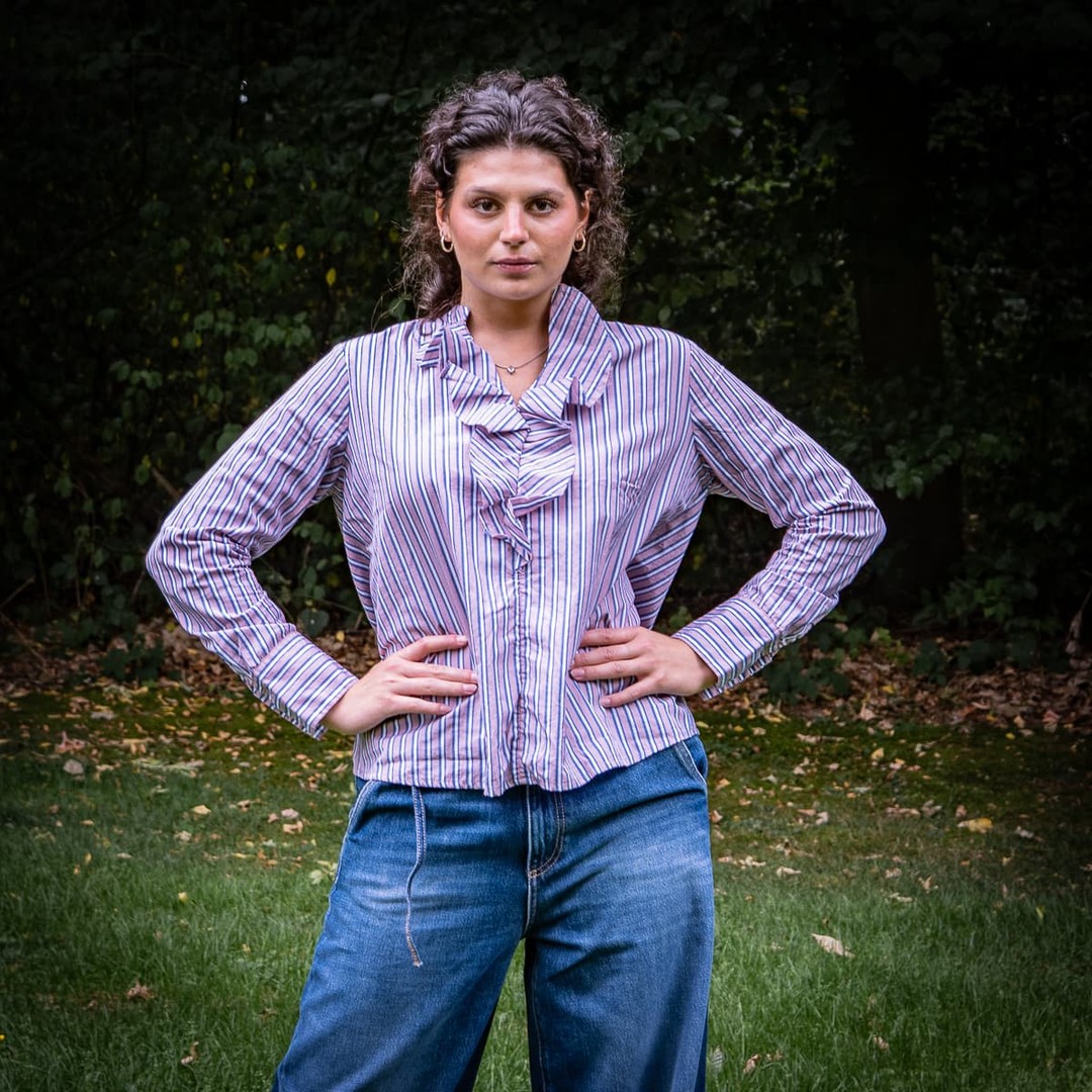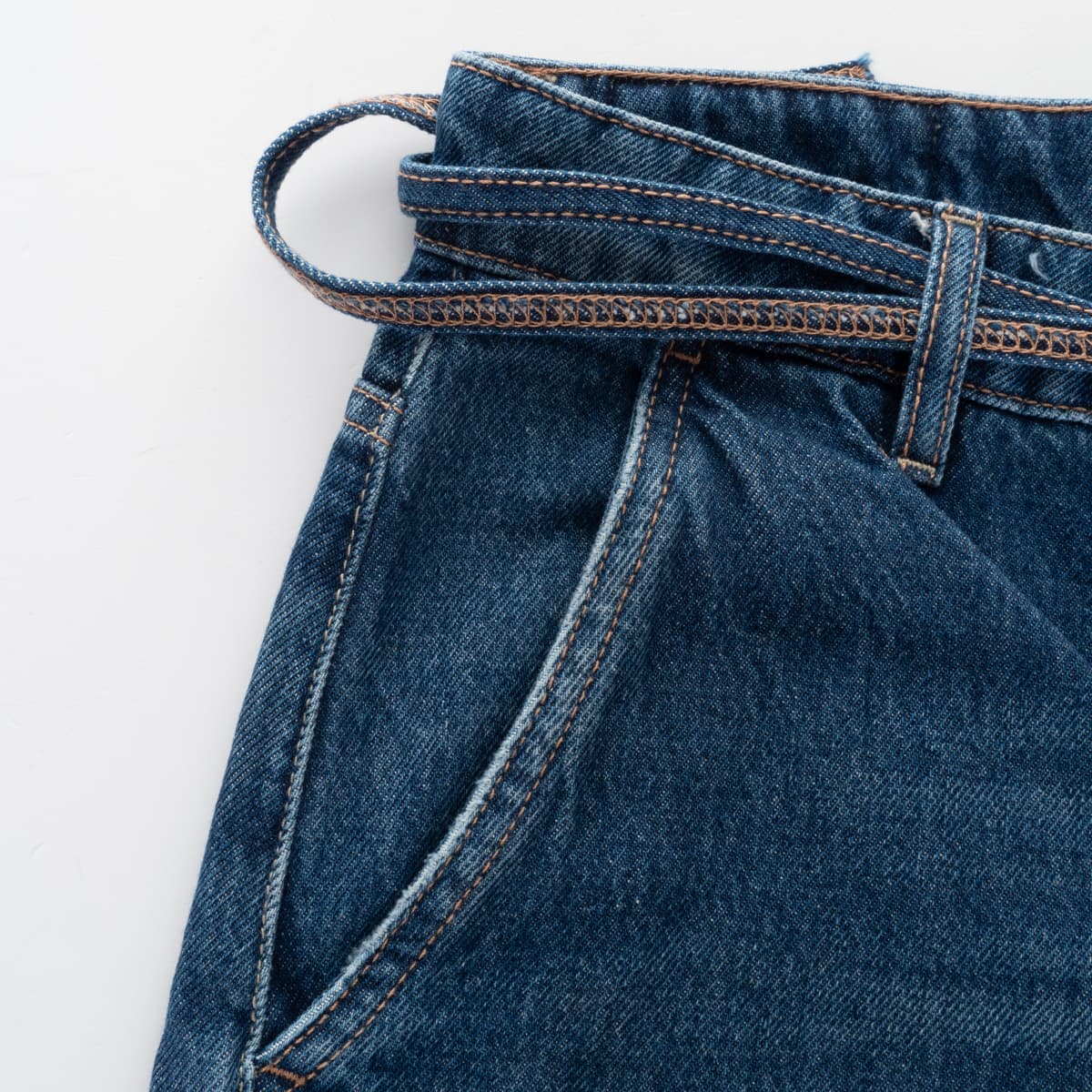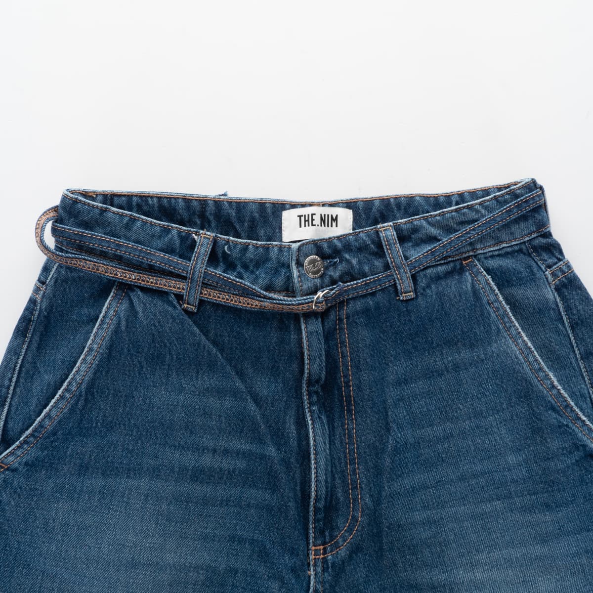 The “Amy” wide-leg pants by The.Nim Standard showcase a bold wide-leg profile with a high-rise design. Made from 100 % cotton denim, they offer a structured drape and strong visual presence. The medium blue wash features subtle fading for added character. The pants feature a zip fly with embossed metal button, a slim denim belt with D-ring, slanted front pockets, and large patch back pockets. Belt loops run all around, with contrast stitching in tobacco tone. Made in Italy – a fashion-forward alternative to classic jeans.