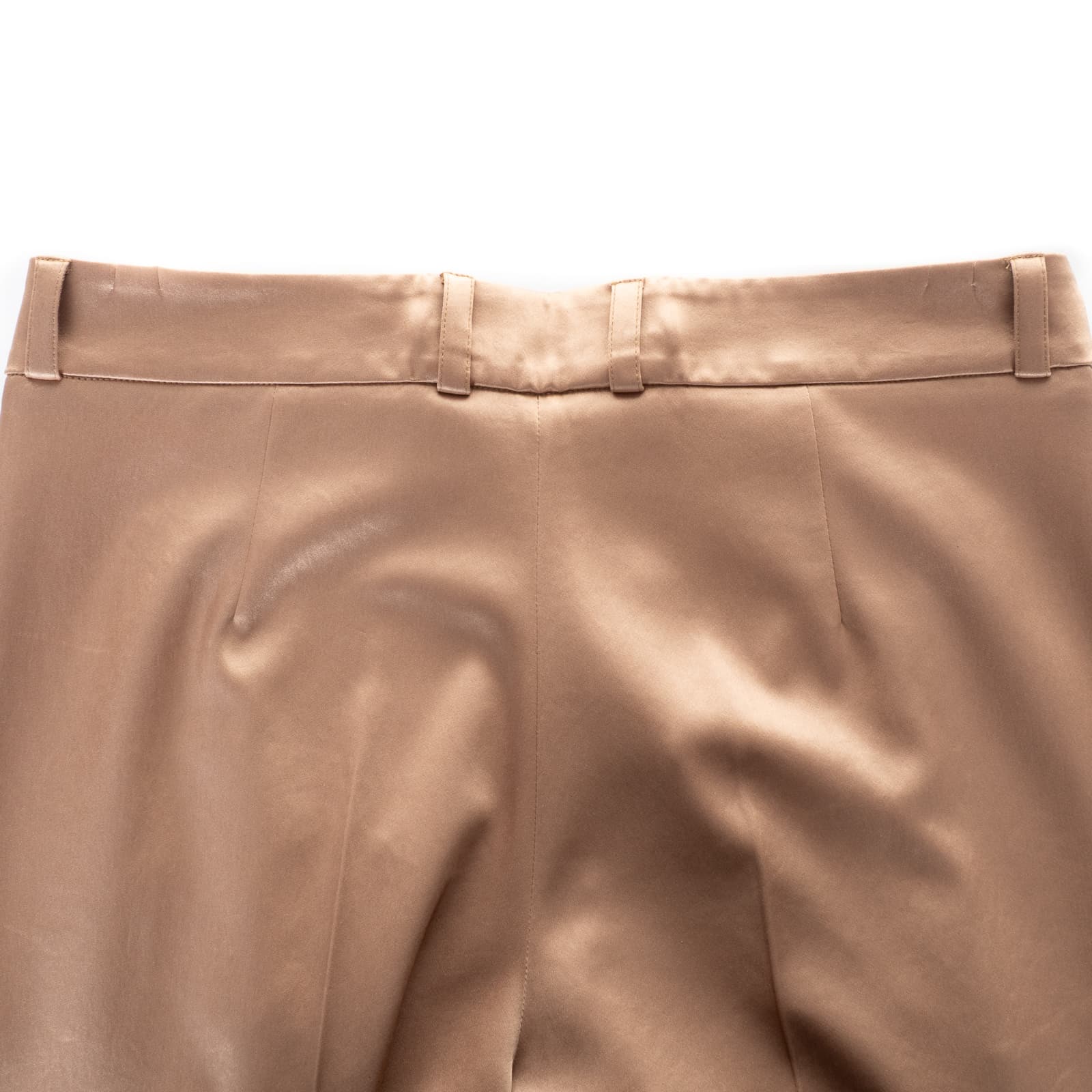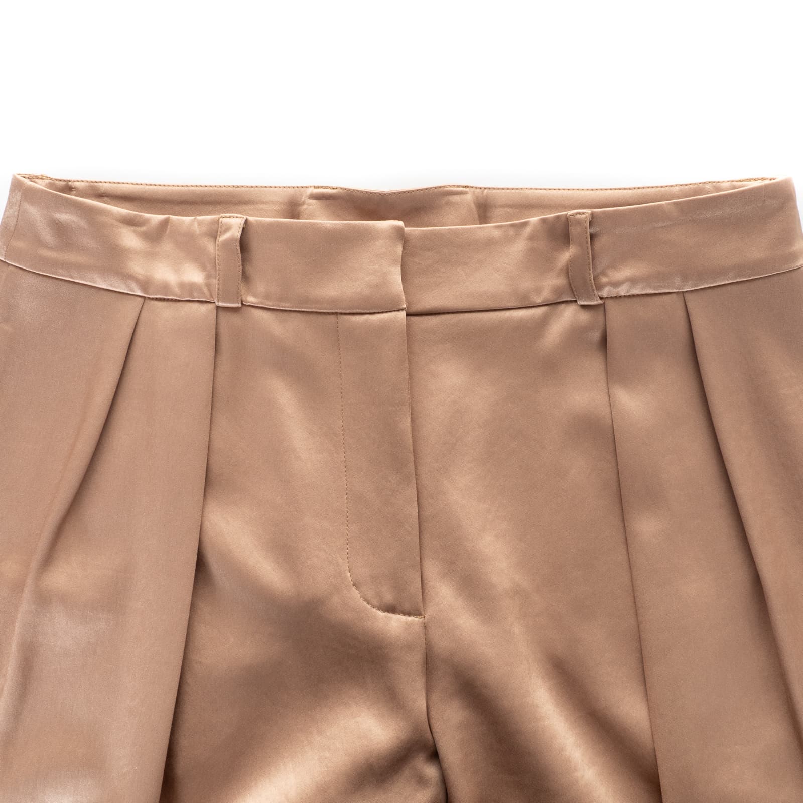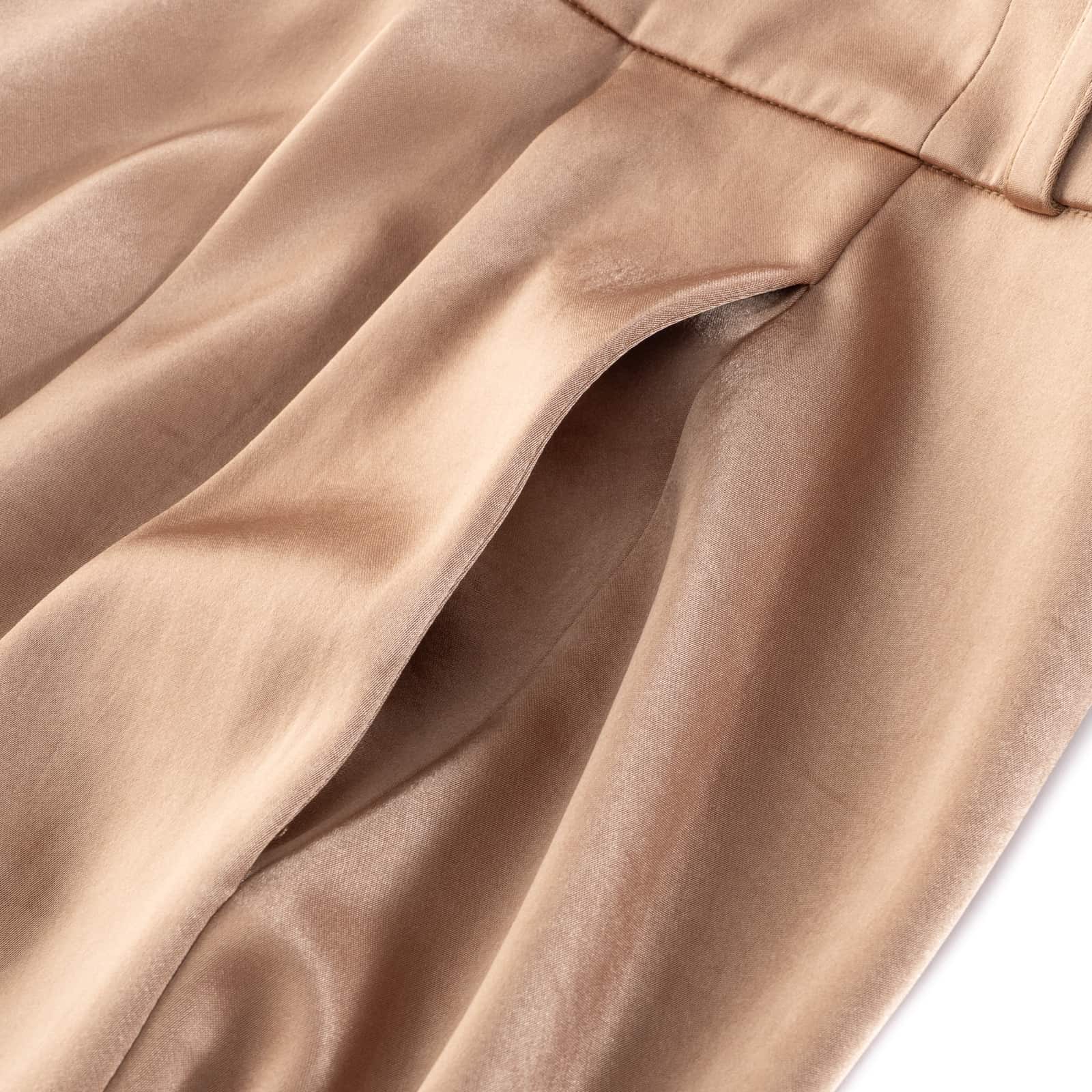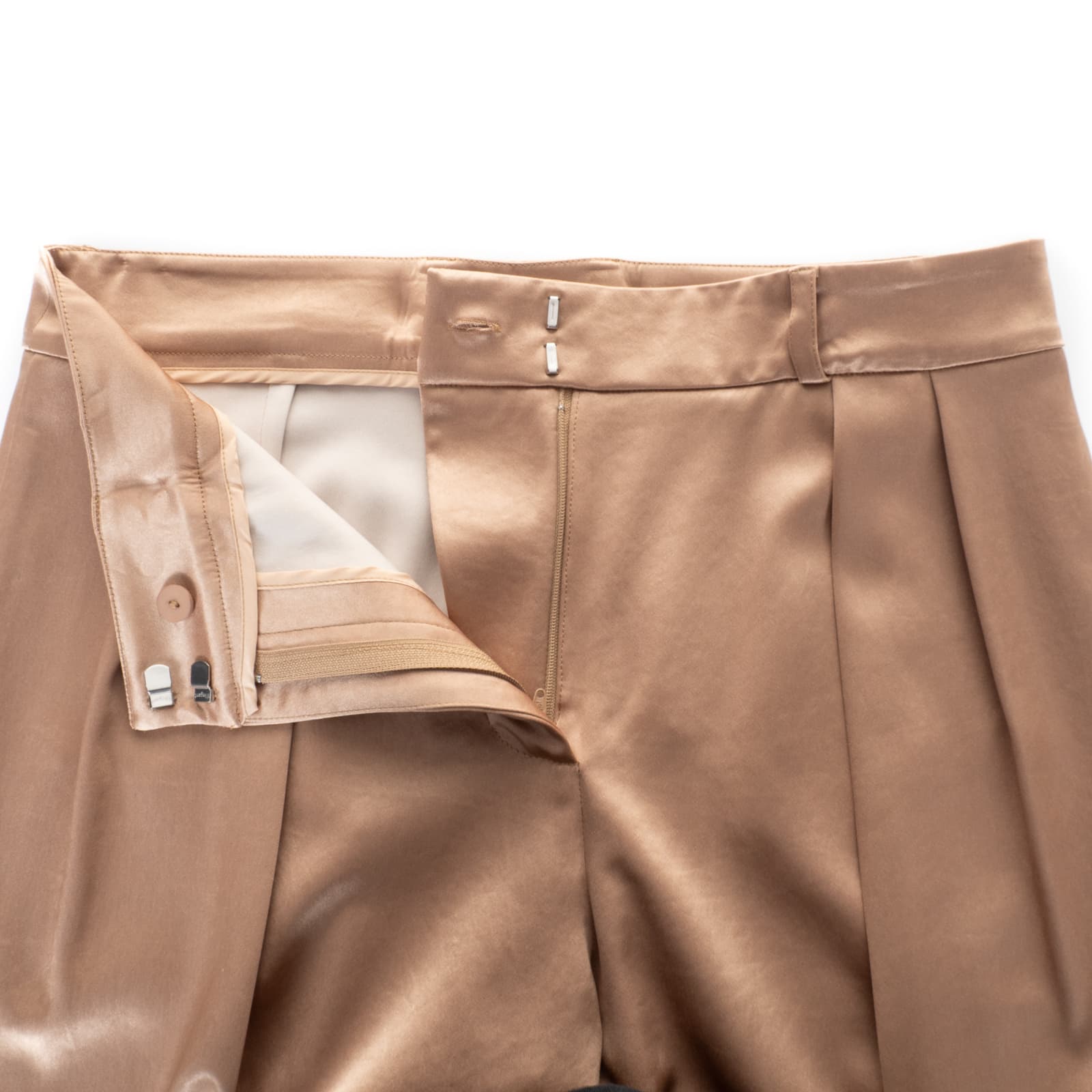 Elegant wide-leg trousers by Liviana Conti in a luxurious gold tone. The satin-like surface gives the piece a refined sheen, while the fluid drape creates a modern and feminine silhouette. Pleated detailing, a classic hook-and-zip fastening, and soft fabric movement underline the sophisticated character. Perfect to pair with the matching blazer or worn as a standout piece on its own.
