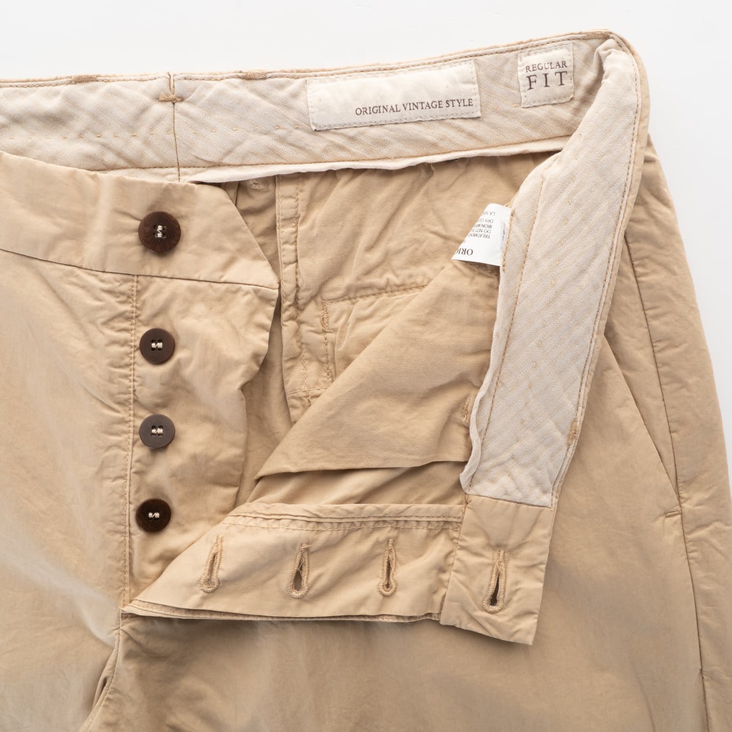 - Waistband with belt loops and button closure