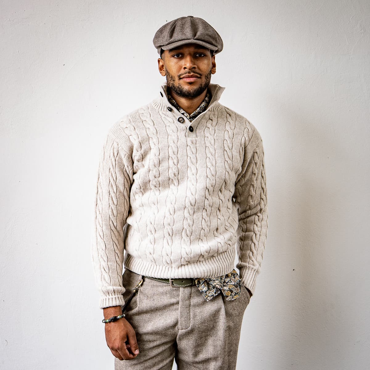 High quality troyer with high collar from William Lockie made from 100% virgin wool (Super Geelong). Geelong wool is the wool from sheep from the Geelong region in Australia, which are known for their high wool quality. Super Geelong is the first shearing of the lambs, which are up to 5 months old. The design is rounded off by the elegant cable knit pattern that adorns the entire troyer.