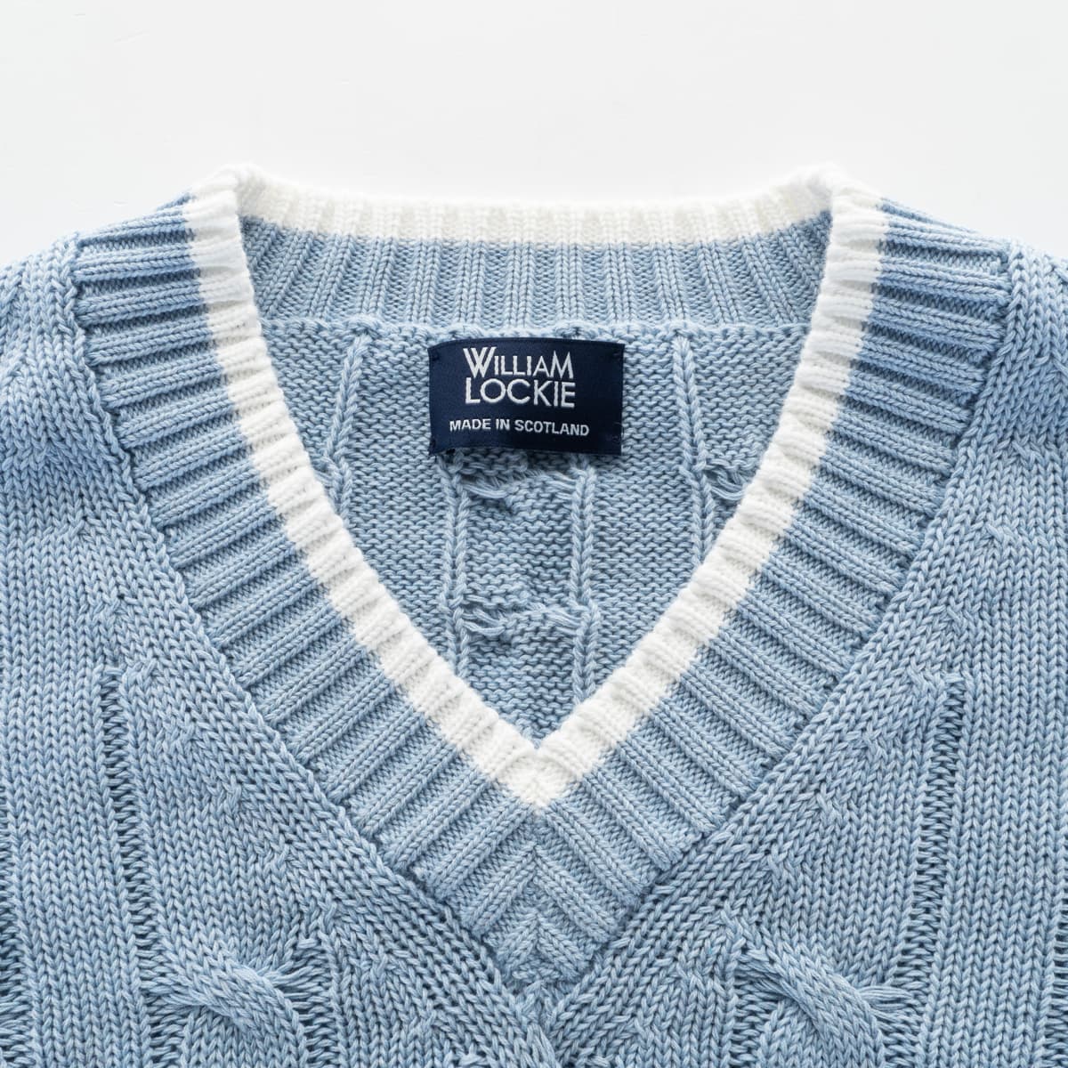 High-quality cricket sweater by William Lockie, made from pure cotton. The classic V-neck with contrasting trim and the traditional cable knit pattern give this style its timeless, sporty-elegant character. The firm yet soft knit quality offers excellent comfort and long-lasting shape retention, making it ideal for everyday wear.
