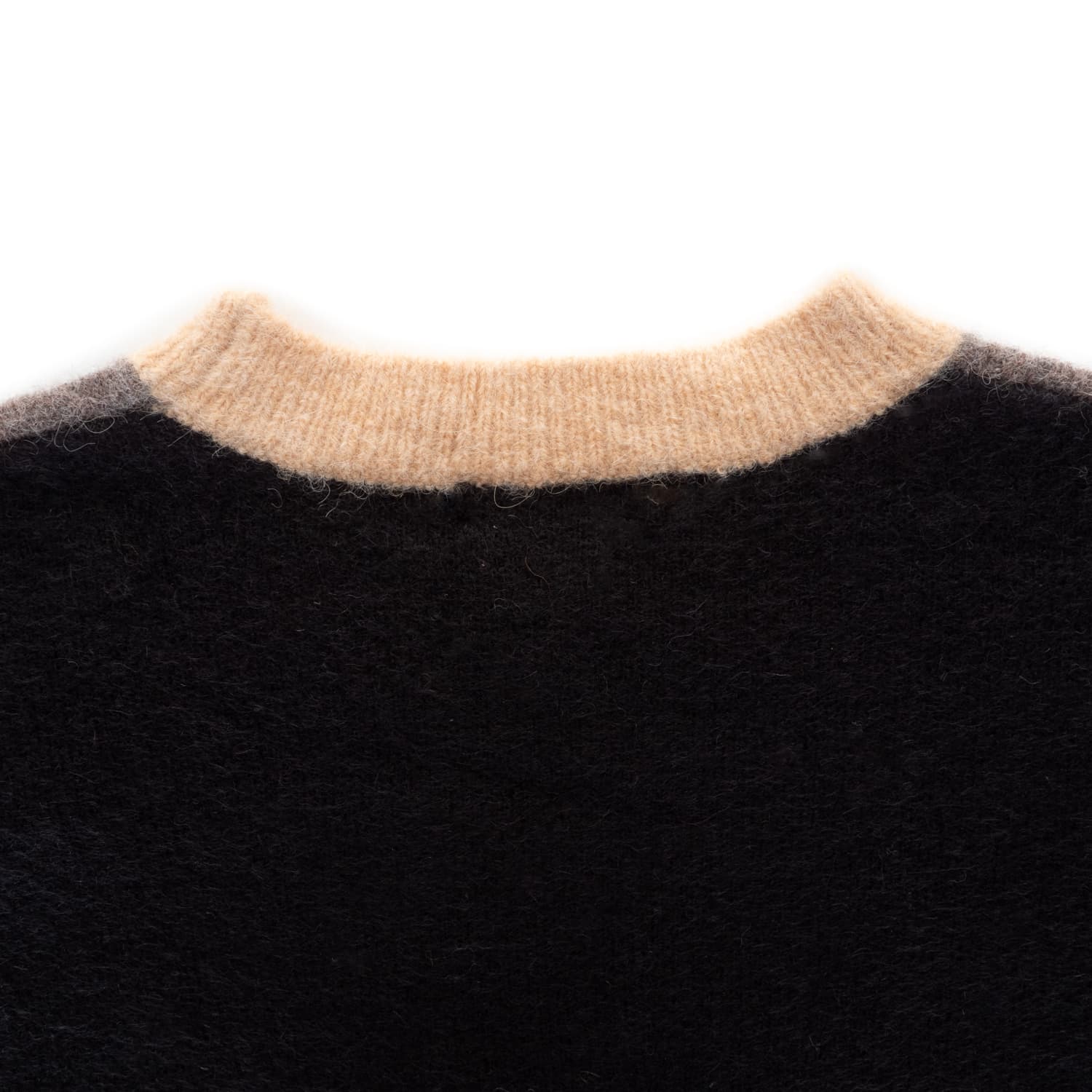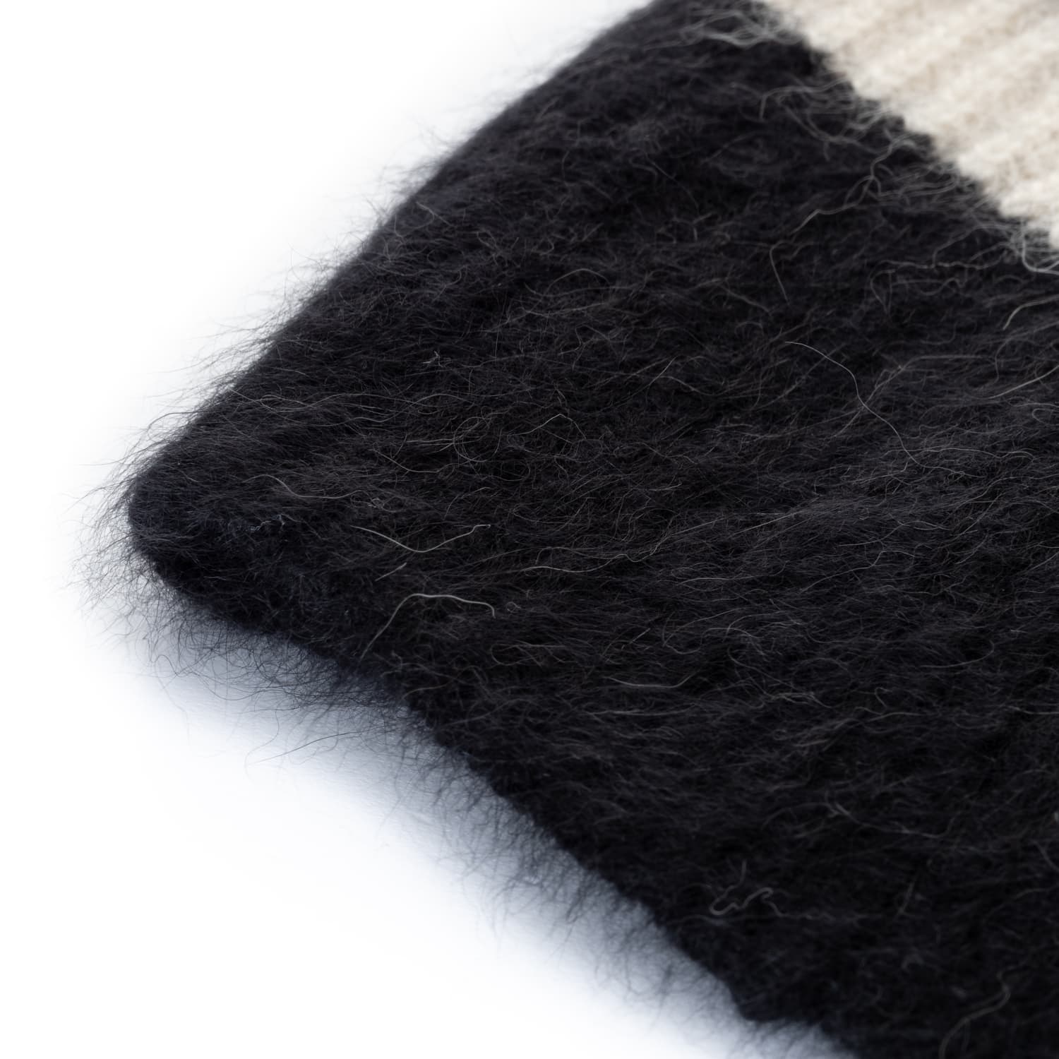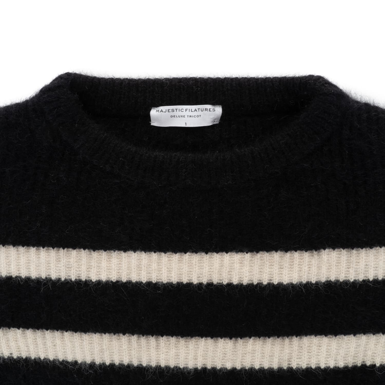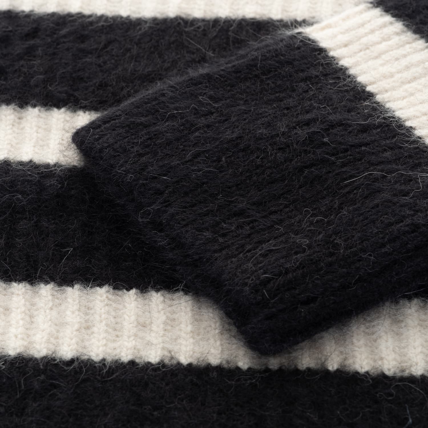 This luxurious knit sweater by Majestic Filatures impresses with its exceptionally fluffy feel and stylish striped design. Crafted from a premium material blend with a high percentage of wool and 40 % fox hair, this sweater offers a wonderfully soft and warm wearing experience. The modern black and natural stripe pattern and the contrasting neckline on the back create a refined look. Made in Portugal, this piece reflects timeless design and artisanal quality.
