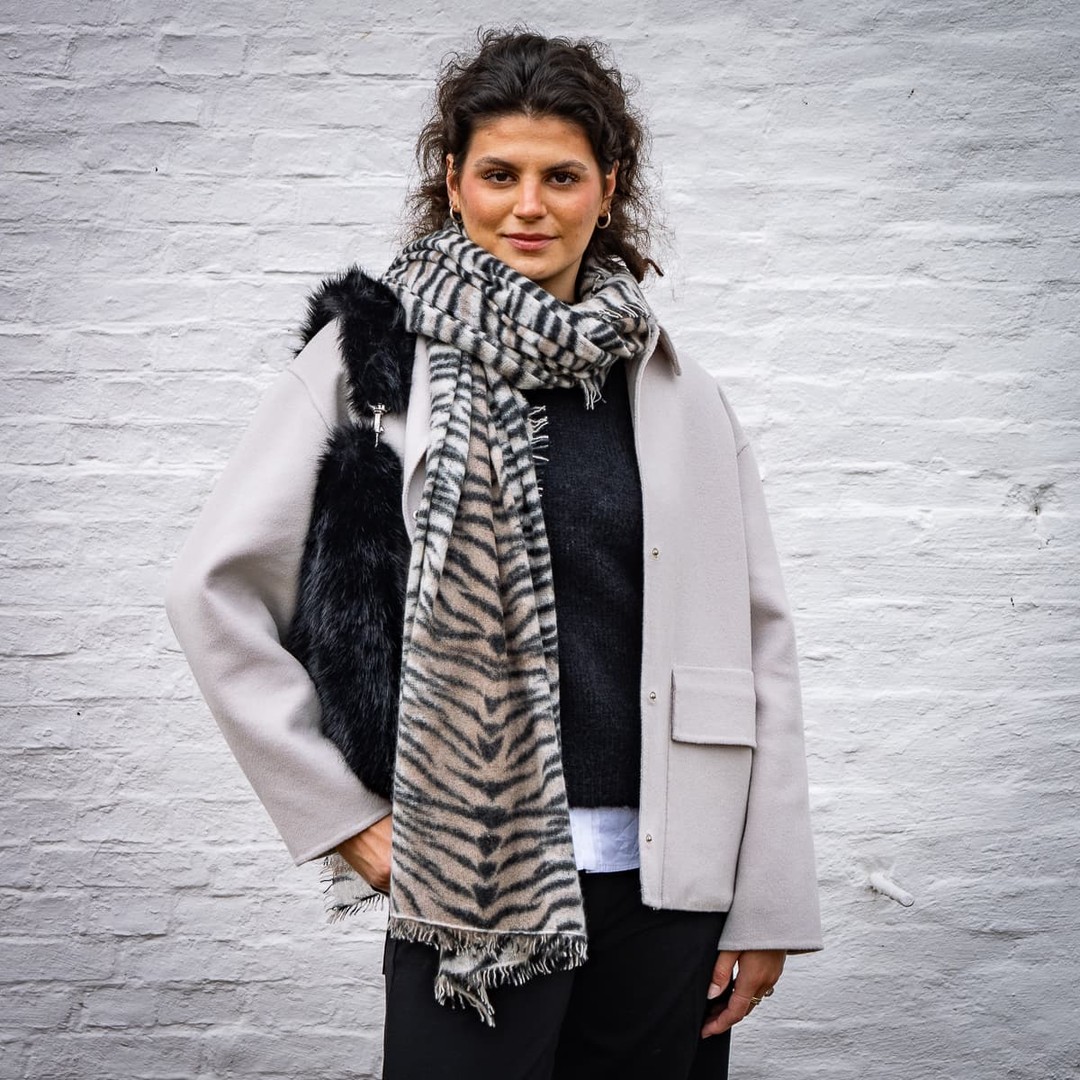 Er zieht sofort alle Blicke auf sich, der "Kaschmirschal Zebra-Muster" von dem deutschen Schal-Label "Bakaree". Hochwertiges Kaschmir Garn, das in der Mongolei, nicht durch das Scheren der Ziegen, sondern durch ein schonendes Kämmverfahren, gewonnen wird. Das dort hergestellte Garn ist handgefertigt und ökozertifiziert. Der edle, mit einem schicken Zebra-Design gefertigte Schal ist an den Enden mit Fransen versehen. Maße: 220 cm x 92 cm.