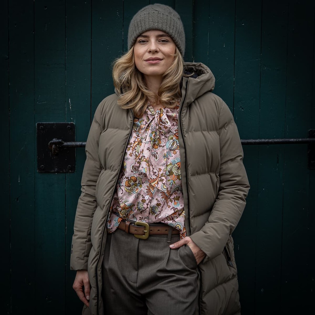 Ultraleicht und lang geschnitten hält dieser Winterparka mit hochwertigen Gänsedaunen auch bei eisigen Temperaturen zuverlässig warm. Kombiniert mit einer Damenbluse aus Baumwolle mit farbenfrohem floralem Allover-Print entsteht ein spannender Kontrast aus Funktion und modischem Ausdruck. Die feminine Schluppe am Kragen setzt einen verspielten Akzent, während das glatte, leichte Gewebe für hohen Tragekomfort sorgt. Ein Look, der Wärme, Leichtigkeit und Farbe mühelos verbindet perfekt für kalte Tage mit Stil.