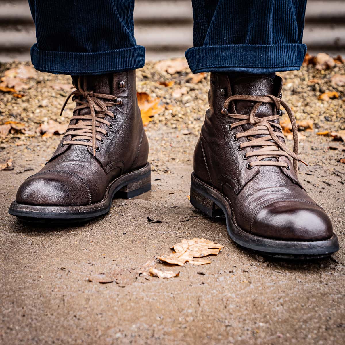 Der Stiefel 51900 überzeugt mit markantem Vintage-Charakter und handwerklicher Tiefe. Aus hochwertigem Kalbsleder gefertigt und im Ganzen gewaschen, zeigt er lebendige Strukturen und feine Farbschattierungen. Cap-Toe-Naht, rustikale 5-Loch-Schnürung mit zusätzlichen Haken und die robuste Vibram-Sohle machen ihn zum verlässlichen Begleiter mit starkem Auftritt.