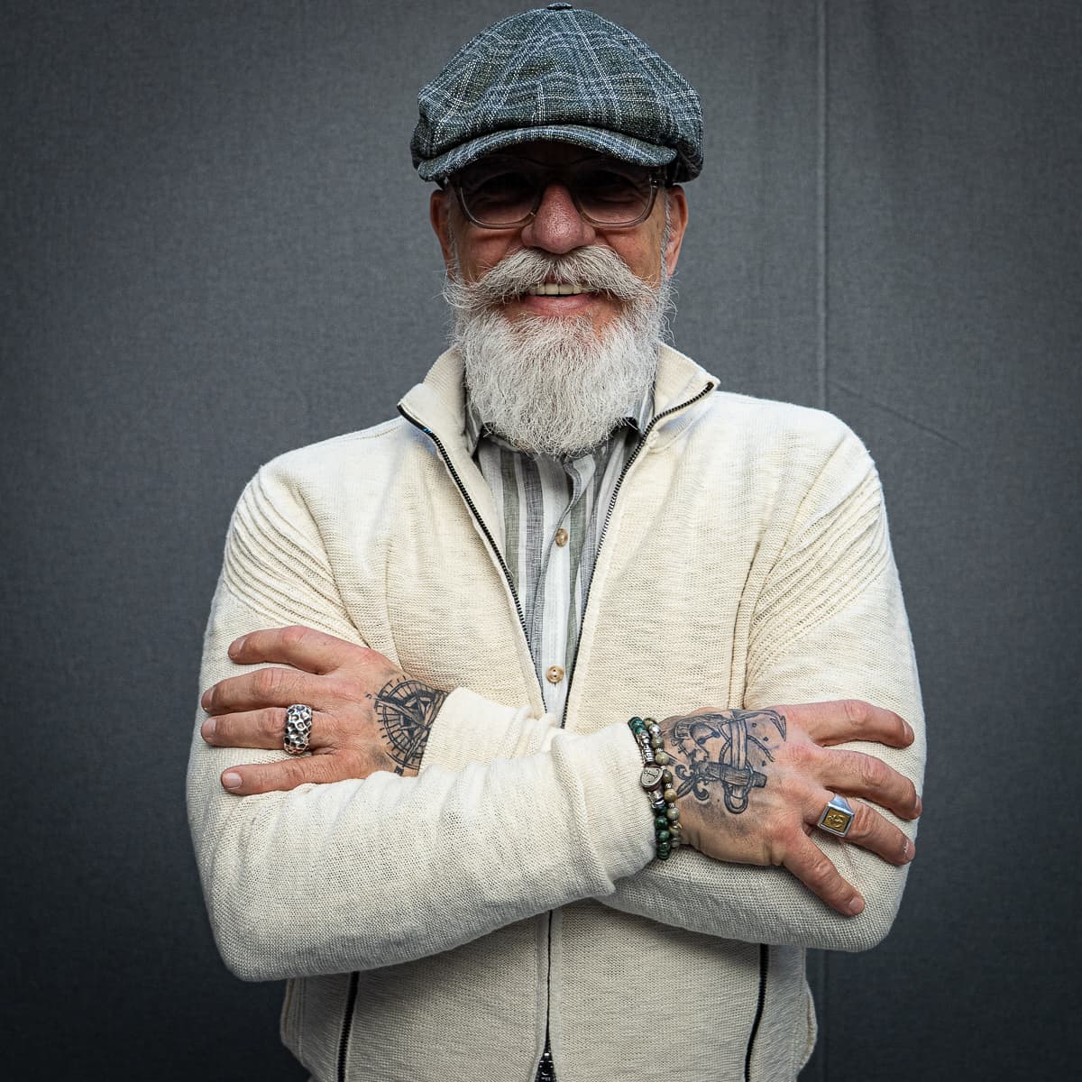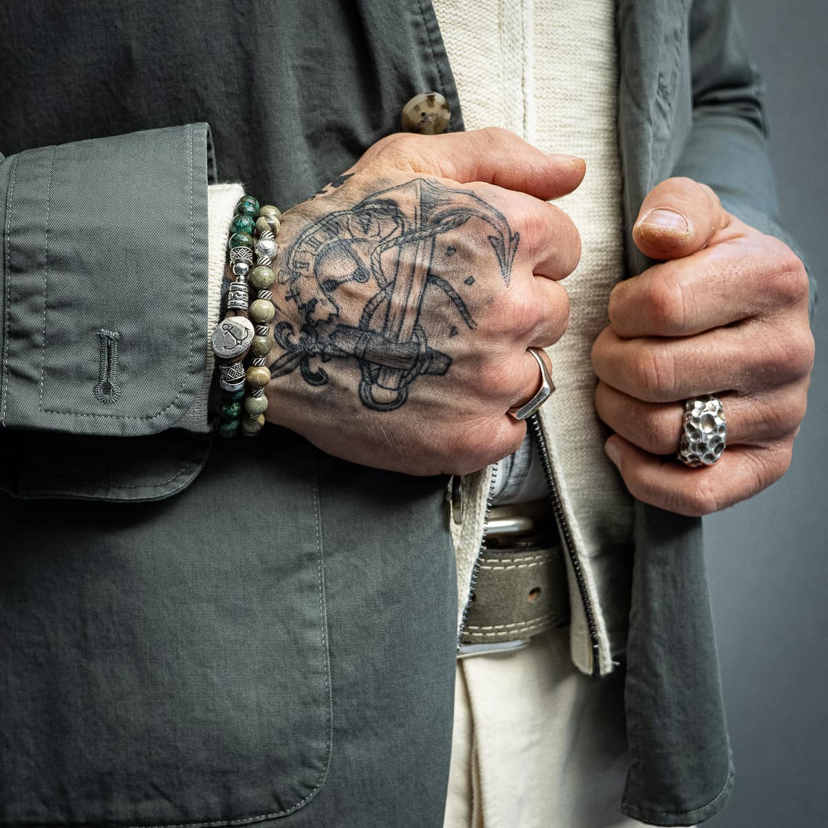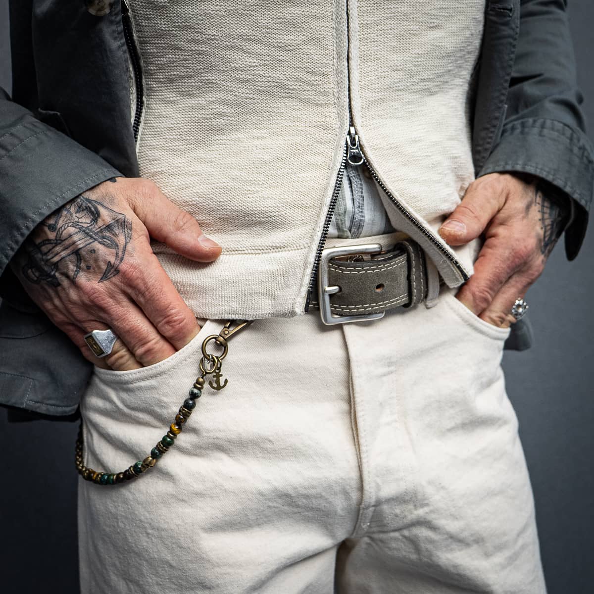The details add the finishing touches – a newsboy cap in a linen-wool blend, a suede belt with contrast stitching, striped socks, bracelets made of natural stones and metal, and a striking wallet chain.